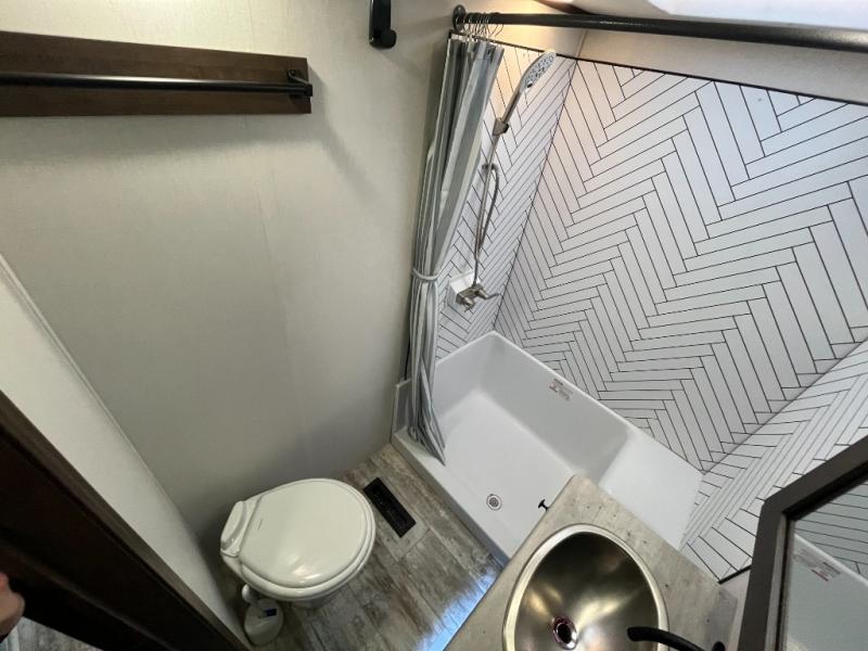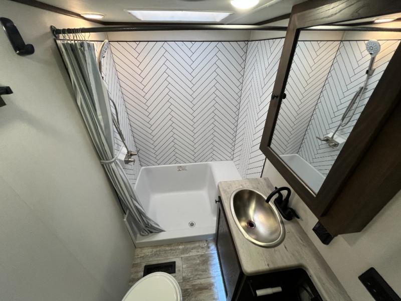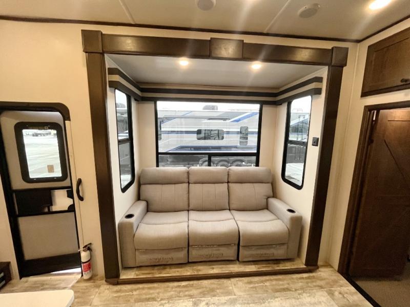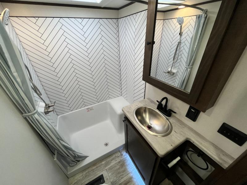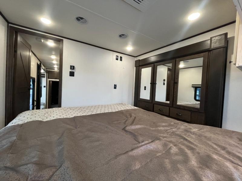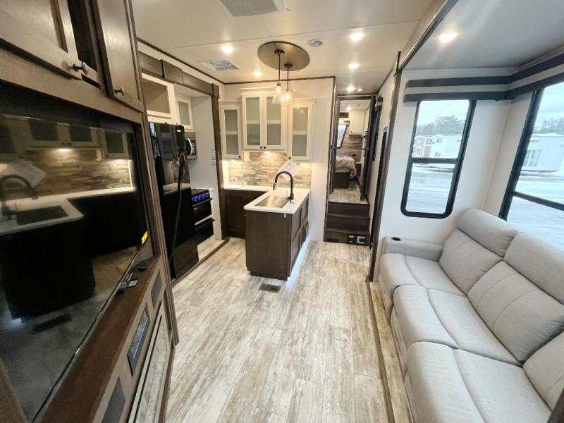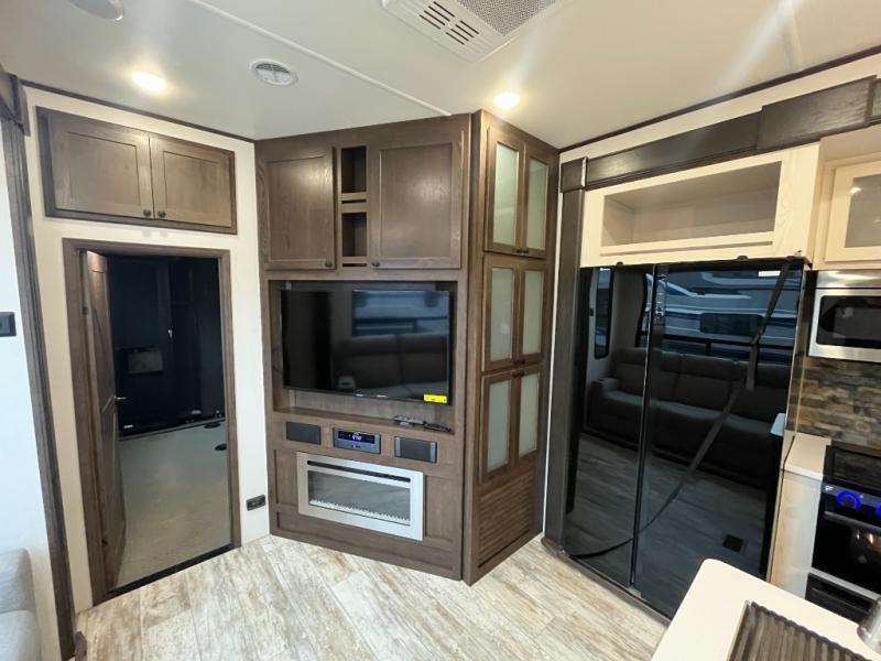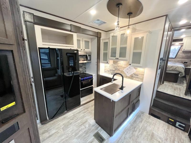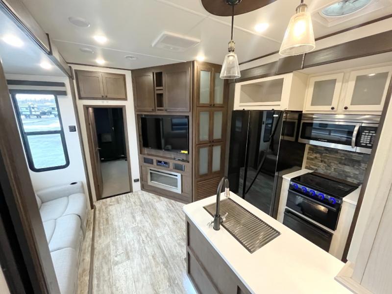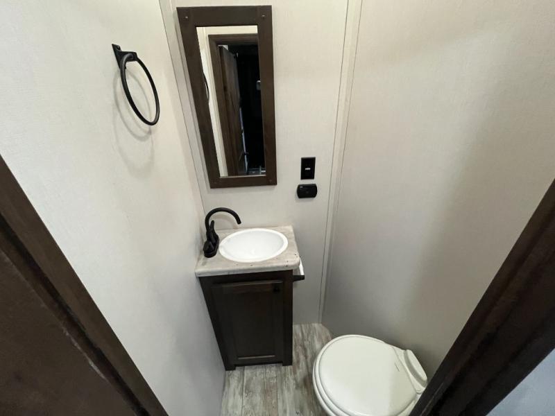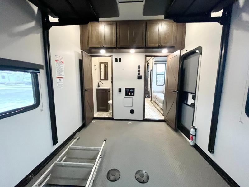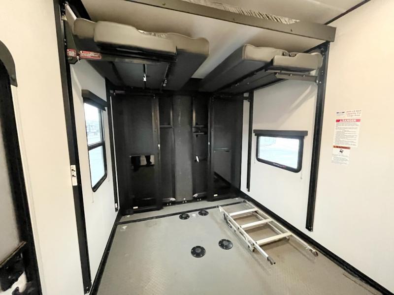 Everyone will enjoy the main living and kitchen area with a 50" TV and electric fireplace after a long day on the trails! You can relax on the sofa slide out while others take turns getting cleaned up in the full bathroom next to the front private bedroom with a king-size bed, and wardrobe slide out, or some might just need to wash their face and hands in the half bath off of the garage. The cook will love the kitchen with a peninsula countertop including a grate style sink with a cover/drying rack, plus the slide out with appliances. The garage offers 11' of cargo space, plus an electric bed with dual sofas and tables giving the kids their own space after the toys are unloaded.
