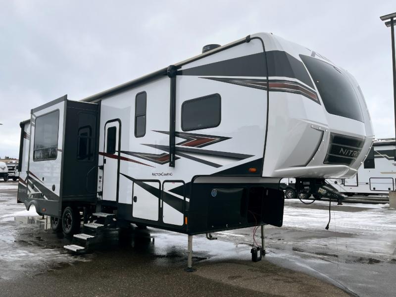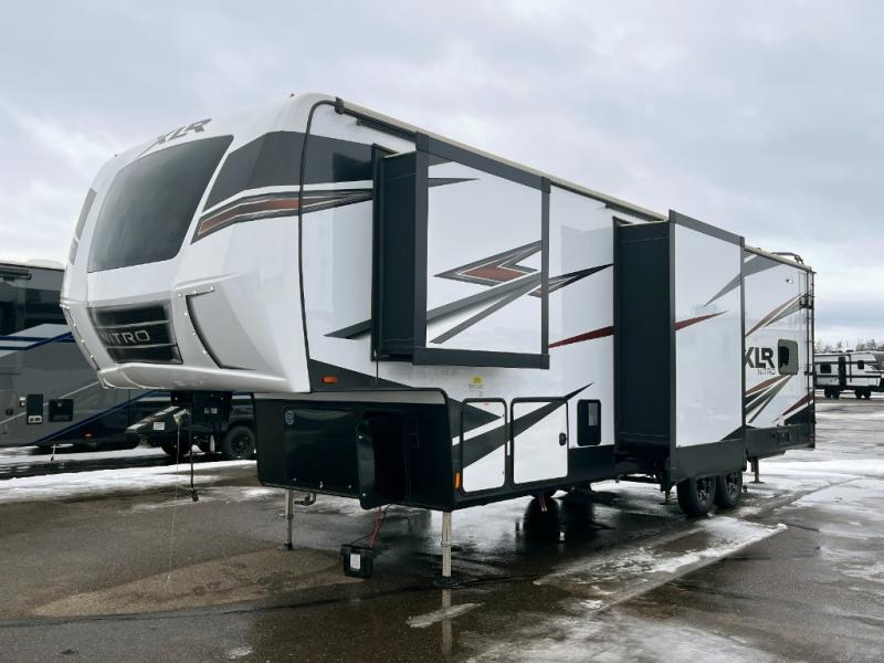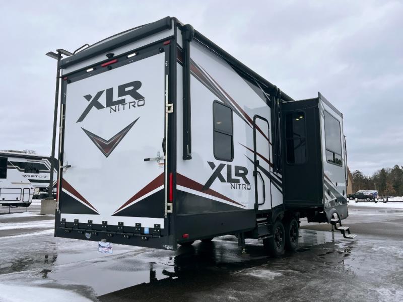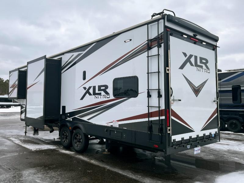 With any XLR Nitro toy hauler fifth wheel by Forest River, you can load your toys up the weatherproof insulated ramp door onto an insulated garage floor with 5,000 lb. cargo tie downs to secure your toys while traveling. The retractable panoramic screen will allow fresh air to flow inside and the 30 gallon fuel station will keep the fun going! Each is built with Xtra engineering which means a stronger platform to handle the adverse conditions of Mother Nature on extreme terrain, a radius roof for more interior space, vacuum-boned aluminum framed sidewalls, laminated and insulated slide room walls, plus a fiberglass front cap with an automotive windshield for a sleek exterior and great views from the interior. There are hardwood cabinet doors, black cabinet hardware, solid surface kitchen countertops, and living area dimmable lighting to mention a few more highlights. Start exploring your active side, choose a XLR Nitro today!