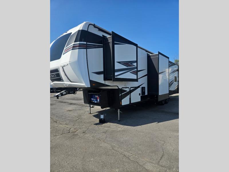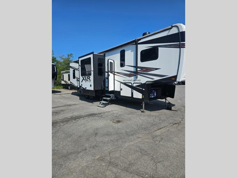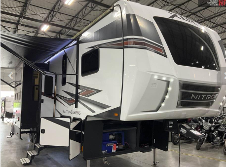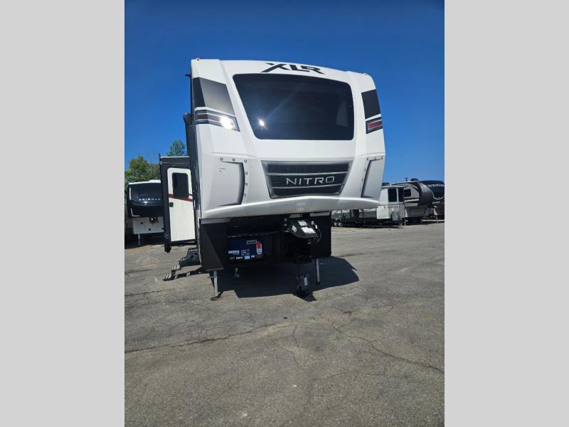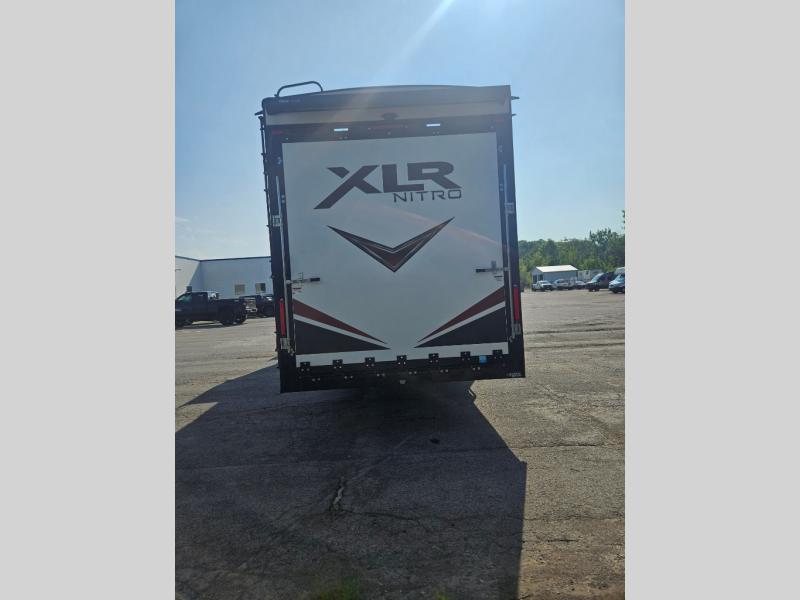 With any XLR Nitro toy hauler fifth wheel by Forest River, you can load your toys up the weatherproof insulated ramp door onto an insulated garage floor with 5,000 lb. cargo tie downs to secure your toys while traveling. The retractable panoramic screen will allow fresh air to flow inside and the 30 gallon fuel station will keep the fun going! Each is built with Xtra engineering which means a stronger platform to handle the adverse conditions of Mother Nature on extreme terrain, a radius roof for more interior space, vacuum-boned aluminum framed sidewalls, laminated and insulated slide room walls, plus a fiberglass front cap with an automotive windshield for a sleek exterior and great views from the interior. There are hardwood cabinet doors, black cabinet hardware, solid surface kitchen countertops, and living area dimmable lighting to mention a few more highlights. Start exploring your active side, choose a XLR Nitro today!