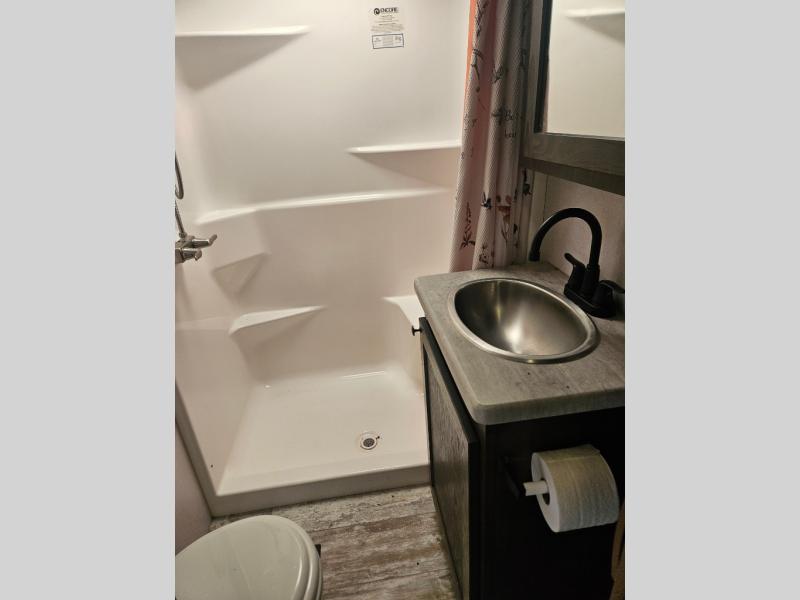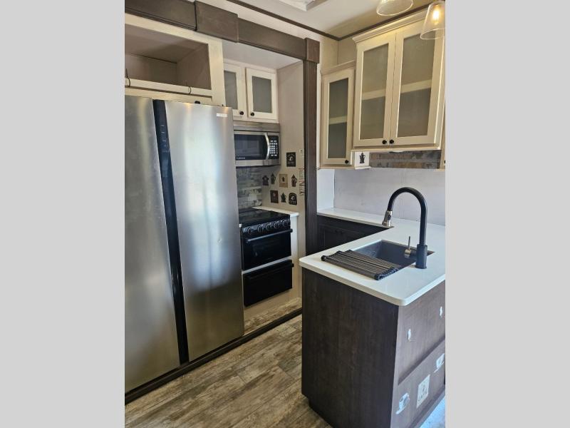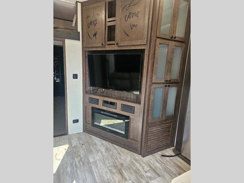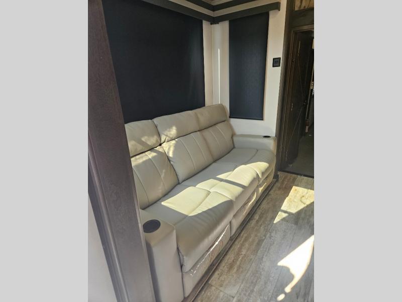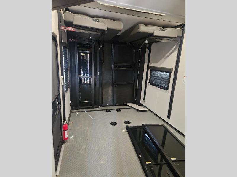 Whether it is the separate garage, the separate living and kitchen area or the front private bedroom that makes you want this fifth wheel, you will enjoy a spacious interior with triple slide outs! The 14' garage allows you to secure your toys while traveling to the destination then this space becomes a place to relax, dine and sleep for your kids or your friends. There is a side man door, an electric bed with sofas and tables below, storage for your gear, and a half bath for convenience. The main living and kitchen area offers a loft for more sleeping space, an electric fireplace and a 50" TV, plus a larger sofa and kitchen amenities to feed the crew. And the full bathroom is in the hallway next to the bedroom.