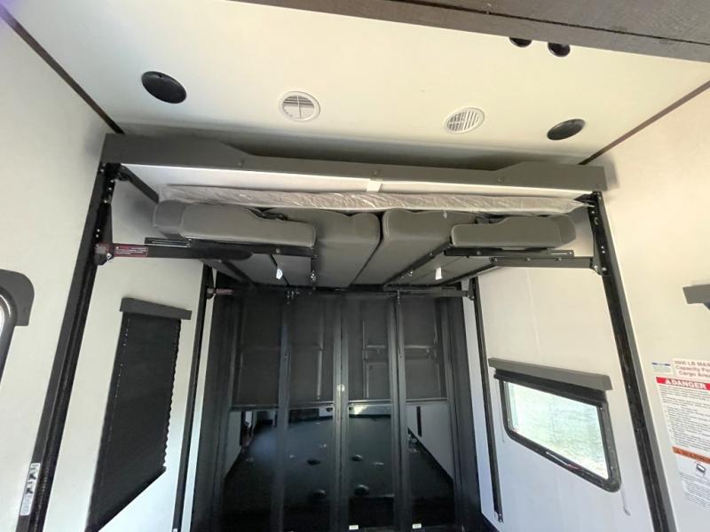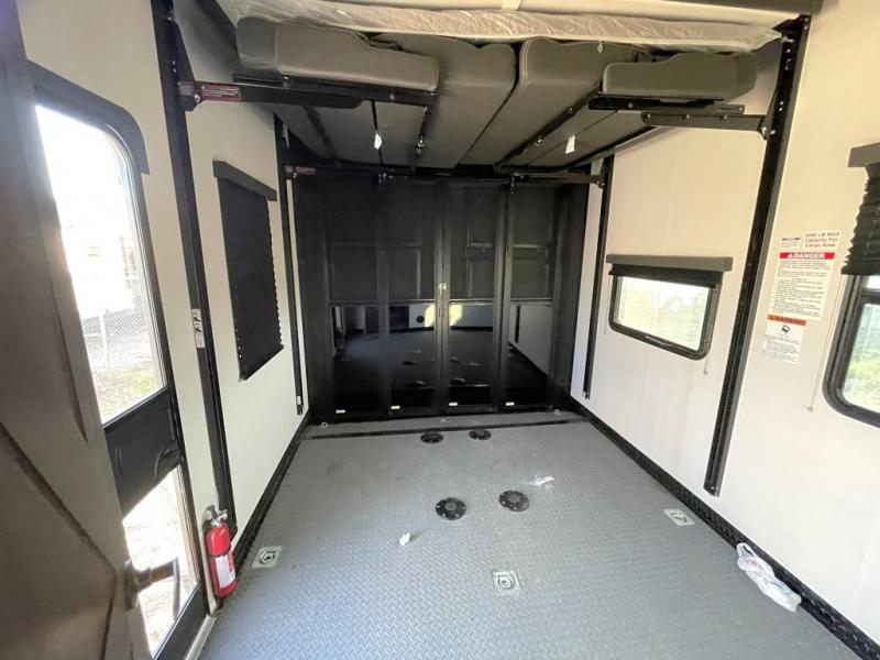 Kids or guests get their own dedicated hangout with an electric queen bed, dual sofas with tables, a side entry door, and heavy-duty tie-downs for hauling gear securely.