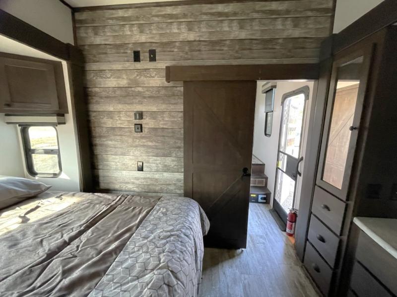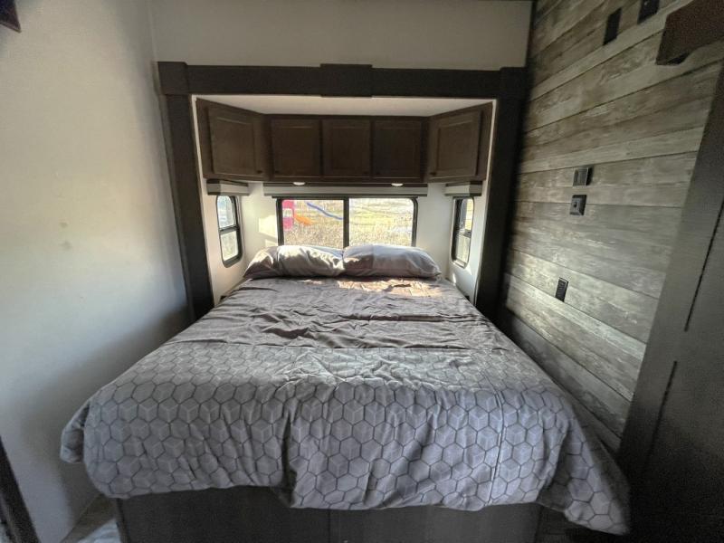 Dual slideouts create a roomy private bedroom with a queen-size bed, generous storage, and direct access to the bathroom.
