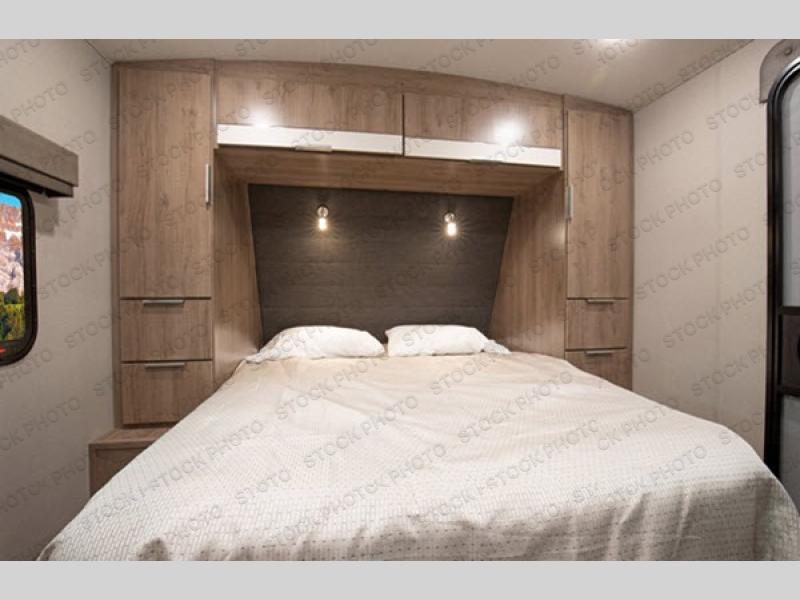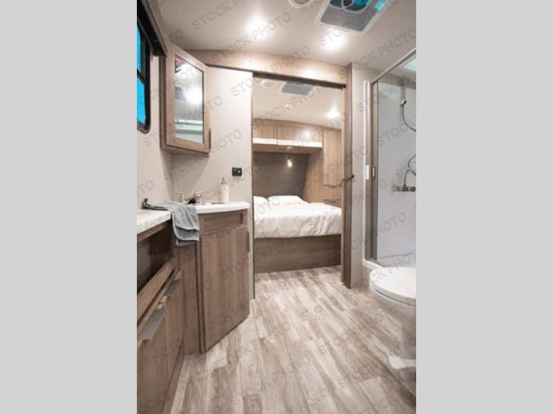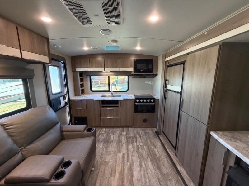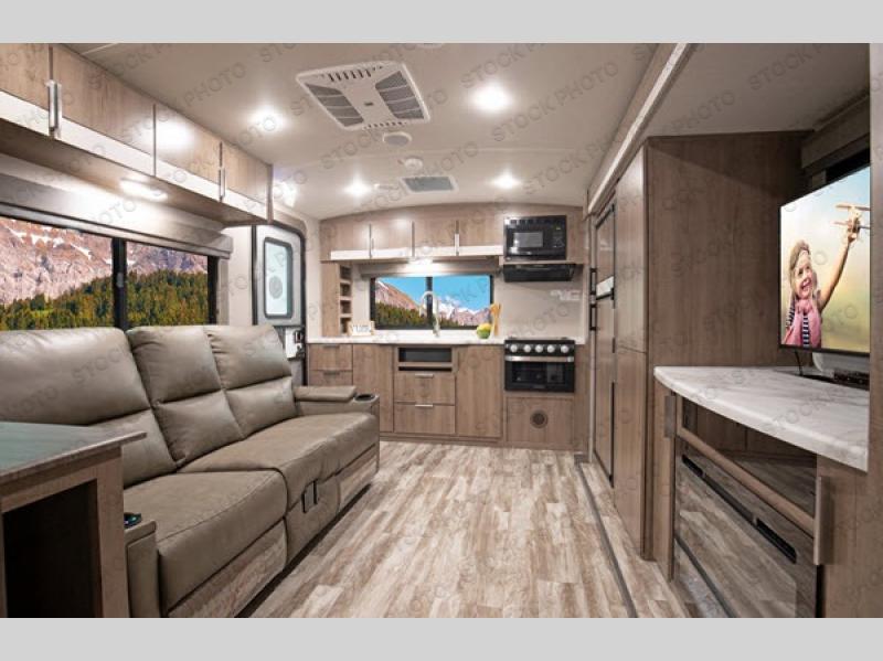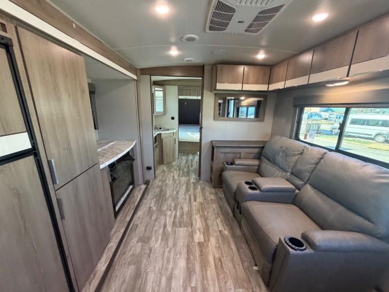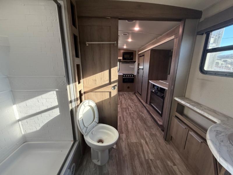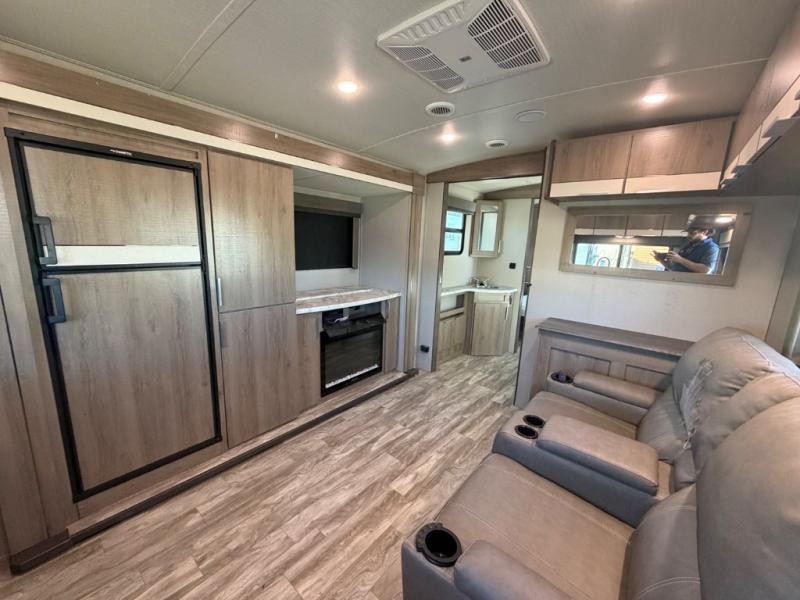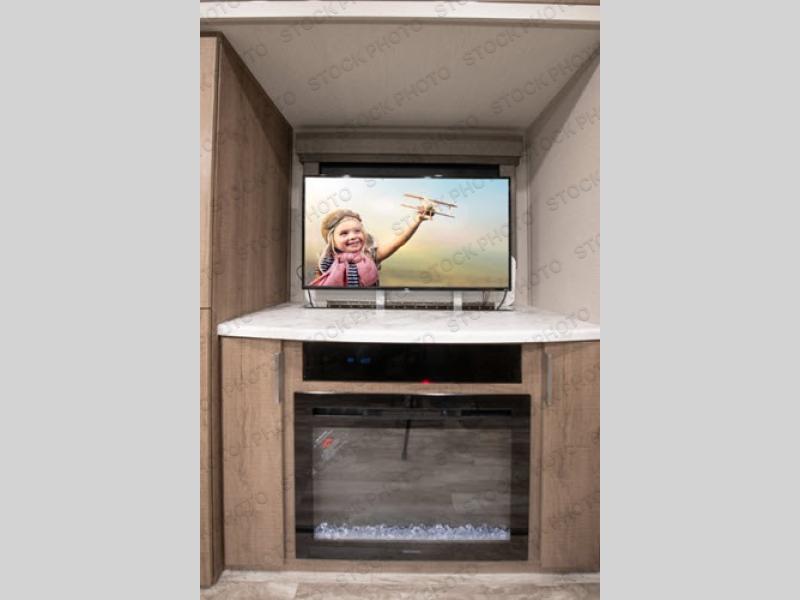 Enjoy your time with your spouse in this trailer that includes a master suite with a walk-around queen bed, dual wardrobes, a second exterior entry, and a sliding interior door for privacy. You can enter the walk-through bathroom through the bedroom or the main living and kitchen area after taking a shower with a skylight, and brushing your teeth by the sink with lots of counter space and storage for your toiletries. You can then relax at the dinette with reversible dinette cushions while watching the 40" telescoping TV or make a warm meal in the rear kitchen with a window for a great view. You might even like to add the optional theater dinette, the choice is yours. And the fireplace is another cozy feature within this combined living and kitchen area.