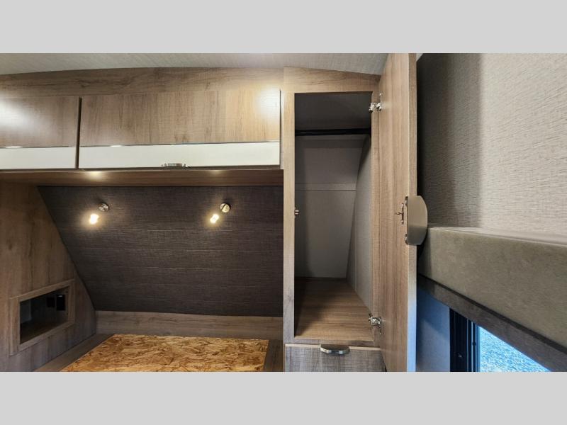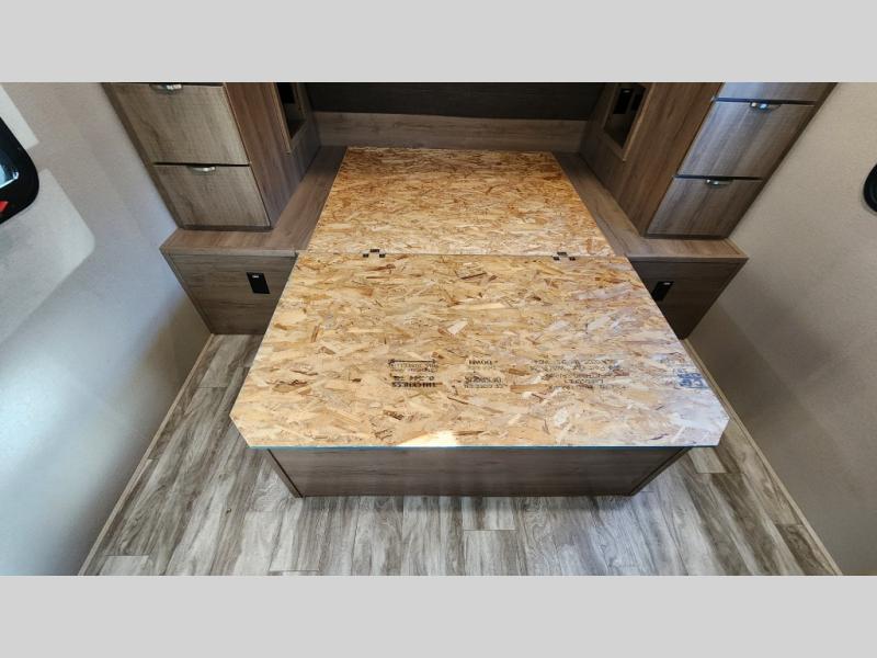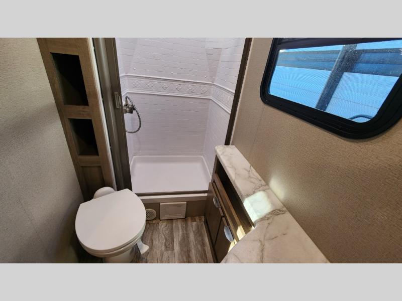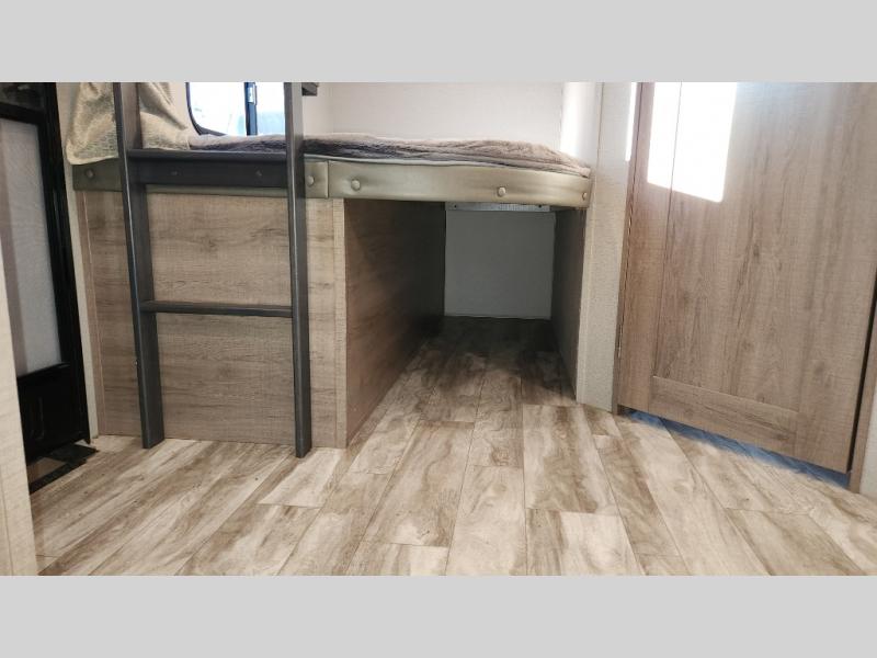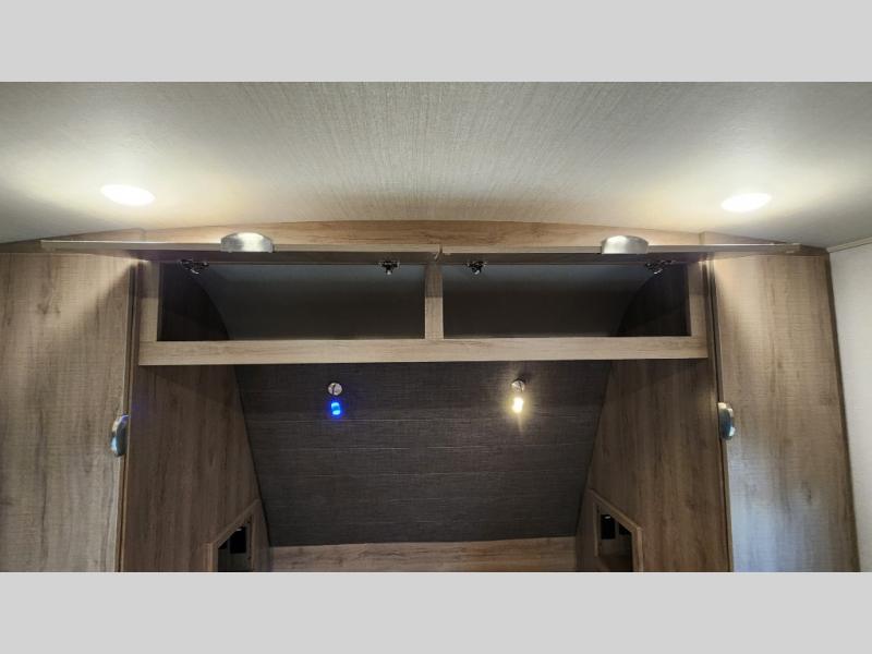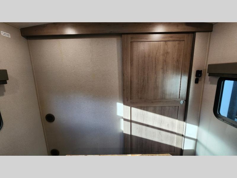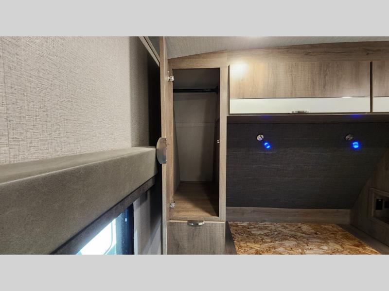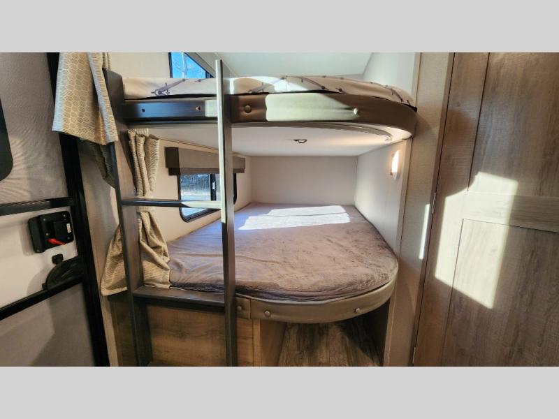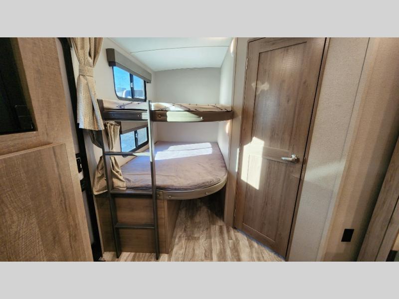 The 2400BH features double-over-double bunk beds, a private front bedroom with queen bed, and a convertible U-shaped dinette, giving everyone room to sleep, relax, and play. Modern décor, panoramic windows, and open-concept design make the interior bright, airy, and welcoming—like home, wherever you park.