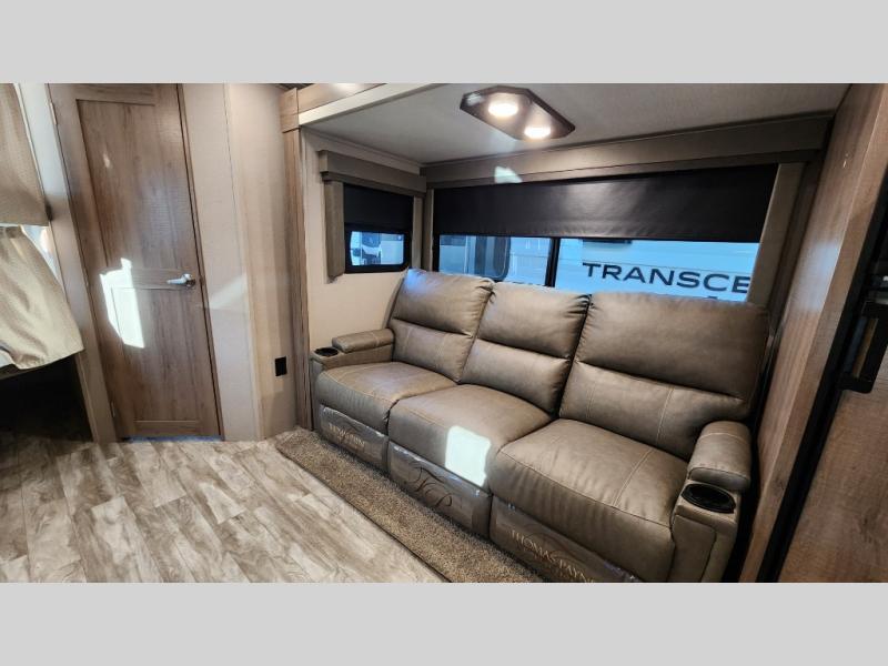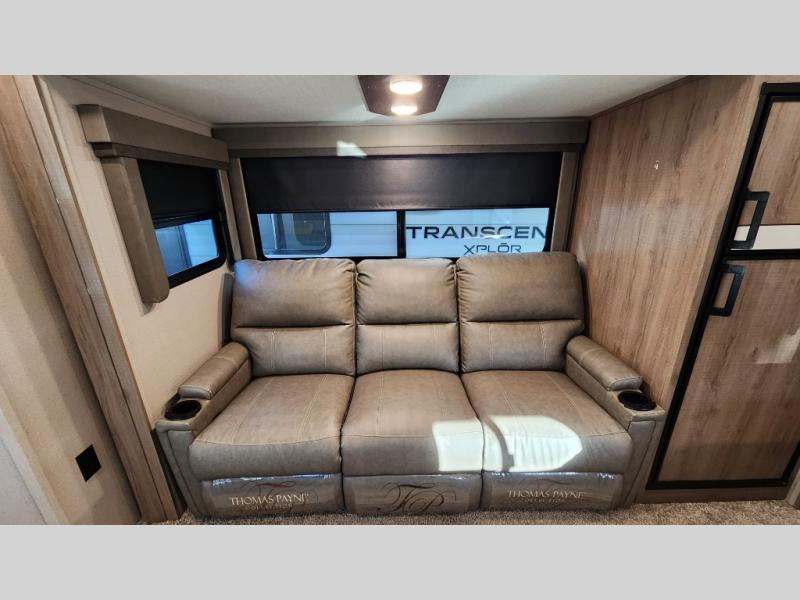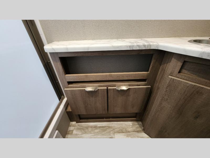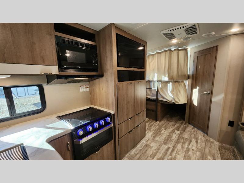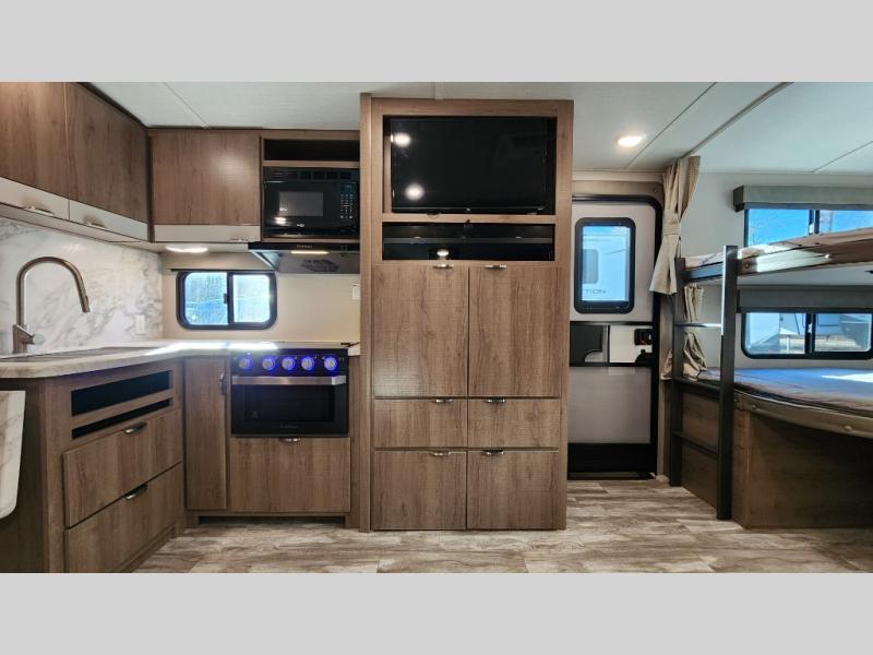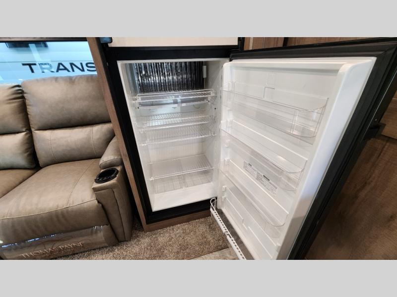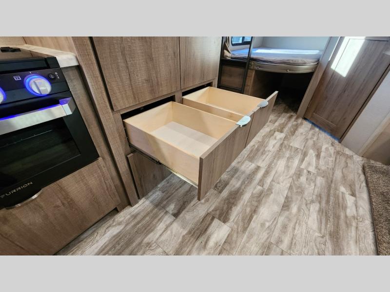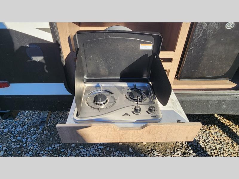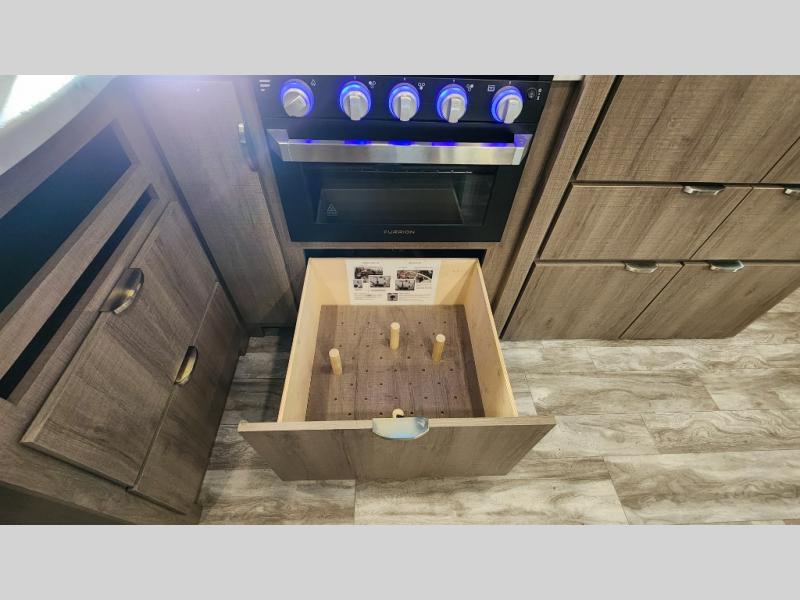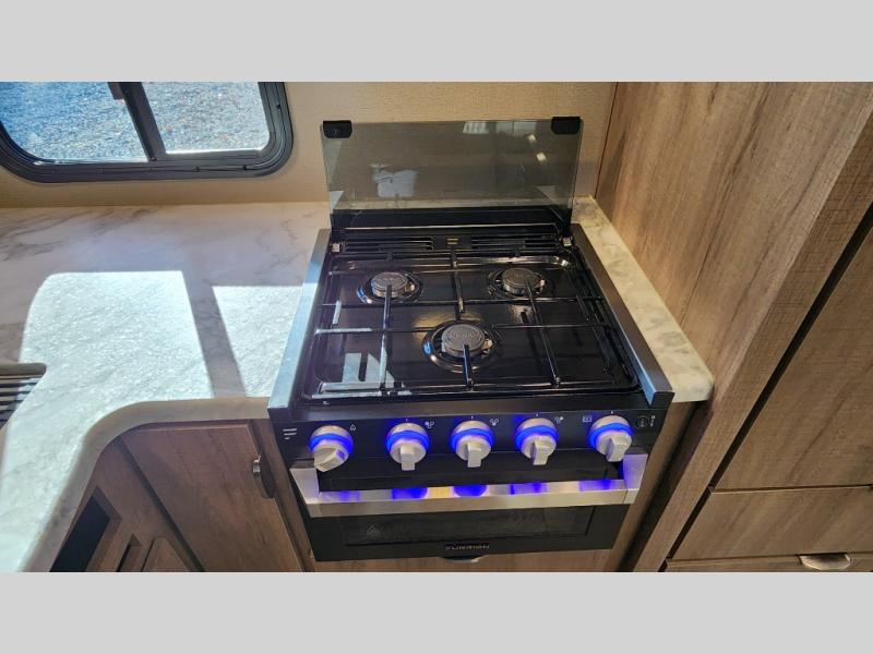 Cook your favorite meals on the go with a three-burner range, oven, microwave, refrigerator, and plenty of counter space. Outside, enjoy the outdoor kitchen with a cooktop and mini fridge—perfect for grilling under the power awning.