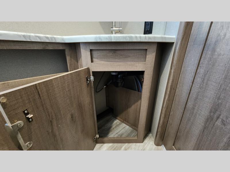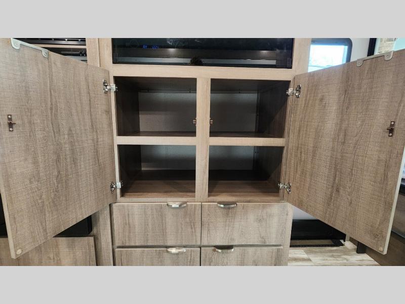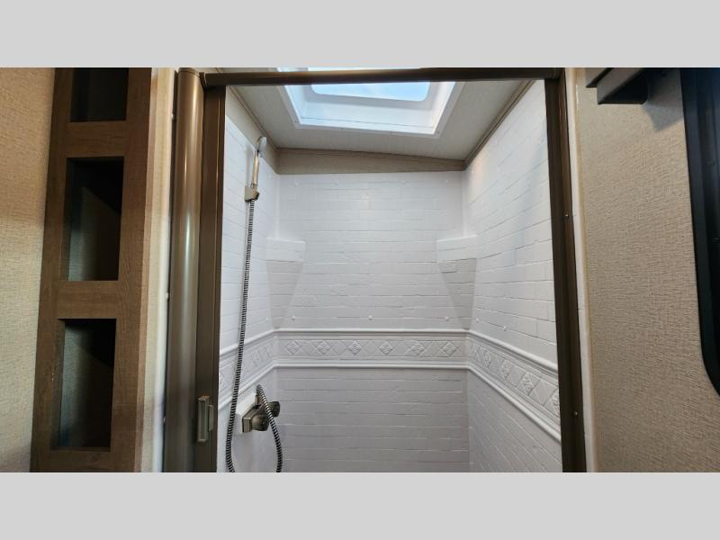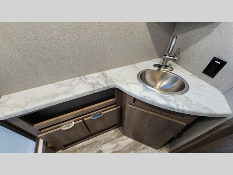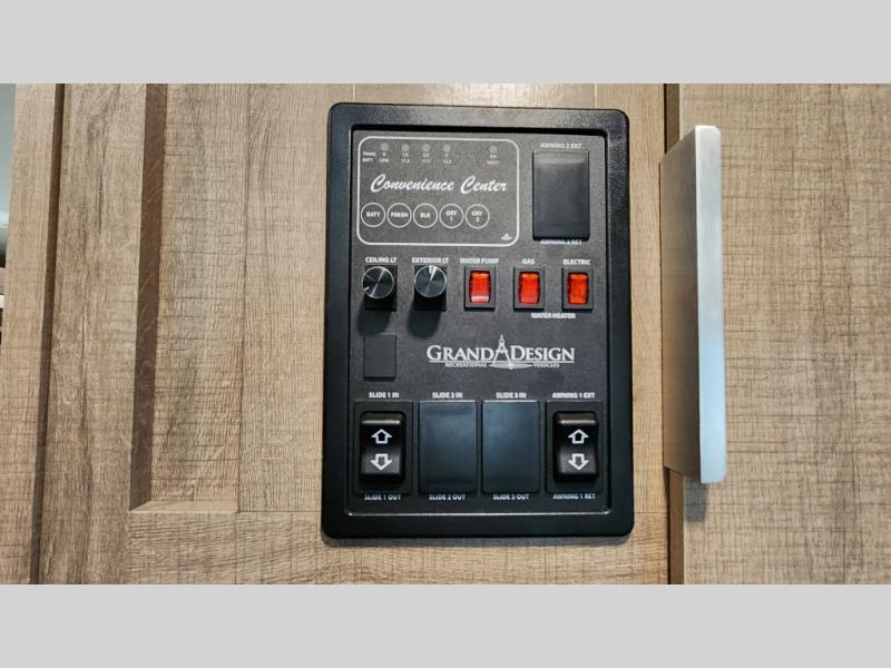 Ducted air conditioning, efficient heating, and a spacious rear bathroom with shower, vanity, and storage make camping effortless. Pass-through exterior storage keeps gear organized and accessible. Grand Design’s premium construction ensures durability, quiet rides, and year-round comfort.