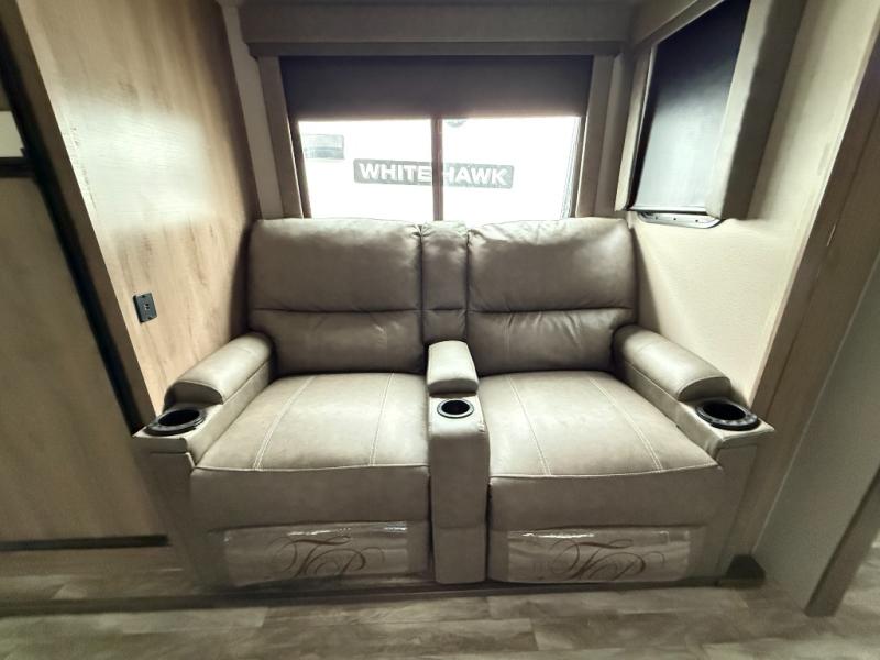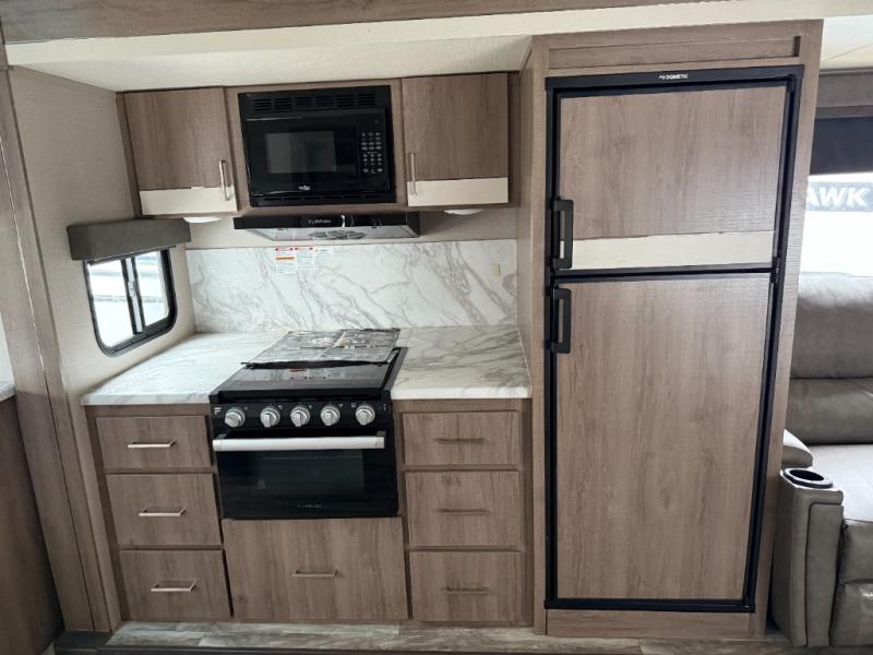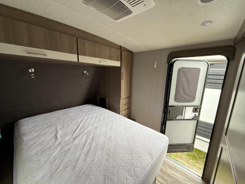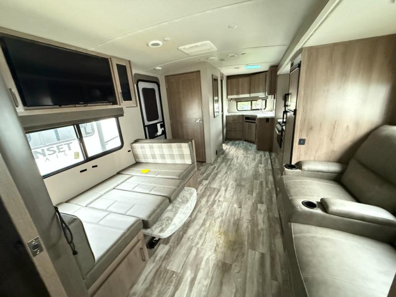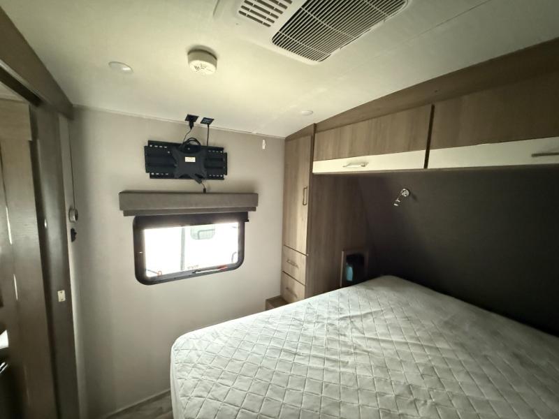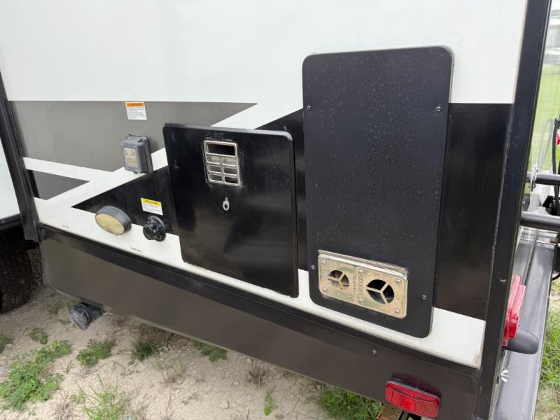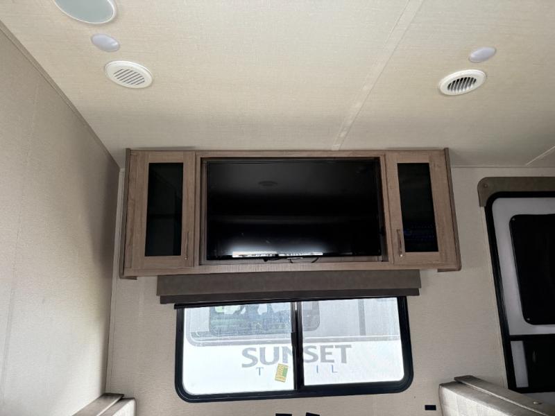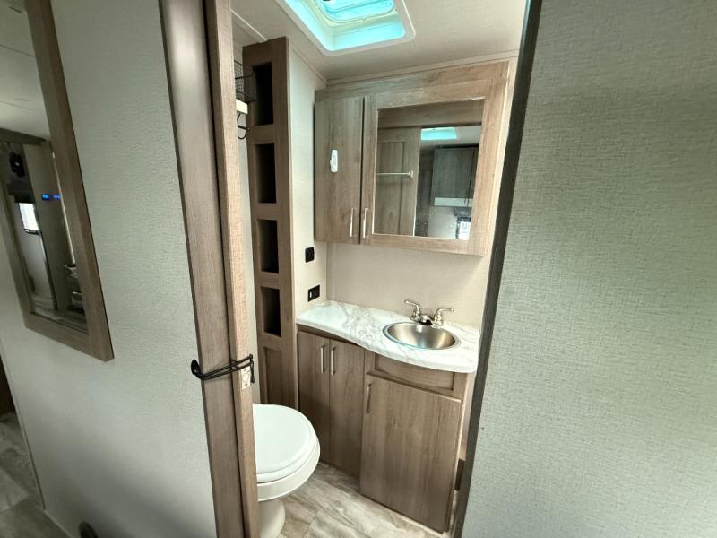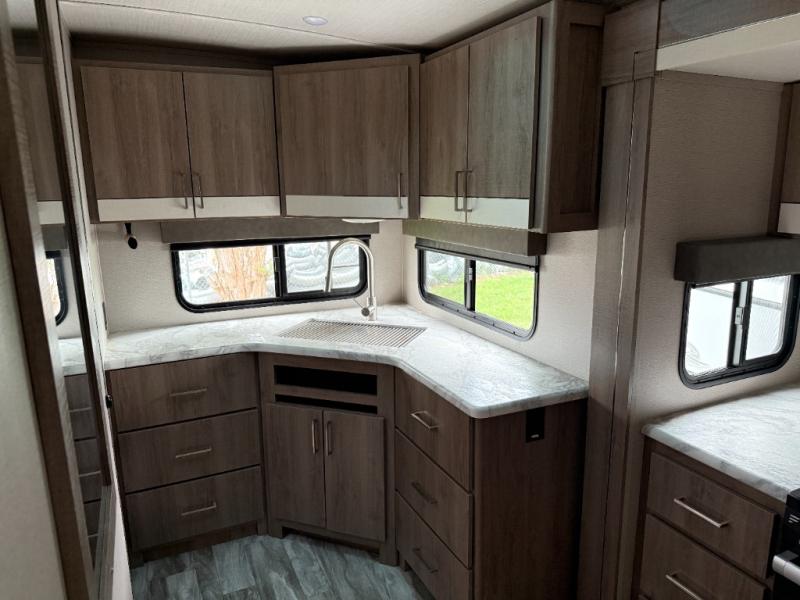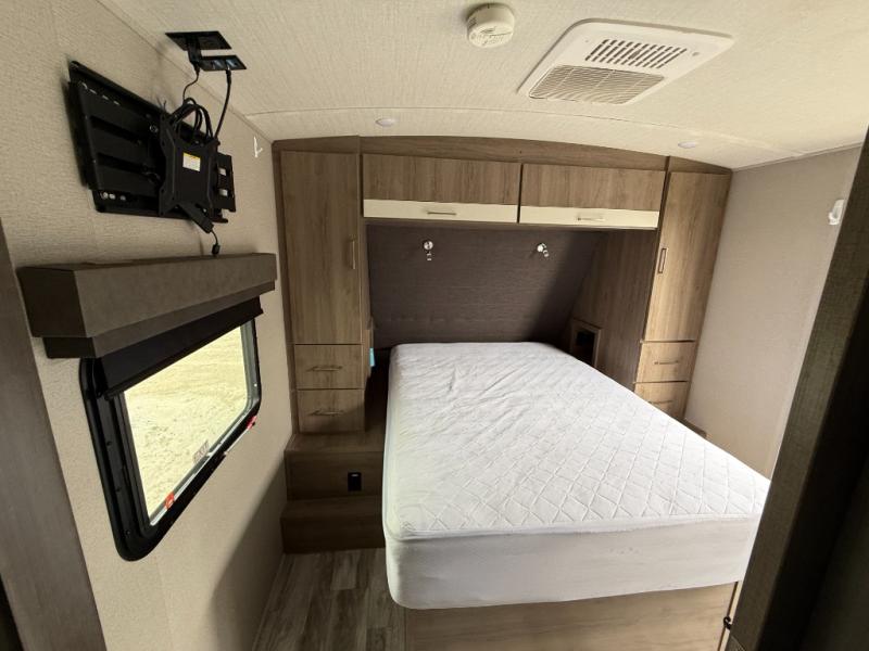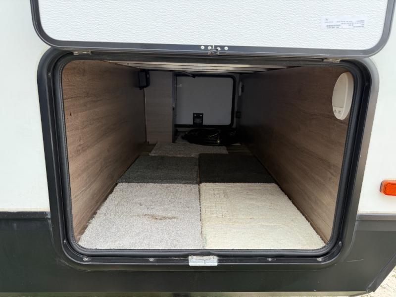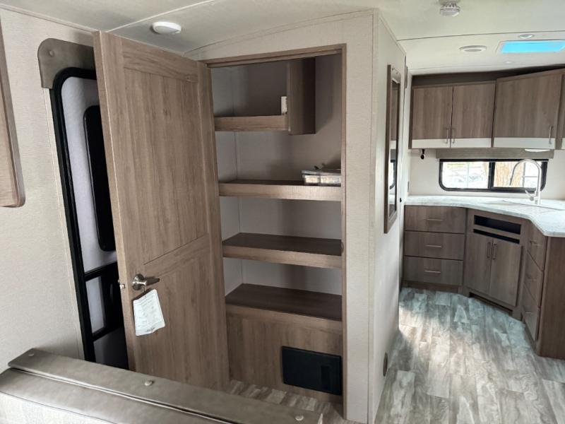 This single slide trailer allows you to enjoy a spacious living and kitchen area with a U-shaped dinette including a removable ottoman and a 40" LED TV as well as theatre seating with cupholders. The kitchen appliances are within the slide and the stainless steel sink is in the rear corner with overhead cabinets for more dishes and such. Everyone will love the location of the pantry which is next to the entry to easily grab a snack on your way outside. The 21' power adjustable awning gives you an outdoor living area, just grab your camp chairs from the pass through storage. When it is time for bed, your master suite awaits you with a walk-around queen bed, wardrobes, a sliding door for privacy and the second exterior entry.