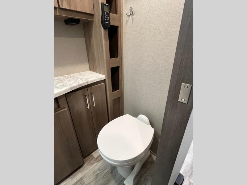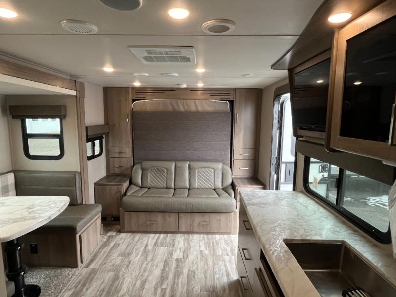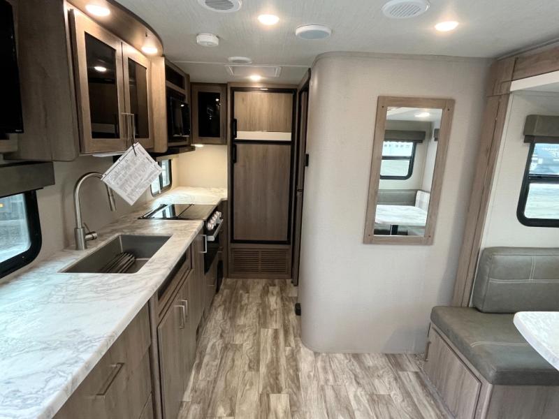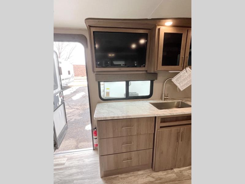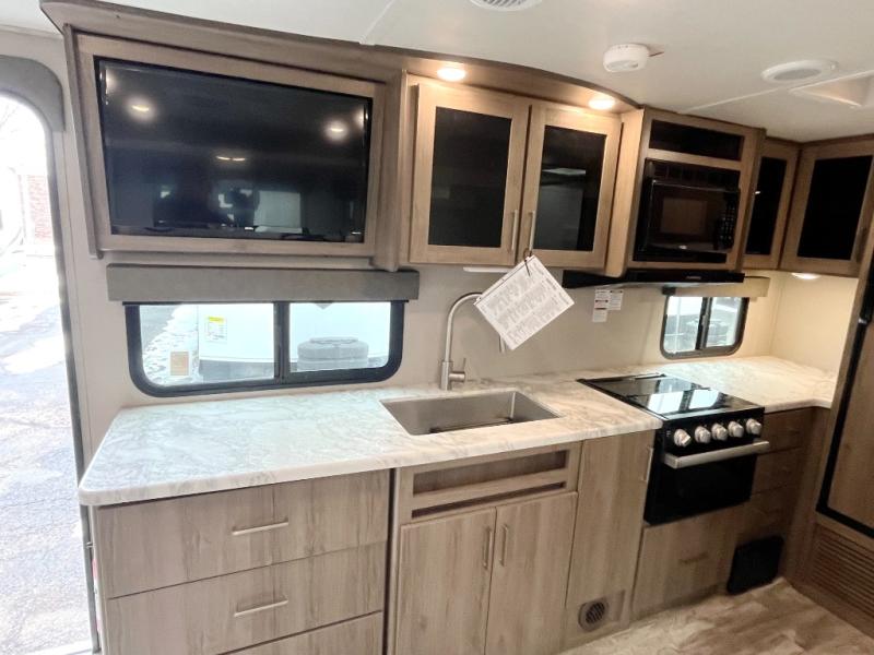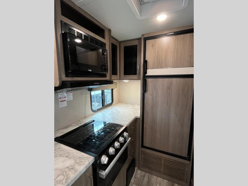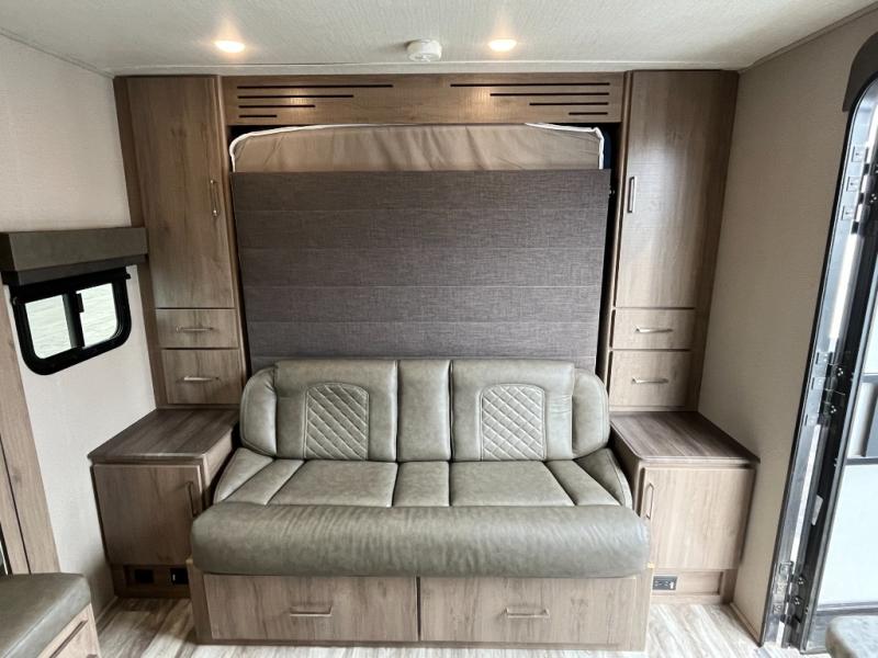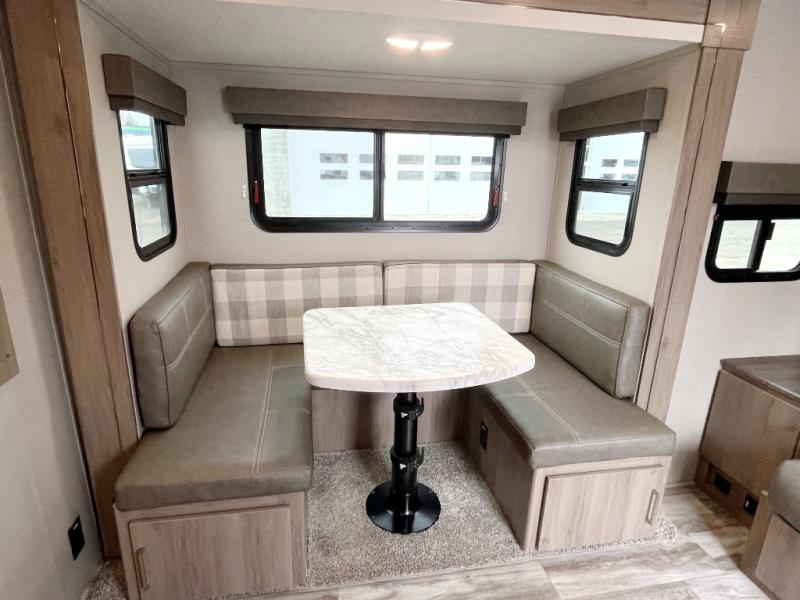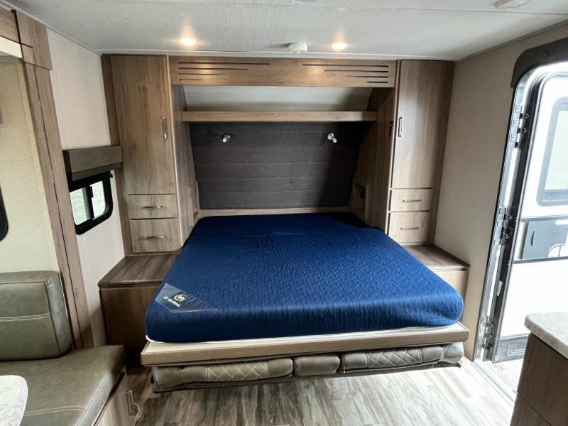 A couple will love this easy to tow and store trailer which includes a single slide out for more interior floor space! There is a sofa up front to utilize during the daytime and at night the queen Murphy bed can easily be set up for a good night's rest after a hike. And you will find wardrobe and drawer storage for your things. The theater dinette offers a great place to relax and dine thanks to the removable table, or choose a booth dinette option if you prefer that type of seating. The full bathroom allows you to skip the public facilities, and the kitchen offers lots of counter space, appliances to make warm meals, and a stainless steel sink to keep the dishes clean. There are more features to enjoy, make your reservations now!
