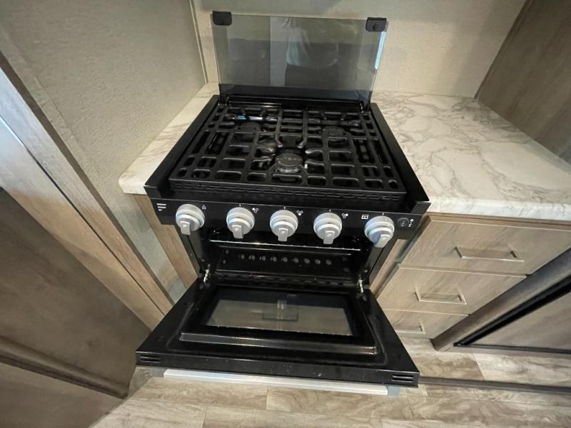 You and your spouse will love this spacious trailer with a large slide giving you lots of floor space to walk from the front to the back! The cook will enjoy the rear part of the kitchen with windows and a stainless steel sink, and the appliances are within the slide out next to the theatre seats with cupholders. The full bathroom will keep everyone refreshed before bedtime, the booth dinette offers a dining and gaming area indoors, and the privacy curtain can be closed to create a front bedroom at night. You will have a walk-around queen bed and your own side to put your clothing and such. The HD TV is on a swing-arm for easy viewing from the furniture or the bed. And you can enjoy relaxing outside under the electric awning on those beautiful evenings.