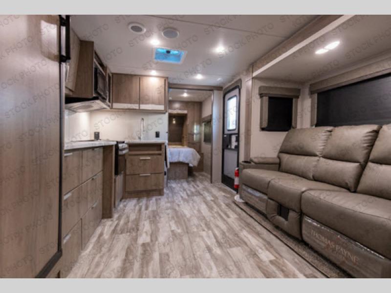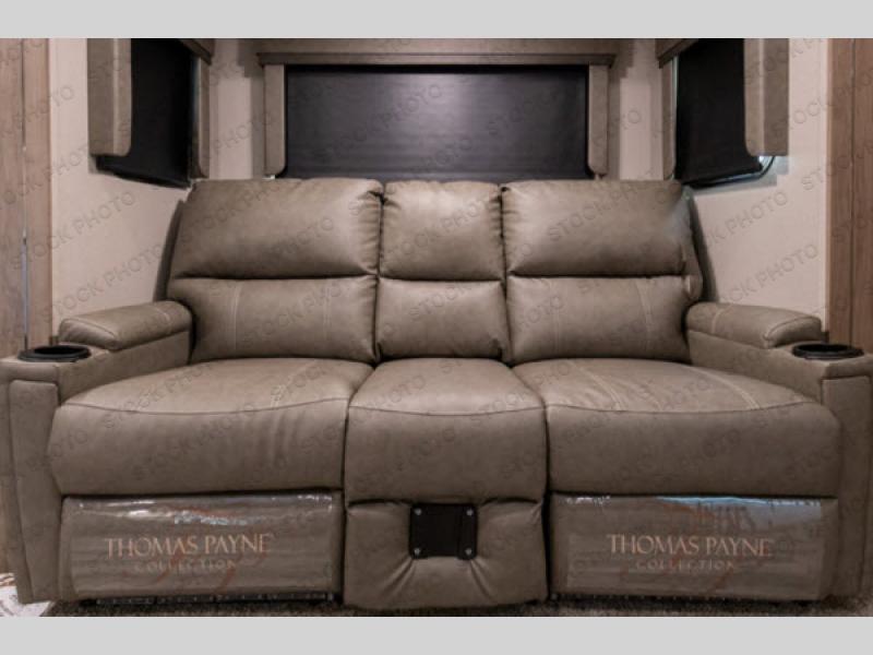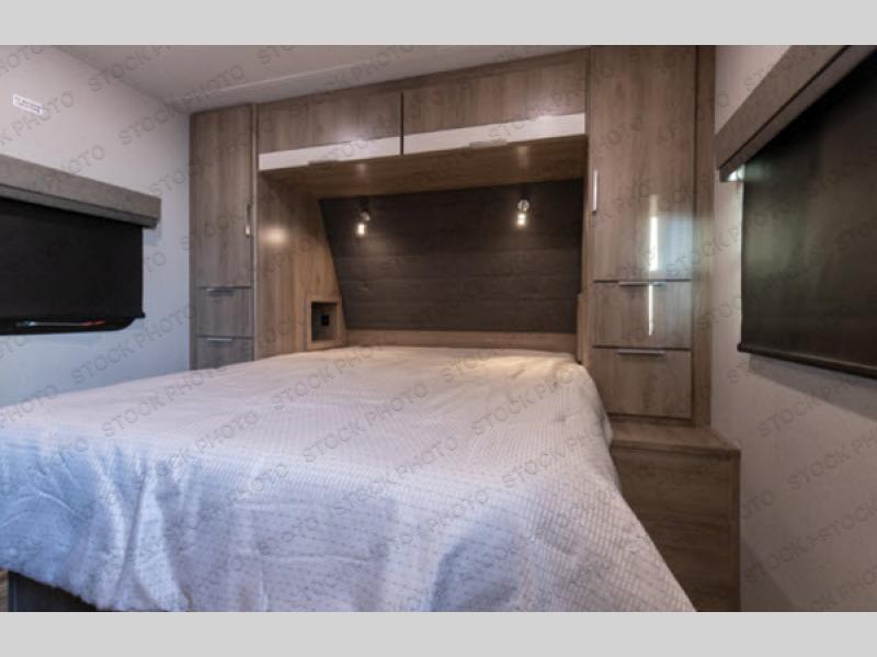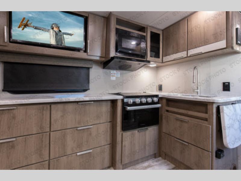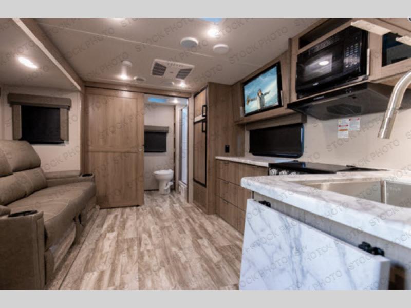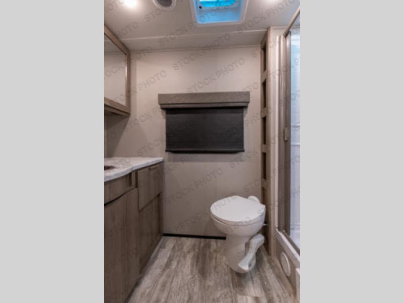 If you appreciate your privacy, this trailer offers a bedroom up front with a space saving door and a rear full bathroom with a space savings door, both giving you more interior space to enter and exit each area. The bathroom even has a window for great views plus extra counter space and storage for your toiletries and such. The bedroom gives a couple their own side of the walk-around queen bed to keep their clothing and such plus windows to check outside for the weather. The main living and kitchen area is spacious with a slide out theater dinette including a removable table or choose a booth dinette option. You can watch the HD TV while the cook makes a warm meal in the full kitchen. And the electric awning offers an outdoor living area when you add your camping chairs taken from the pass-through storage.