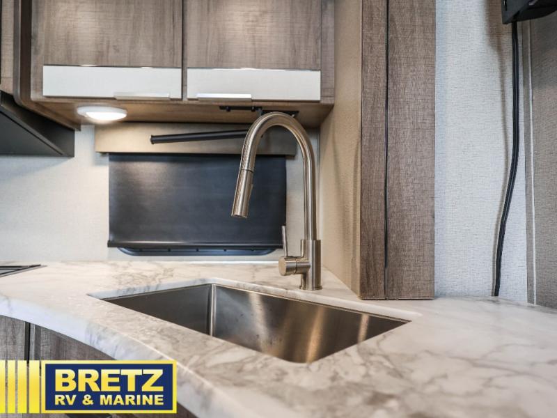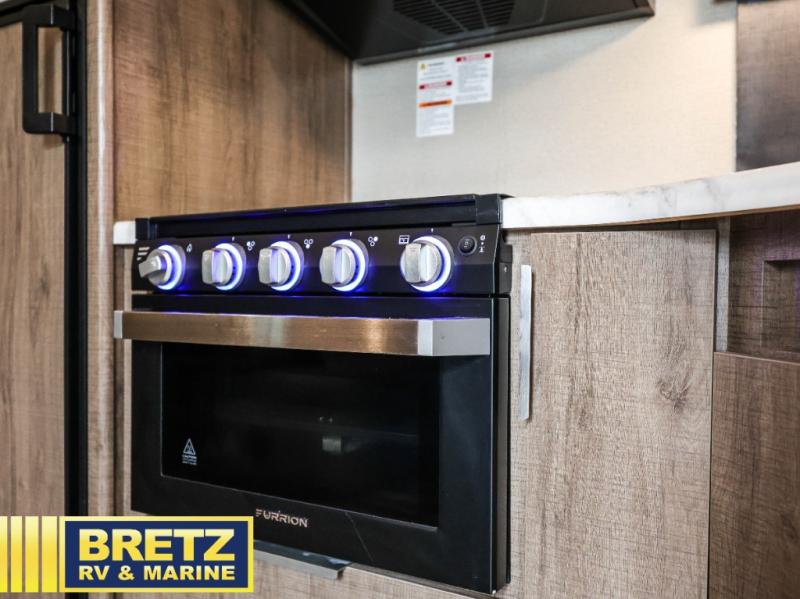 Your family will enjoy each and ever trip in this trailer with sleeping space for six between the double-size bunks in the rear with privacy curtains and the walk-around queen bed in the private bedroom, plus the booth dinette that doubles as extra sleeping space for one! After hiking the trailers and hanging out around the campfire, the cook can make meals inside with full amenities within the slide out including a double door refrigerator or outdoors using the outside kitchen. The 20' electric awning provides a covered area for all to enjoy, just add your camping chairs. Everyone can take turns getting cleaned up in the full bathroom before bedtime and some might like to watch the HD TV before falling asleep.