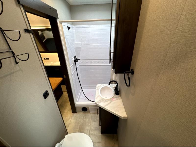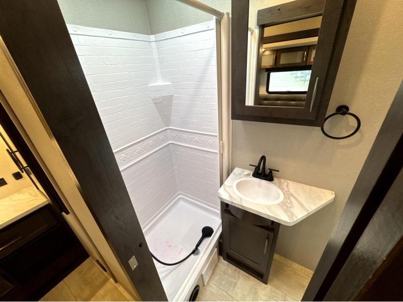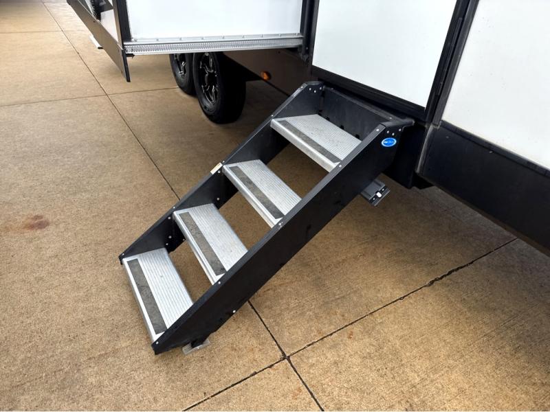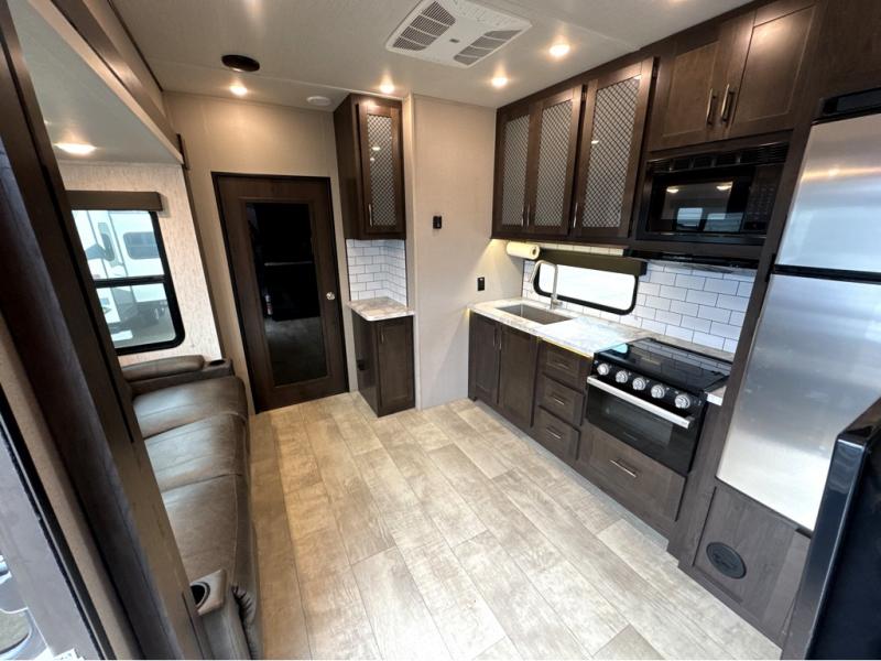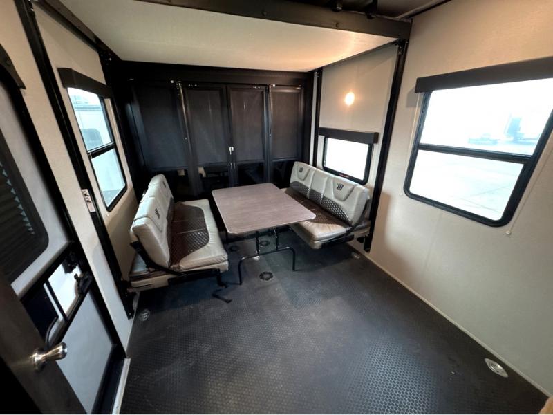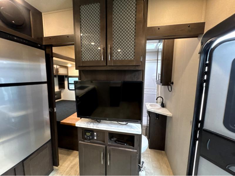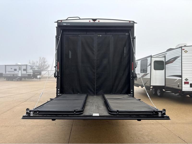Start your engines for a fun weekend with your toys and your family in this Momentum G-Class toy hauler. The 11' separate garage includes Happi-Jac rollover sofas with a table, a top bunk for the kids, plus a half bath! There is even a second entry door which leads directly into the garage so that you don't have to walk through the entire trailer just to get to your cargo. Now that's helpful! In the front of this unit, you will have your own master suite that has private access to the residential walk-in shower in the dual-entry bathroom. The main living and kitchen area offers everything you need and would want, plus more. This is the one!