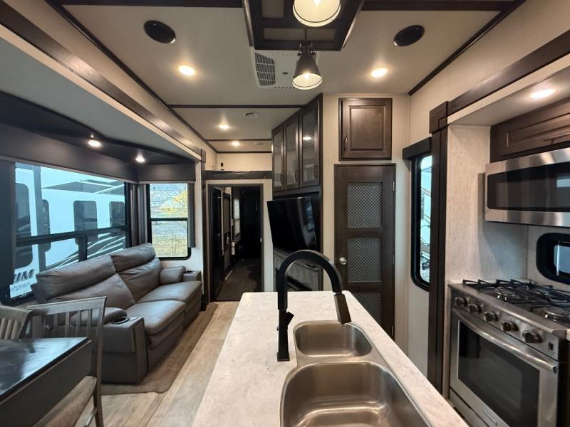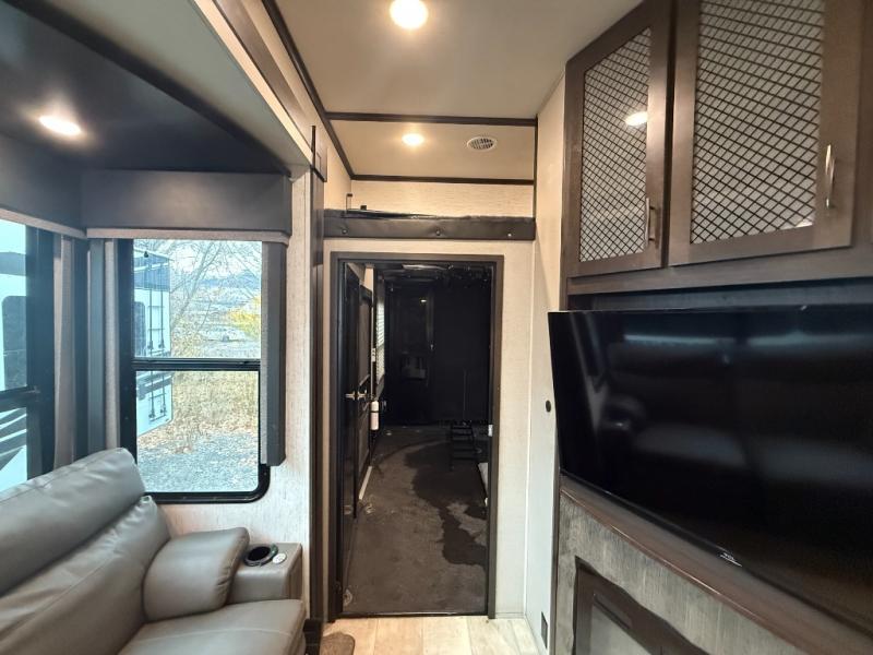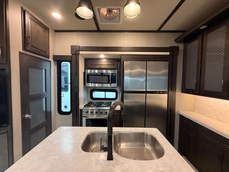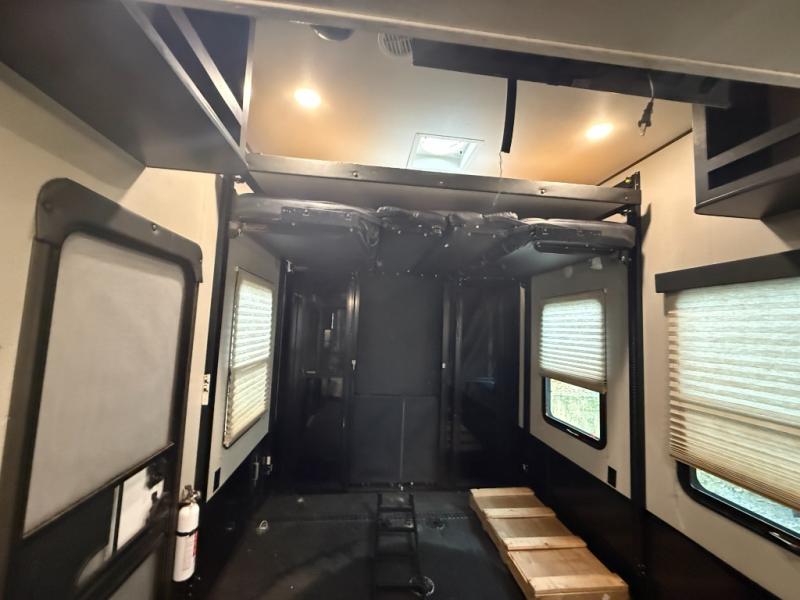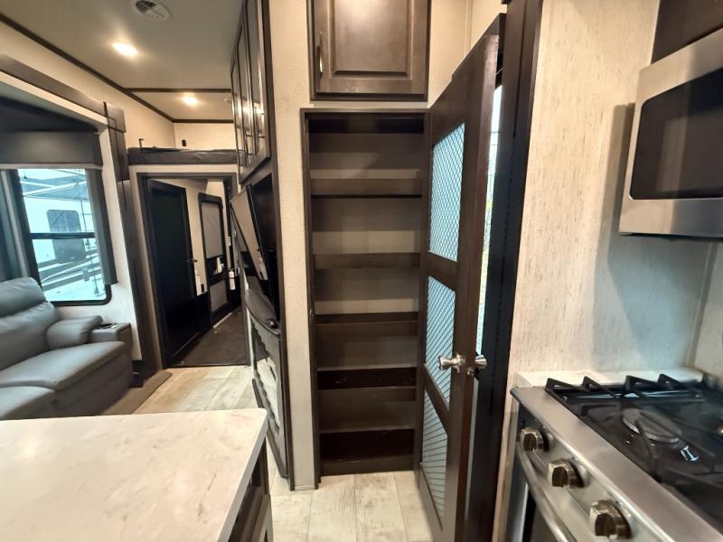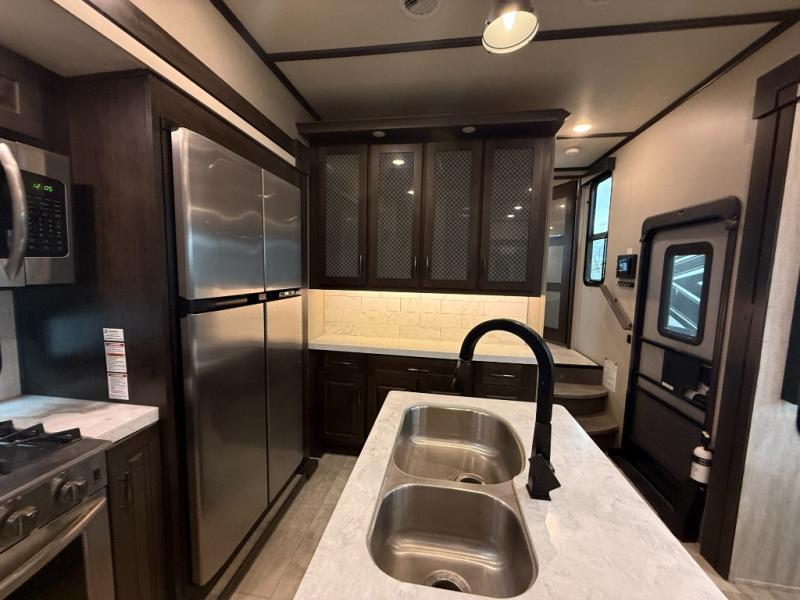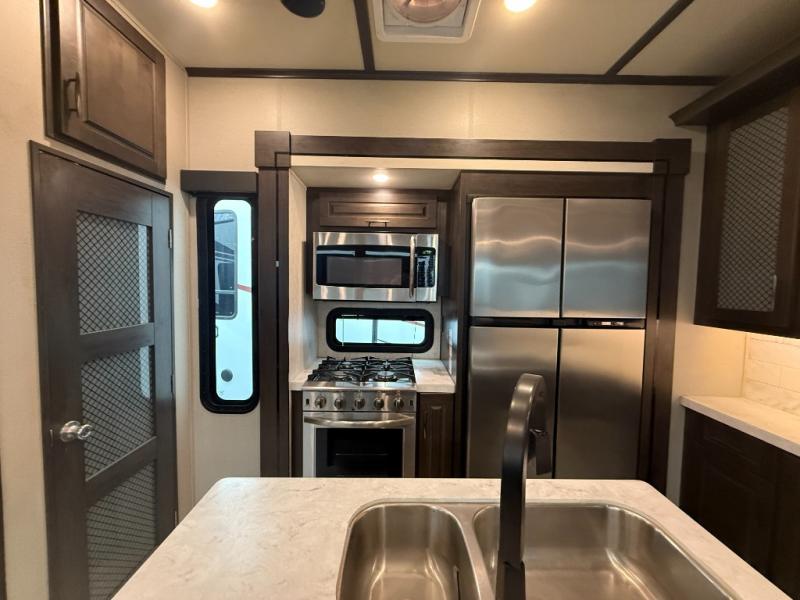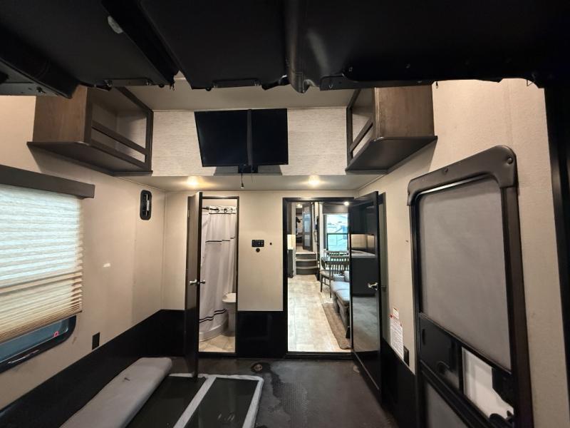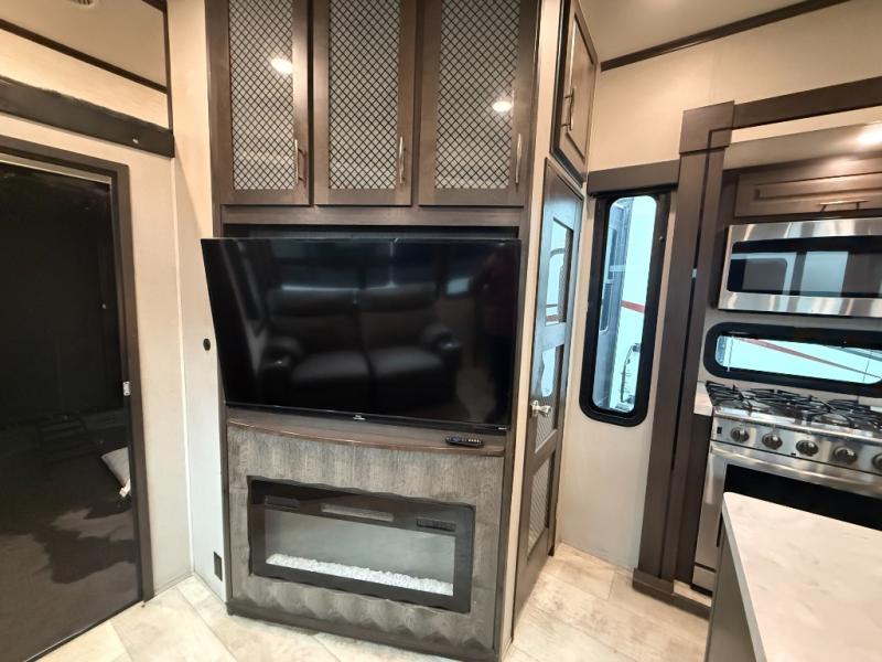 This Momentum toy hauler provides the maximum entertainment with its 49" LED TV in the living area, 32" LED TV in the private bedroom, 32" LED TV in the 12' 6" separate garage, and exterior LED TV! You can choose to add the optional Super Sofa which will create an amazingly comfortable area to sit down across from the electric fireplace. The two full bathrooms are one of the most impressive features found on this unit, and the three power awnings are another shocking addition. Within the kitchen, you'll be able to prepare all of your family's favorite dishes when you use the chef-inspired range and oven, and the window behind the range allows you to view the campsite while you cook. If you would prefer to have a residential refrigerator, you should check out model 397TH-R!