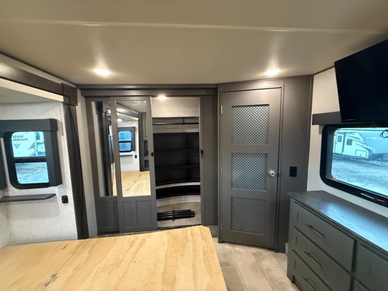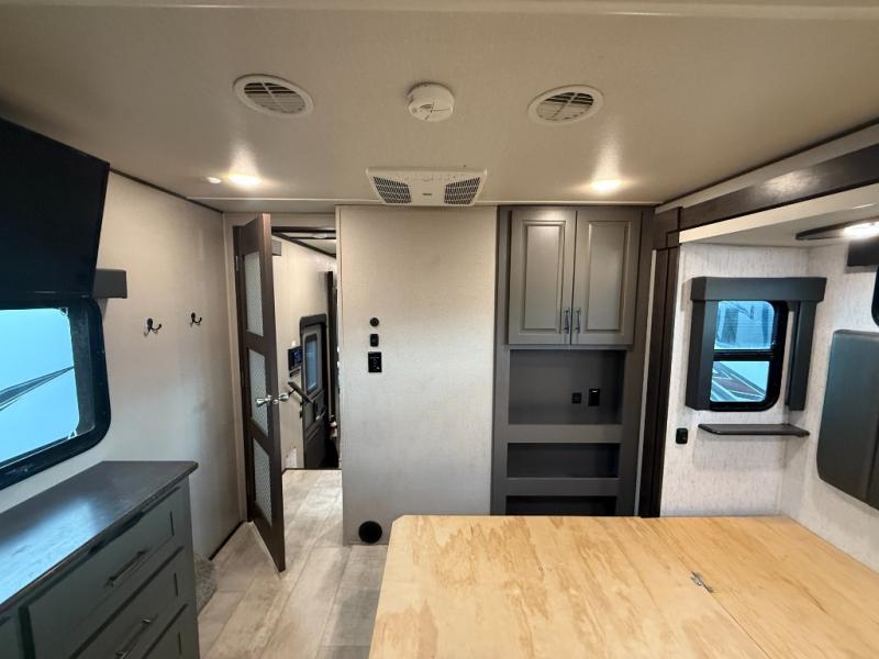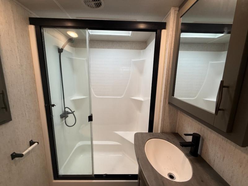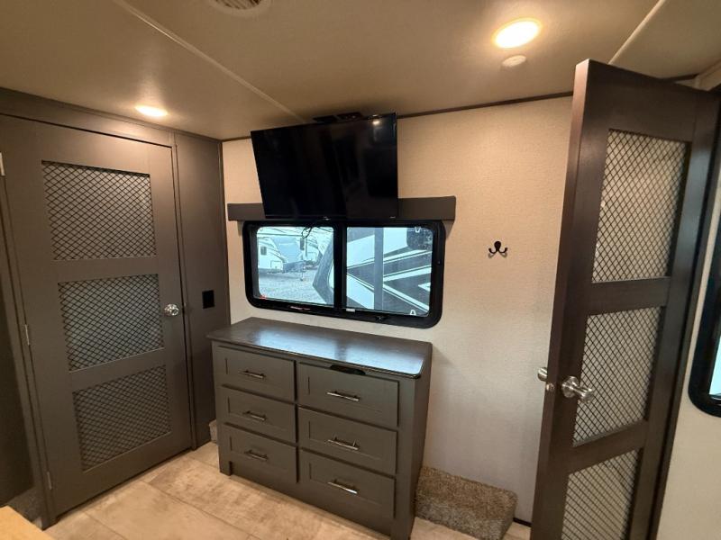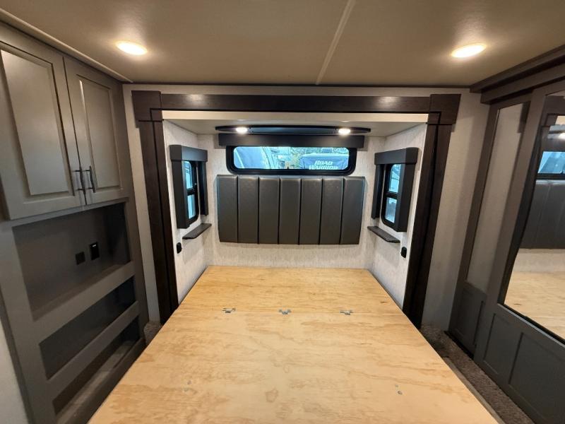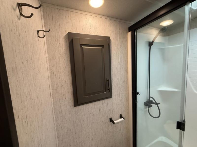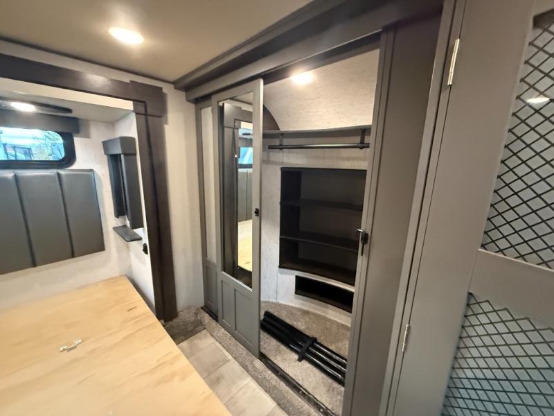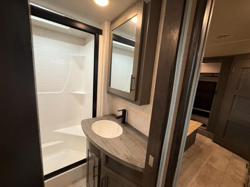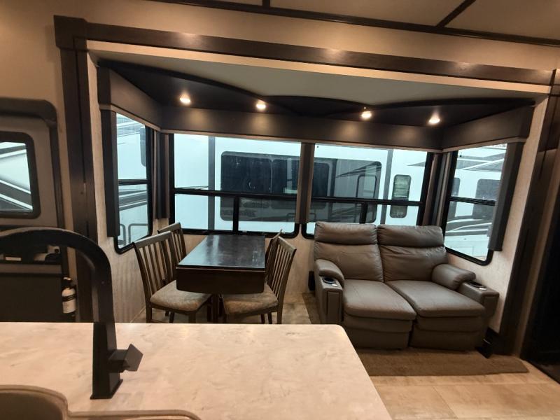 This Momentum toy hauler provides the maximum entertainment with its 49" LED TV in the living area, 32" LED TV in the private bedroom, 32" LED TV in the 12' 6" separate garage, and exterior LED TV! You can choose to add the optional Super Sofa which will create an amazingly comfortable area to sit down across from the electric fireplace. The two full bathrooms are one of the most impressive features found on this unit, and the three power awnings are another shocking addition. Within the kitchen, you'll be able to prepare all of your family's favorite dishes when you use the chef-inspired range and oven, and the window behind the range allows you to view the campsite while you cook. If you would prefer to have a residential refrigerator, you should check out model 397TH-R!