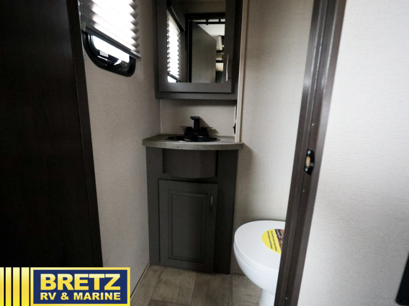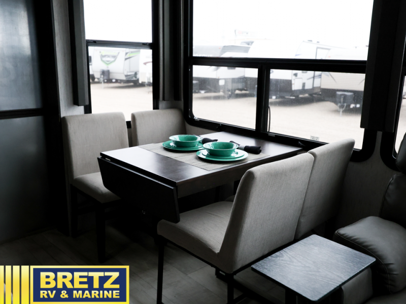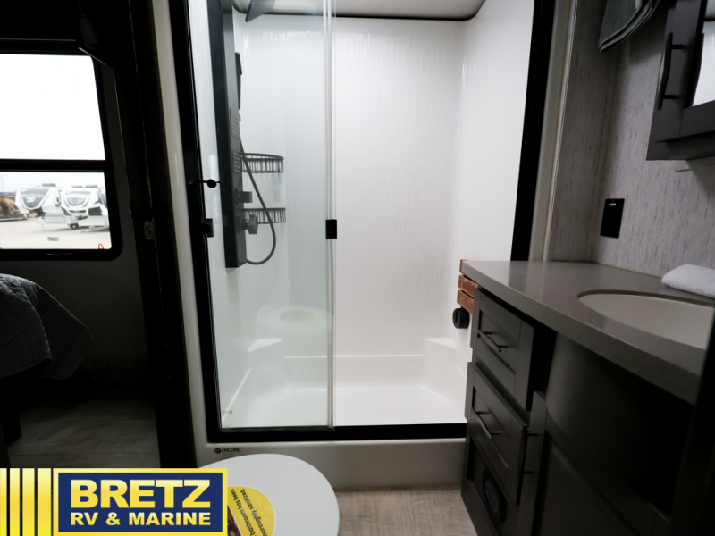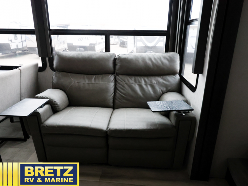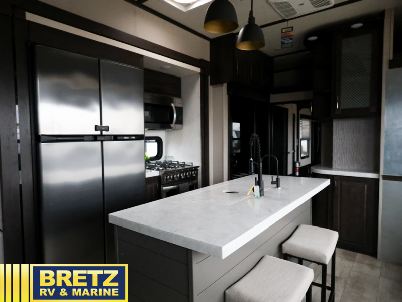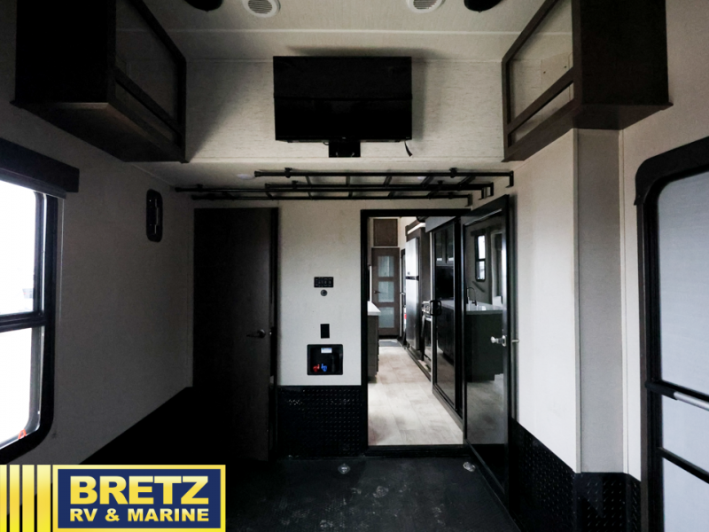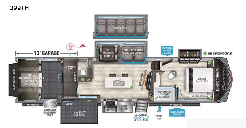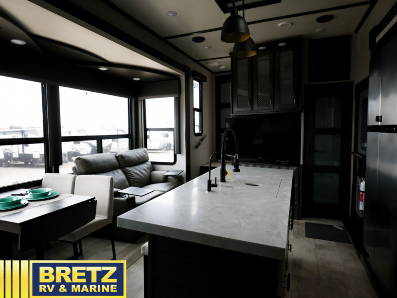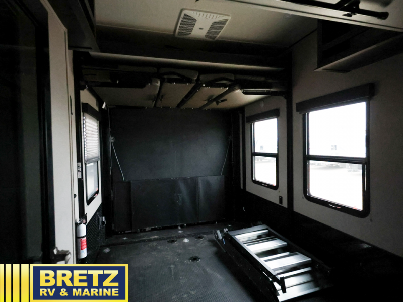 Whatever your idea of adventure is, this Momentum toy hauler will make it even better! The fold-down side patio is the perfect party space, especially since there is also an exterior LED TV, and back on the interior, you'll find three more LED TVs for entertainment while staying indoors. The front master suite is going to provide you with the most comfort while you sleep, and the electric fireplace within the main living area is going to provide you with an extra bit of heat on chilly nights. The kitchen has an island with bar stools so that you can sit down and chat with the chef, and you can also choose to sit back in the theater seating with heat/massage to relax after a long day of biking or hiking. If you would prefer to have a residential refrigerator, you should check out model 399TH-R!