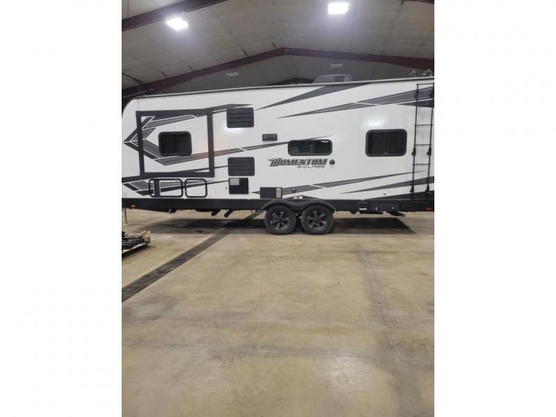 Are you looking for adventure and fun? The Momentum G-Class toy hauler by Grand Design will help you find it! You can explore during any season you choose with the Insulation Package that includes a heated and enclosed underbelly with suspended tanks, a high-capacity furnace, a moisture barrier floor enclosure, and cabinet-mounted heat ducts. Each model includes a 30-gallon fuel station with an interior and exterior gauge, a dovetail rear rend, and 2,500-LB tie-downs anchored into the chassis. Throughout the Momentum G-Class interior, you'll enjoy many comfortable features like large panoramic windows, a shower skylight, USB chargers in the bedroom, and residential cabinetry.