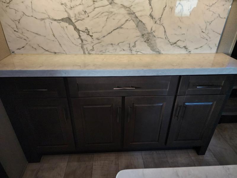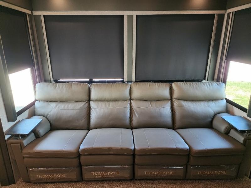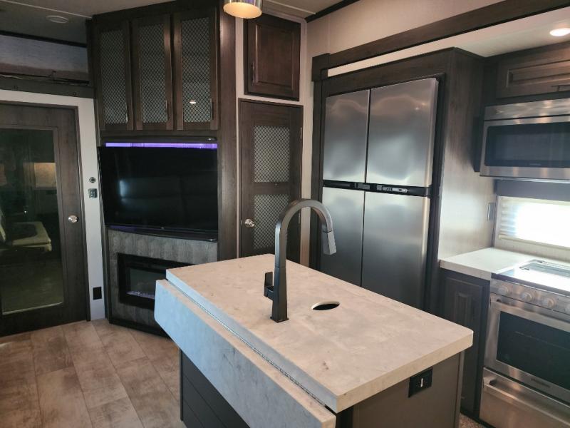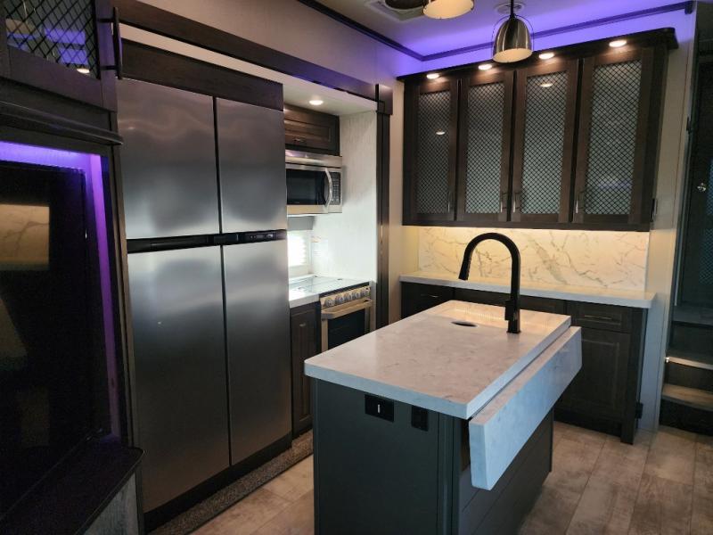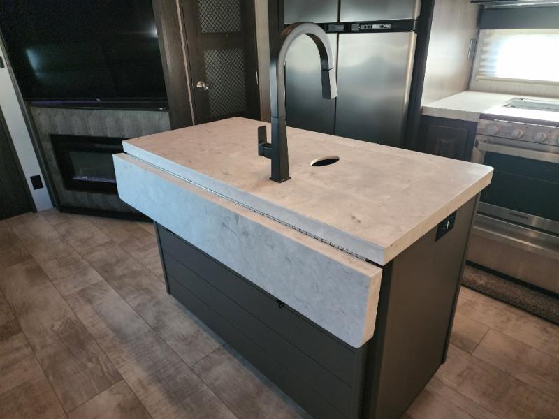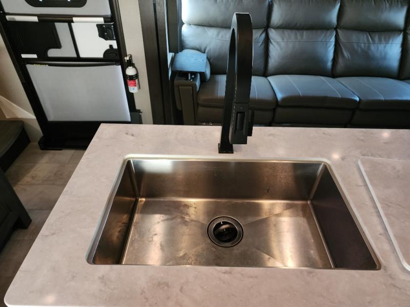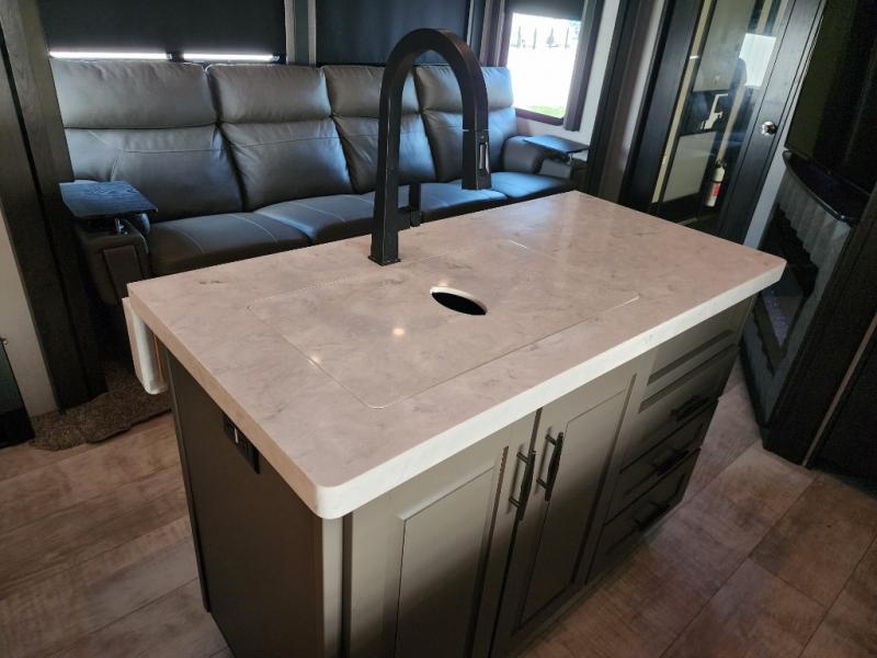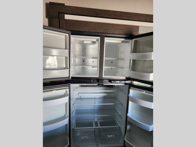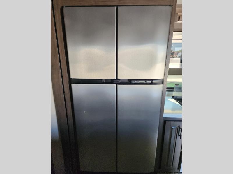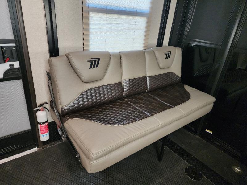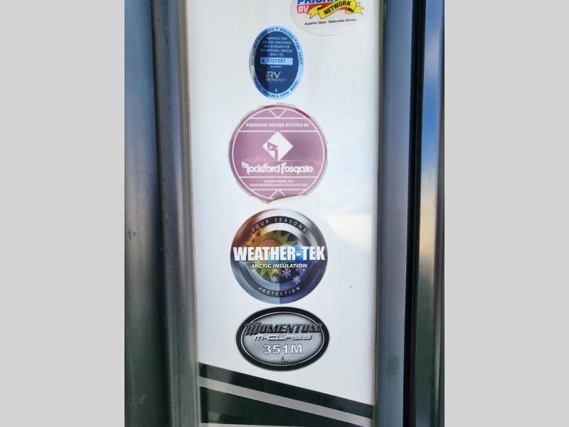Everyone will stay clean with a full and half bath in this Momentum M-Class toy hauler, plus there is an exterior spray port to keep the sand outside! The kitchen is decked out in everything you will need to create a home-cooked meal including a kitchen island with bar stools, a fold-up countertop, and a USB charging port to keep your phone close by as it charges. There is also a hutch to store your nice dishes and a microwave for those nights when you don't feel like cooking. The four-seat sofa slide has a storable table for you to eat your meals and play a card game while you enjoy the entertainment center. The front private bedroom has a queen bed with USB charging outlets on either side and a wardrobe slide with drawers to keep your clothes looking their best! If you would prefer to have a residential refrigerator, you should check out model 351M-R!