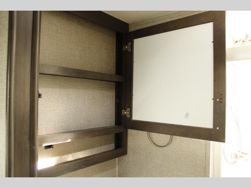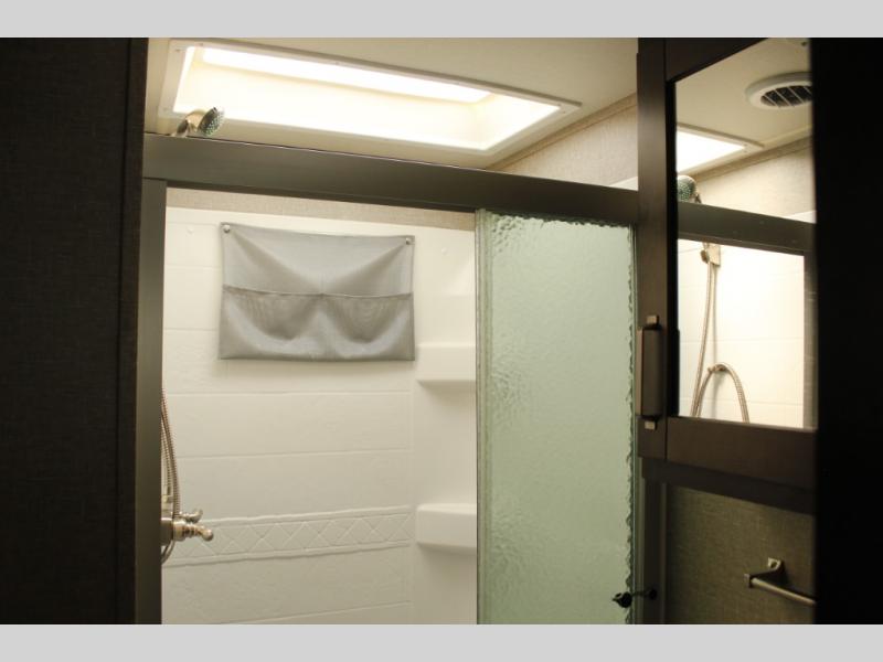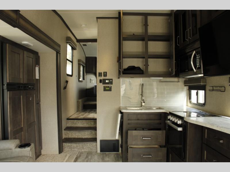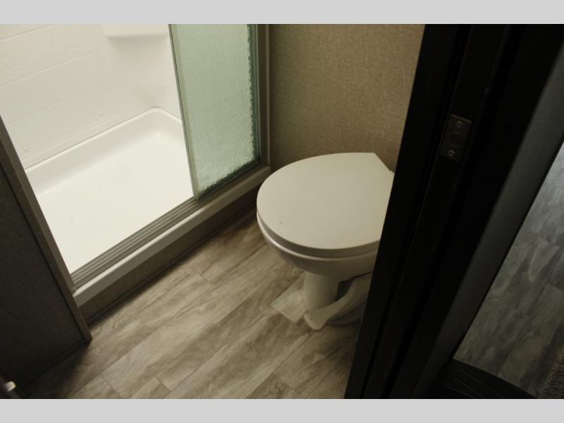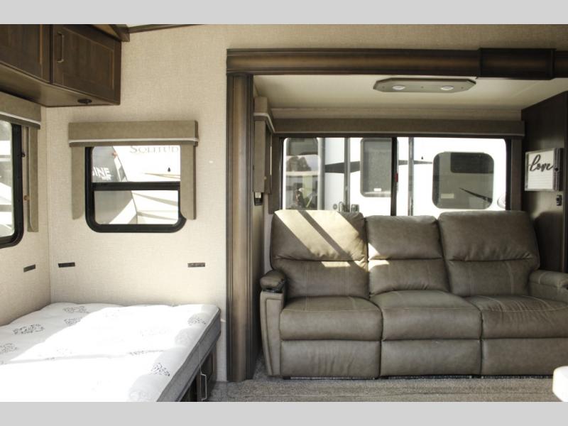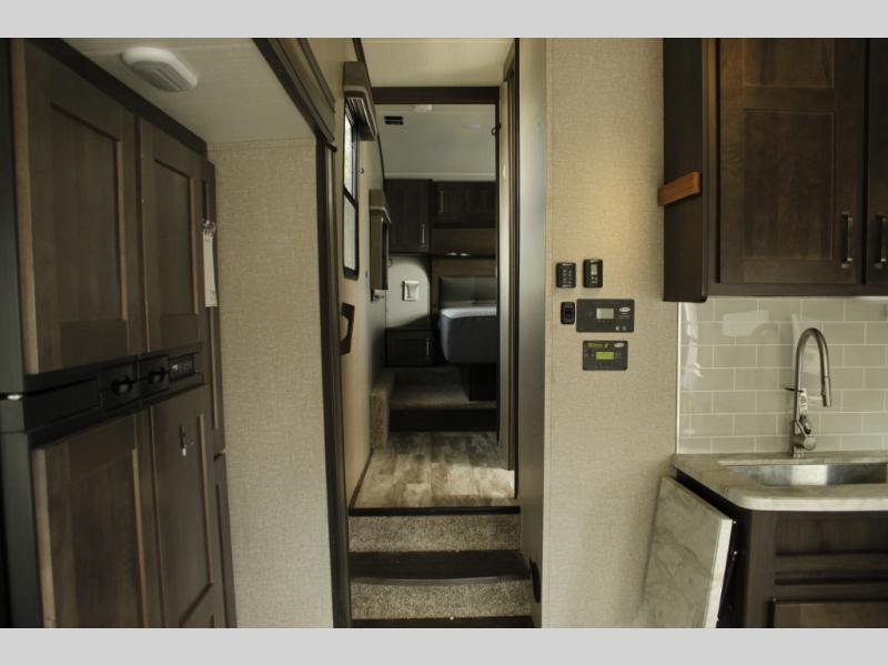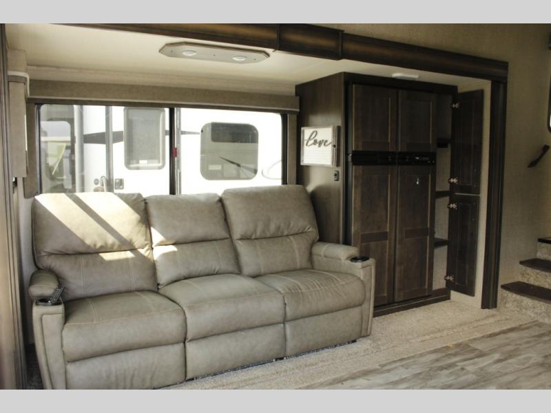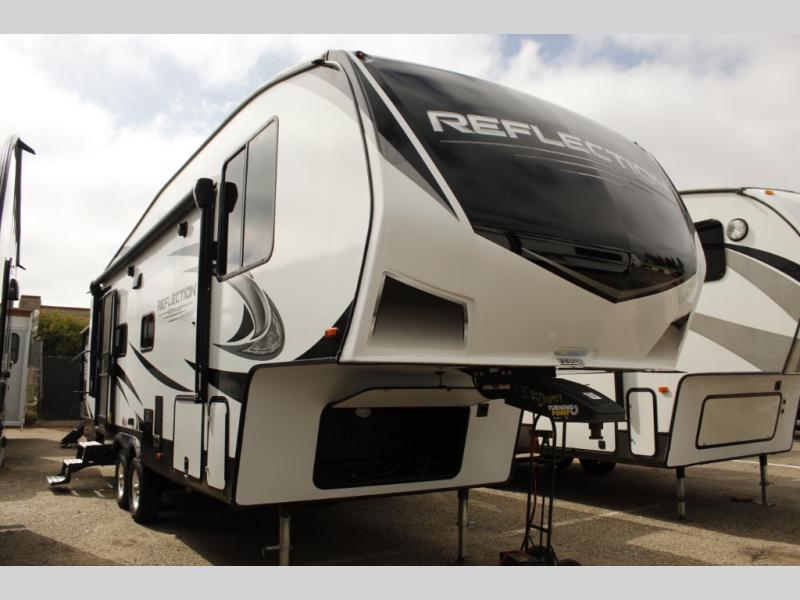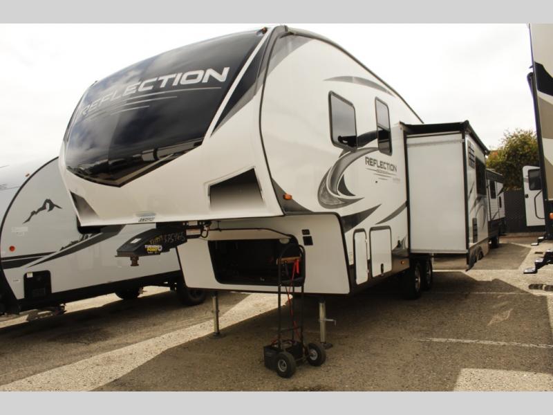 Load up lots of cold food in the 12-cu. ft. refrigerator to enjoy a weekend away from it all in this Reflection 150 Series fifth wheel! The dry food can be placed in the pantry and overhead cabinets, depending on where you want everything. You will enjoy having the appliances near by to make a warm meal in the L-shaped corner kitchen that is next to the entry. Head outside to sit under the 18' electric awning, and you can grab your camp chairs from the exterior unobstructed pass-through storage. You might prefer to dine at the U-shaped dinette with a view and watch TV from the theatre seating that has a massage feature. At night, you can get cleaned up in the 30" x 36" shower with skylight and fall quickly to sleep on your own queen bed.