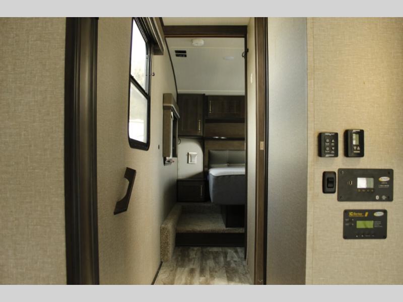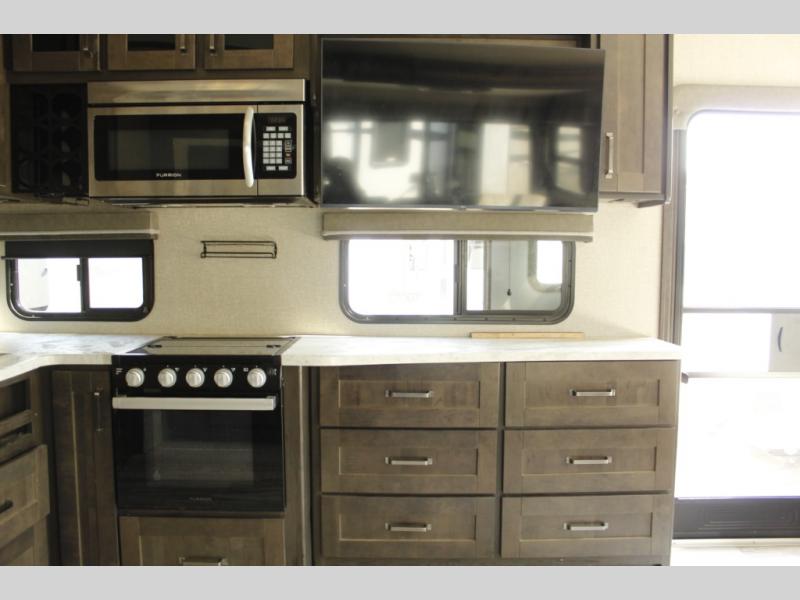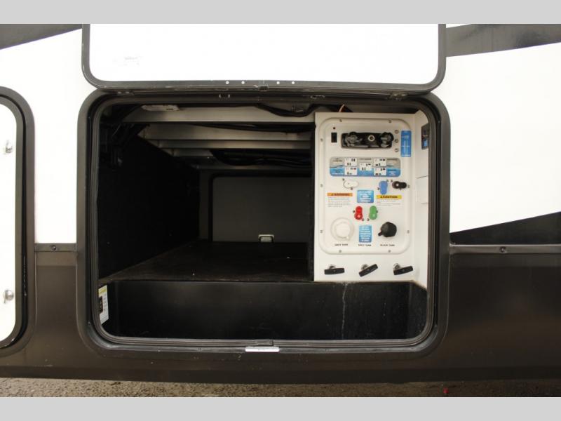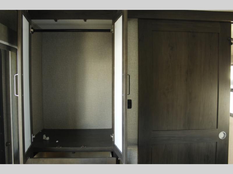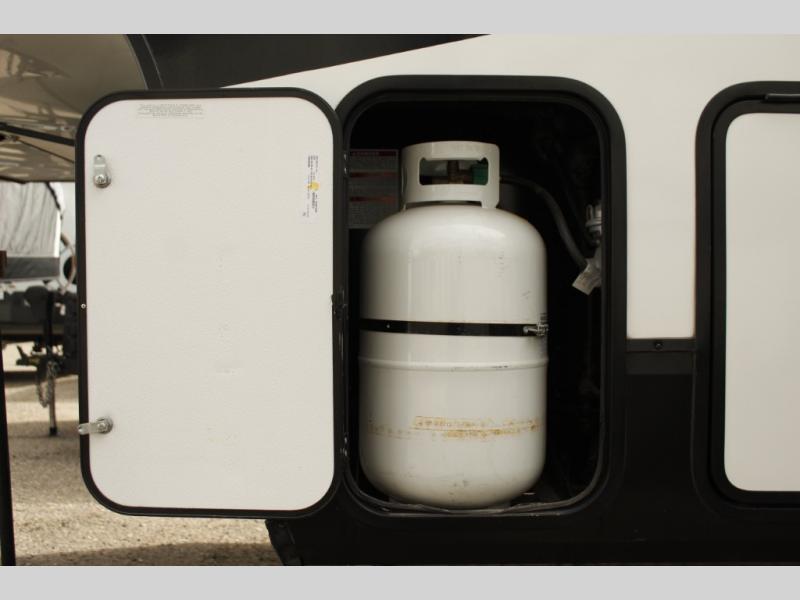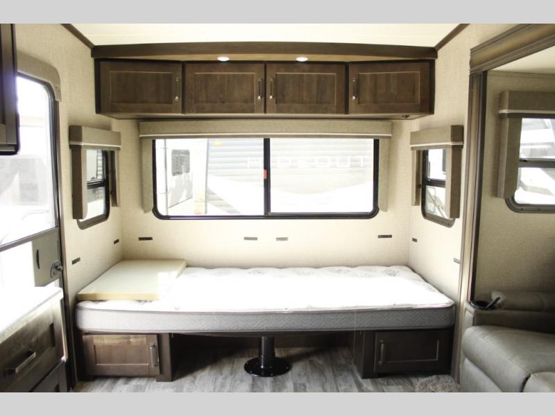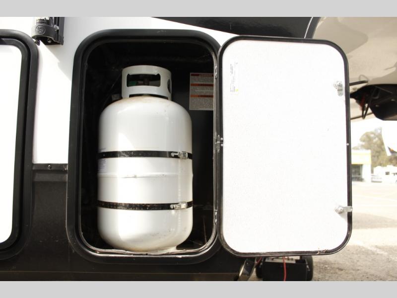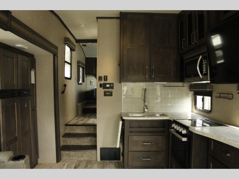 Load up lots of cold food in the 12-cu. ft. refrigerator to enjoy a weekend away from it all in this Reflection 150 Series fifth wheel! The dry food can be placed in the pantry and overhead cabinets, depending on where you want everything. You will enjoy having the appliances near by to make a warm meal in the L-shaped corner kitchen that is next to the entry. Head outside to sit under the 18' electric awning, and you can grab your camp chairs from the exterior unobstructed pass-through storage. You might prefer to dine at the U-shaped dinette with a view and watch TV from the theatre seating that has a massage feature. At night, you can get cleaned up in the 30" x 36" shower with skylight and fall quickly to sleep on your own queen bed.
