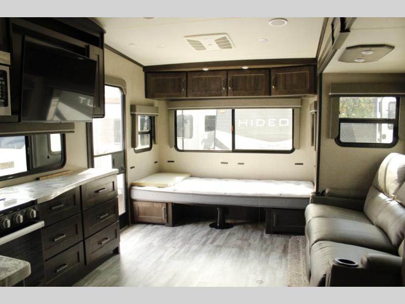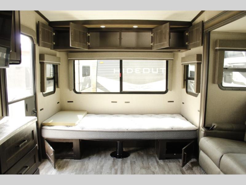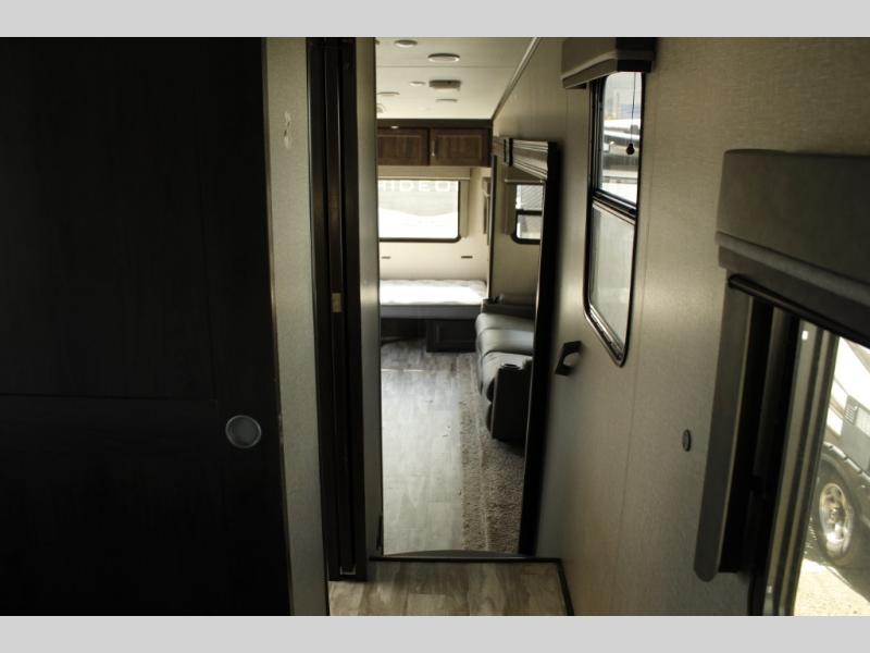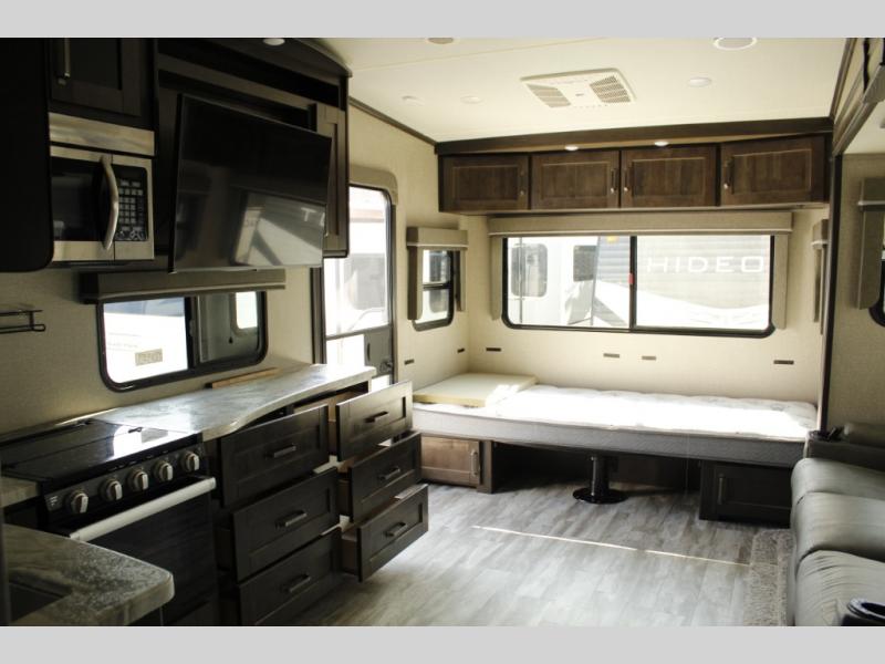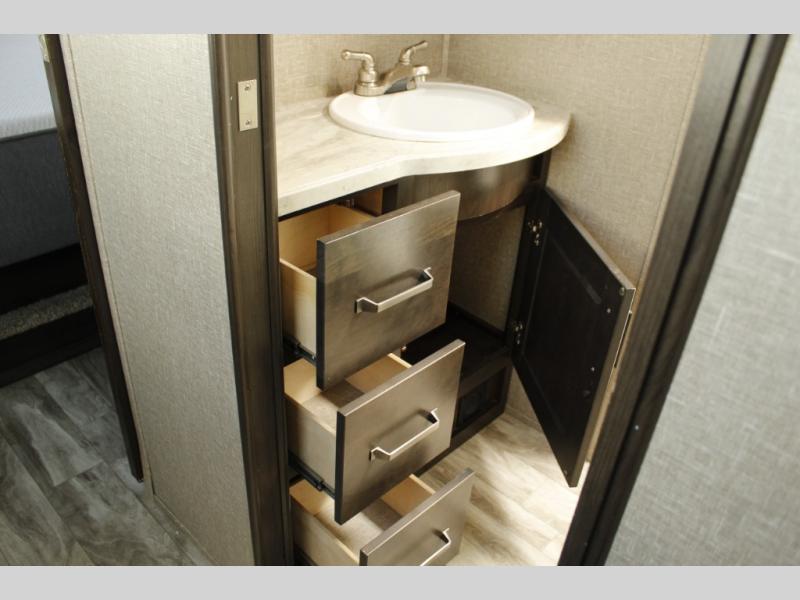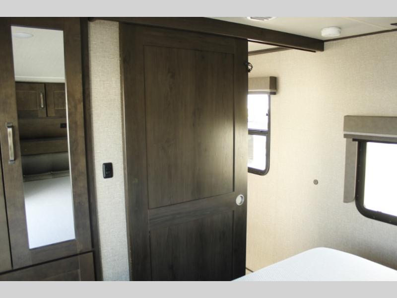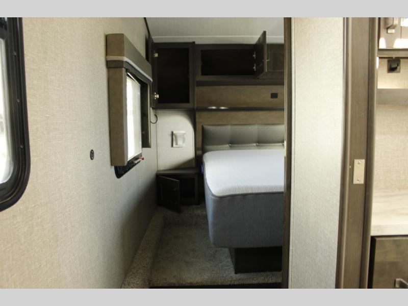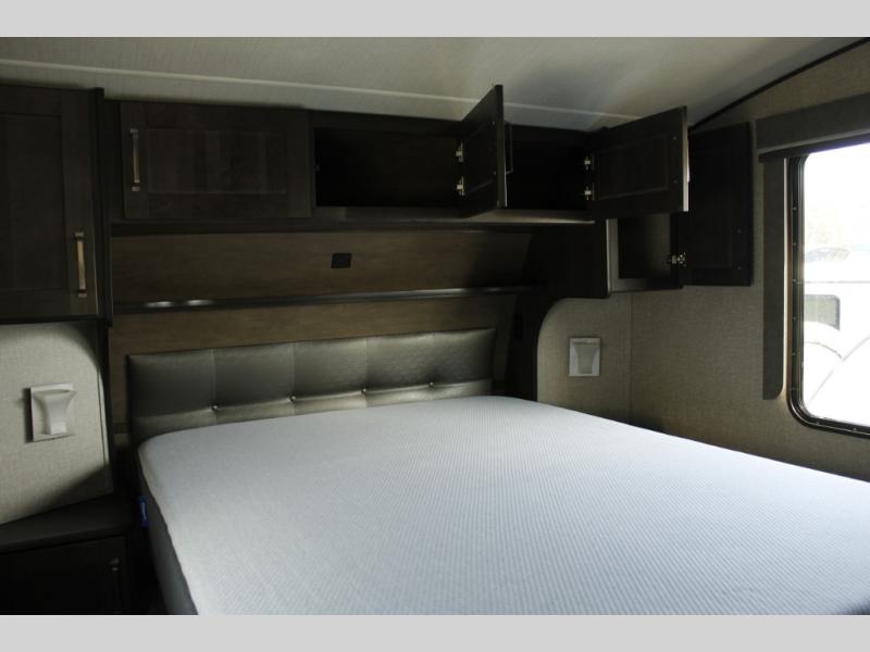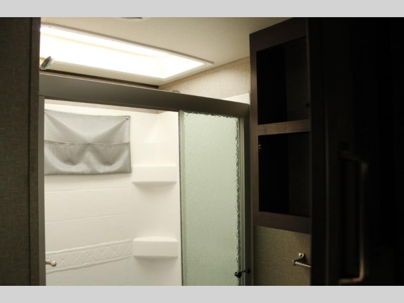 Load up lots of cold food in the 12-cu. ft. refrigerator to enjoy a weekend away from it all in this Reflection 150 Series fifth wheel! The dry food can be placed in the pantry and overhead cabinets, depending on where you want everything. You will enjoy having the appliances near by to make a warm meal in the L-shaped corner kitchen that is next to the entry. Head outside to sit under the 18' electric awning, and you can grab your camp chairs from the exterior unobstructed pass-through storage. You might prefer to dine at the U-shaped dinette with a view and watch TV from the theatre seating that has a massage feature. At night, you can get cleaned up in the 30" x 36" shower with skylight and fall quickly to sleep on your own queen bed.