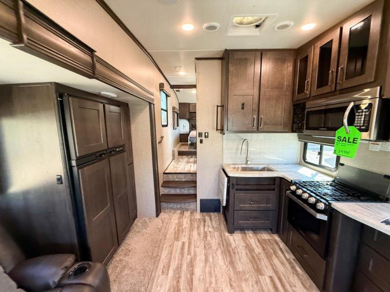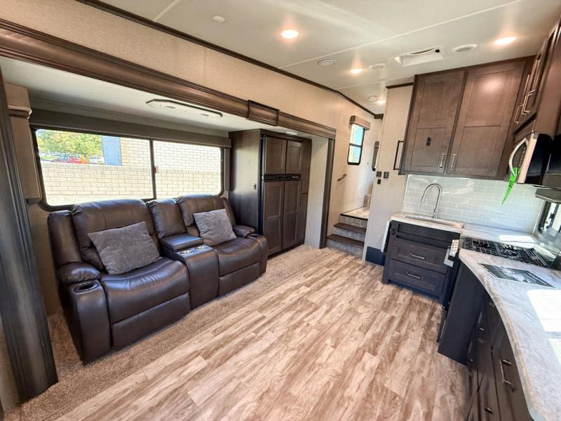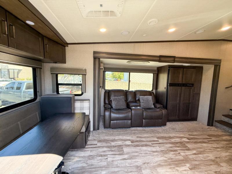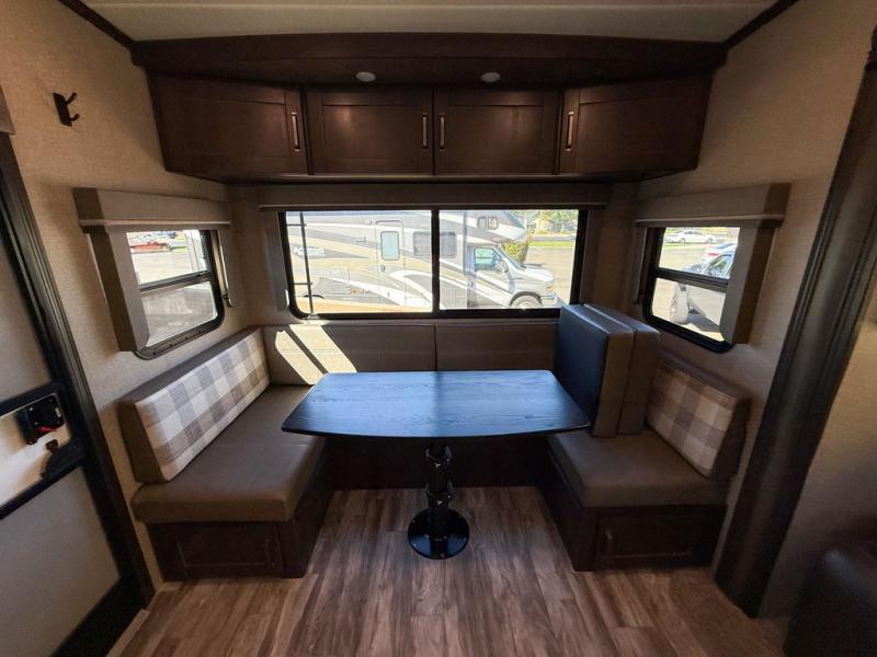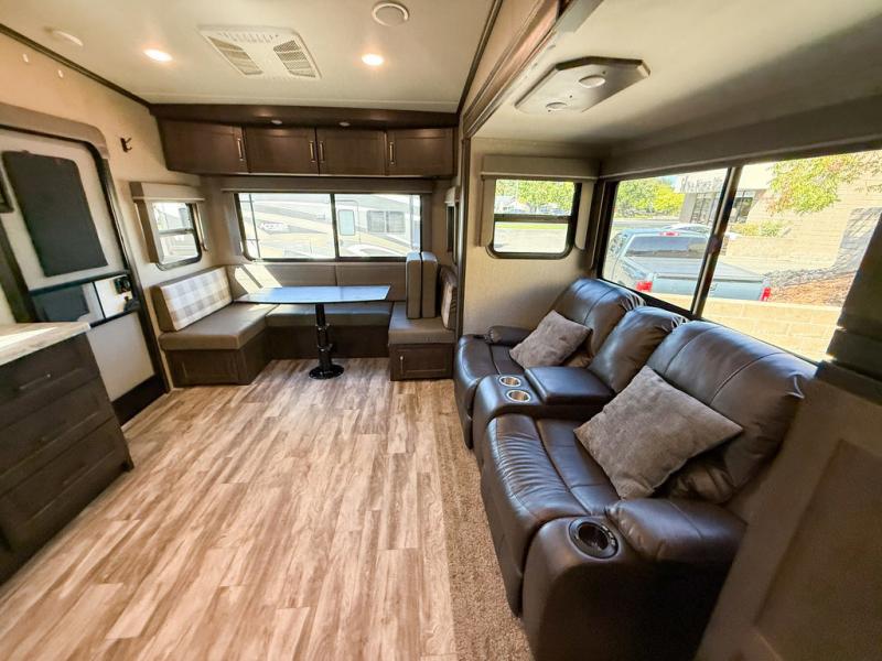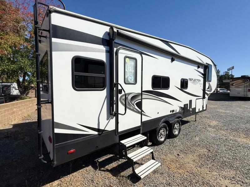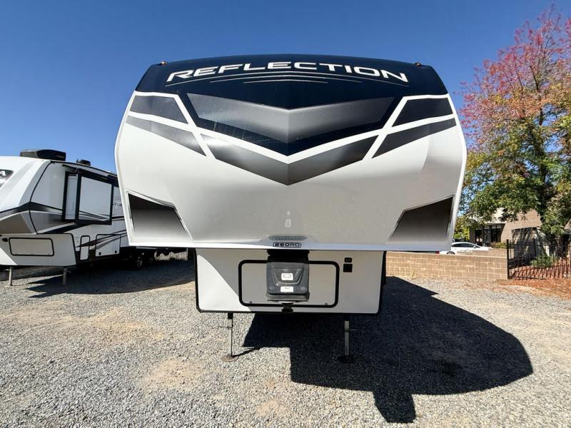 Load up lots of cold food in the 12-cu. ft. refrigerator to enjoy a weekend away from it all in this Reflection 150 Series fifth wheel! The dry food can be placed in the pantry and overhead cabinets, depending on where you want everything. You will enjoy having the appliances near by to make a warm meal in the L-shaped corner kitchen that is next to the entry. Head outside to sit under the 18' electric awning, and you can grab your camp chairs from the exterior unobstructed pass-through storage. You might prefer to dine at the U-shaped dinette with a view and watch TV from the theatre seating that has a massage feature. At night, you can get cleaned up in the 30" x 36" shower with skylight and fall quickly to sleep on your own queen bed.