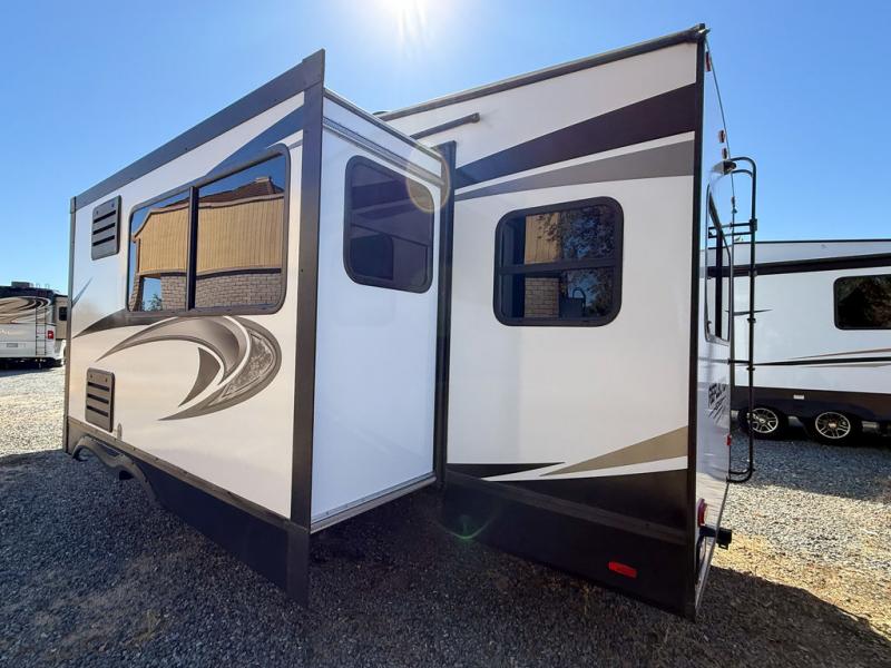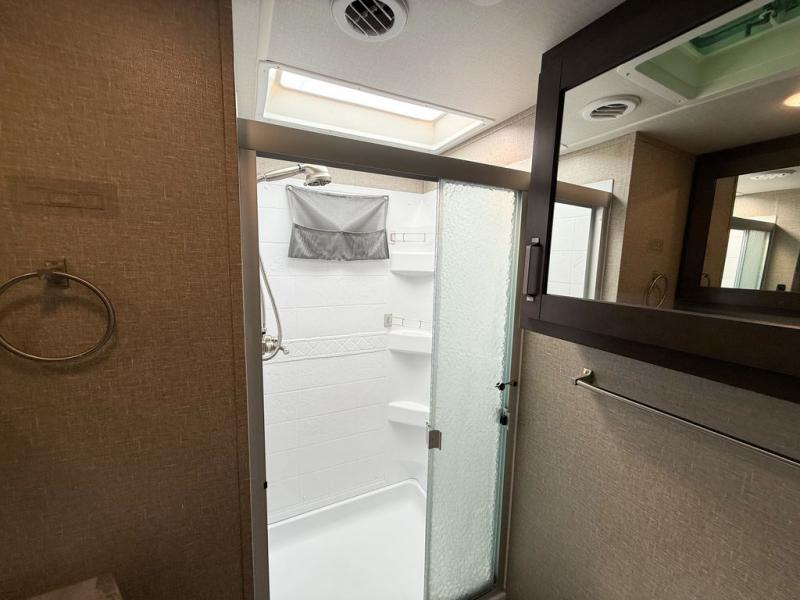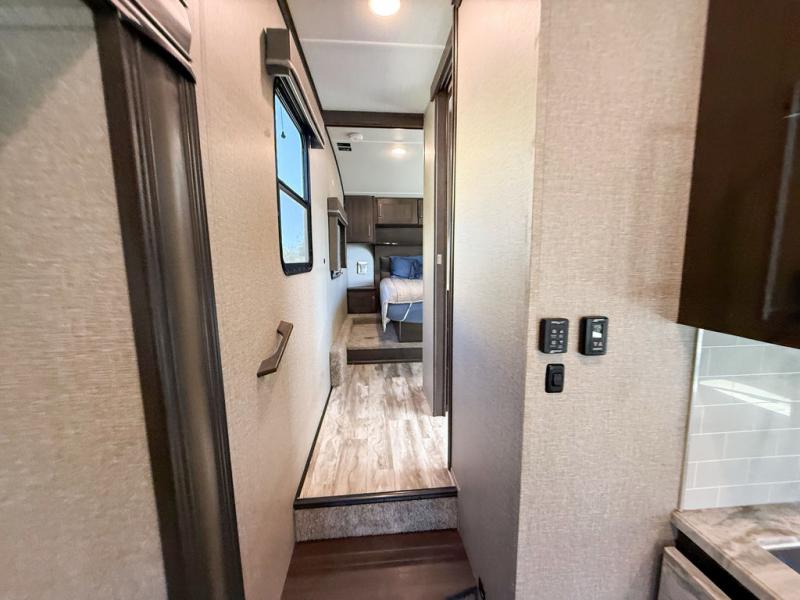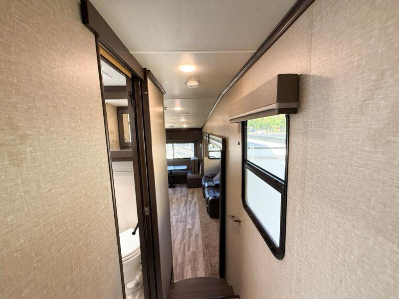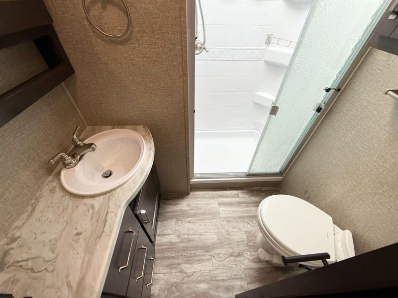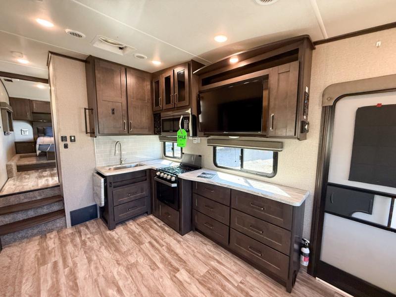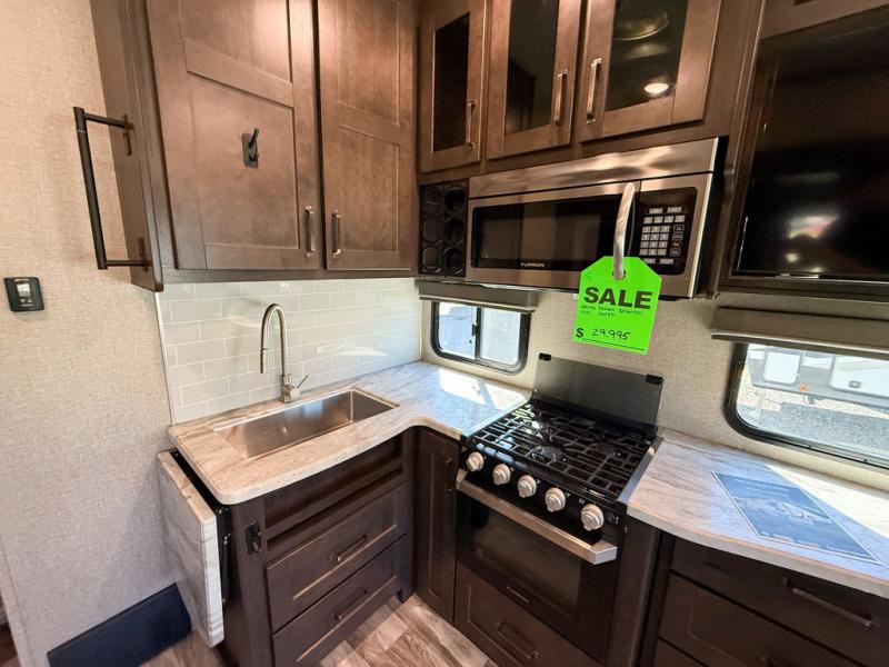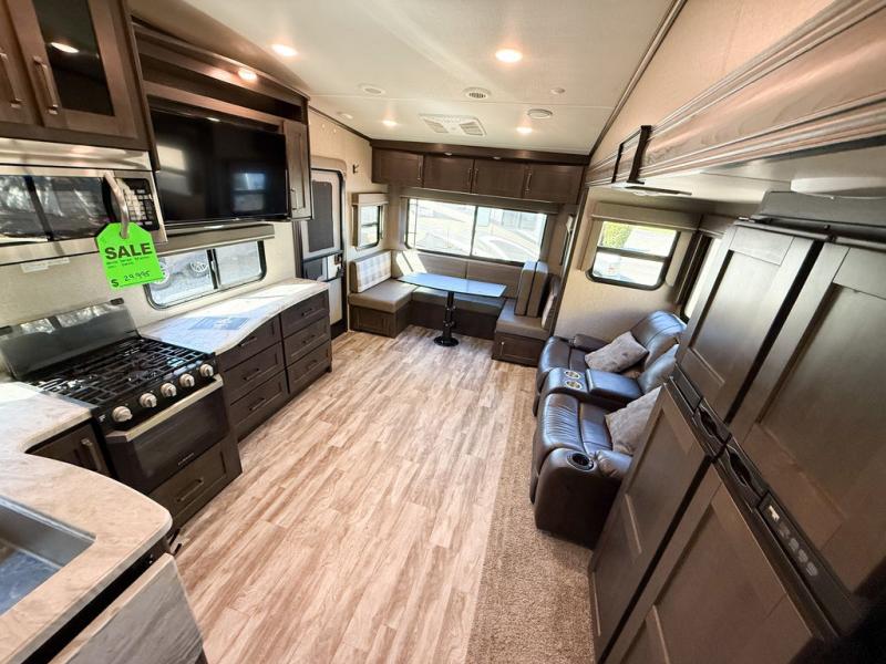 Load up lots of cold food in the 12-cu. ft. refrigerator to enjoy a weekend away from it all in this Reflection 150 Series fifth wheel! The dry food can be placed in the pantry and overhead cabinets, depending on where you want everything. You will enjoy having the appliances near by to make a warm meal in the L-shaped corner kitchen that is next to the entry. Head outside to sit under the 18' electric awning, and you can grab your camp chairs from the exterior unobstructed pass-through storage. You might prefer to dine at the U-shaped dinette with a view and watch TV from the theatre seating that has a massage feature. At night, you can get cleaned up in the 30" x 36" shower with skylight and fall quickly to sleep on your own queen bed.