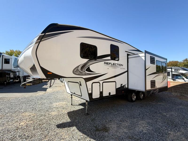 Each Reflection 150 Series fifth wheel by Grand Design allows you to use your half-ton and short-bed truck to tow thanks to the 90-degree turn radius pin box. The Universal All-In-One docking station, the LP Quick Connect, and the "One-Touch" automatic leveling system will make setting up and packing up easy for those weekenders or full-timers that like to move around to see the countryside. Inside, you will love the Gunstock fixtures and hardware, the louvered tread steps to the bedroom, the large panoramic windows, plus the many features in the mandatory packages. It's time to reflect on your wise choice, so choose a Reflection 150 Series today!