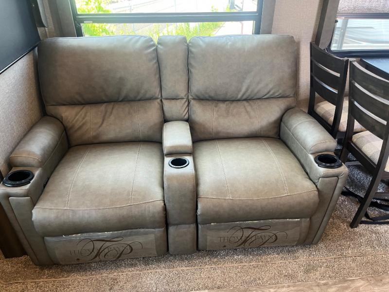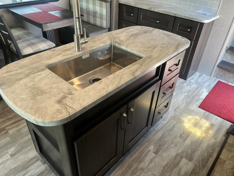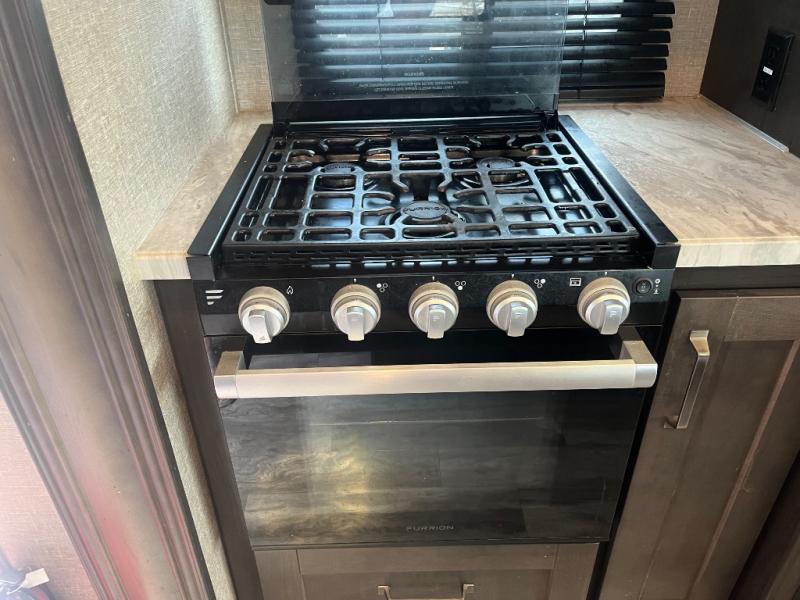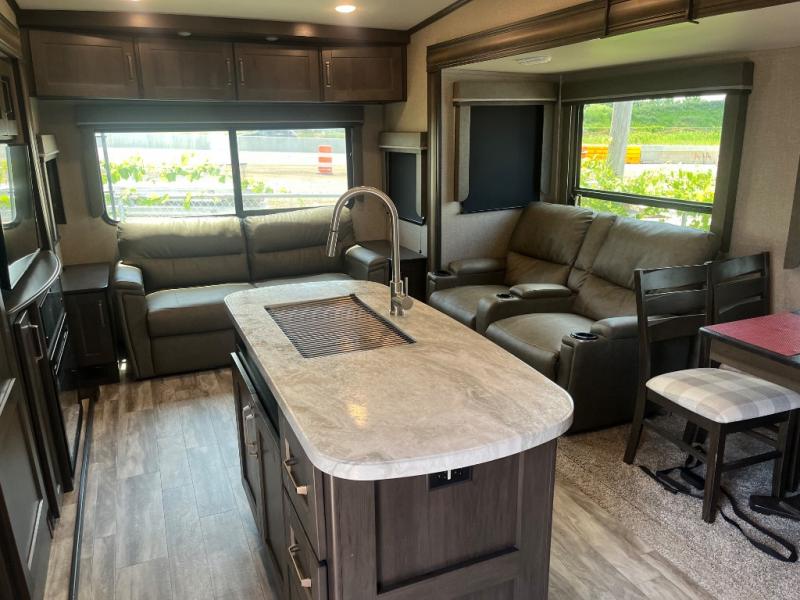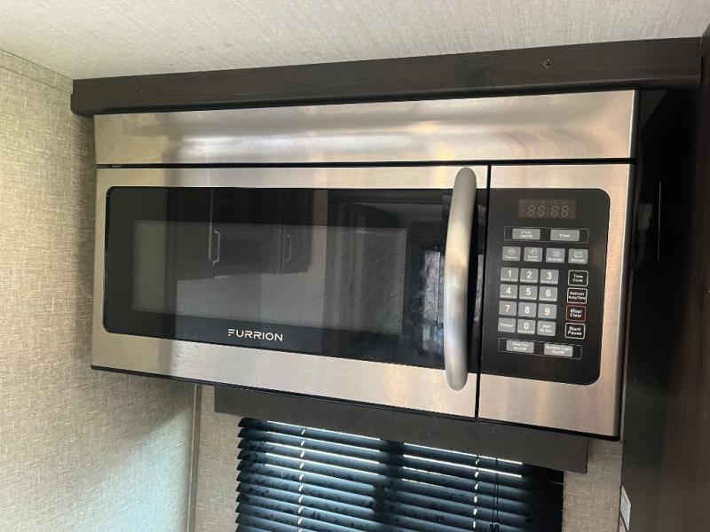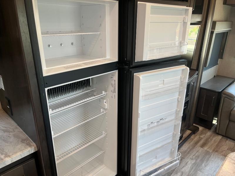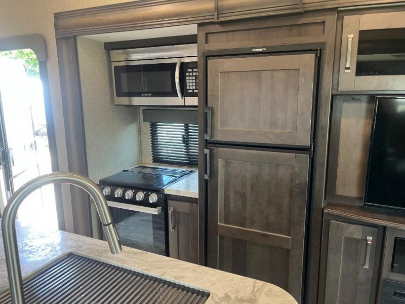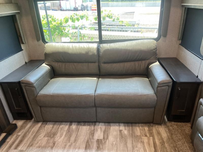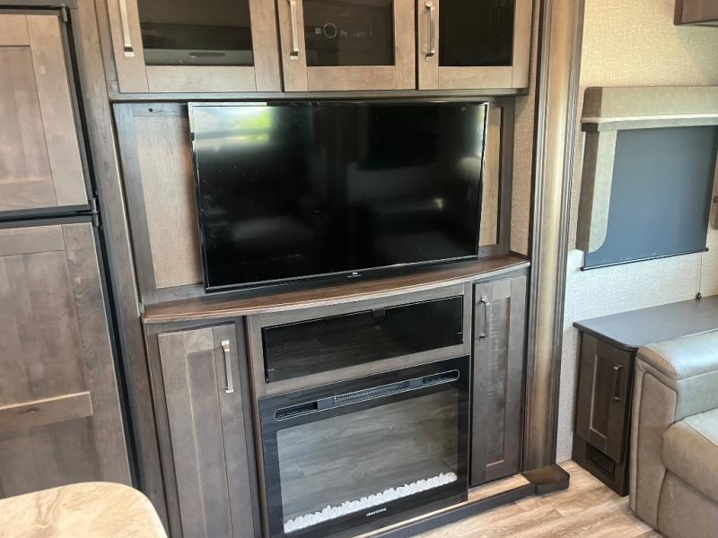Get ready to enjoy the inside just as much as the outdoors when you have this fifth wheel at the campgrounds. The interior offers a spacious main living and kitchen area thanks to the opposing slides which make walking around the kitchen island easy. The hutch offers more counter and storage space to prepare and serve meals, plus bring extra dishes and such, and the 10 cu. ft. refrigerator will hold your leftovers plus some. Relax on the tri-fold sofa that offers extra sleeping space for guests, and you will love the theatre seats while watching the 40" LED HDTV with fireplace below. There is a full bathroom with a walk-in shower, and the front bedroom allows you to sleep like a queen!