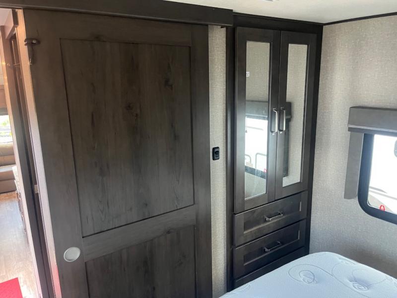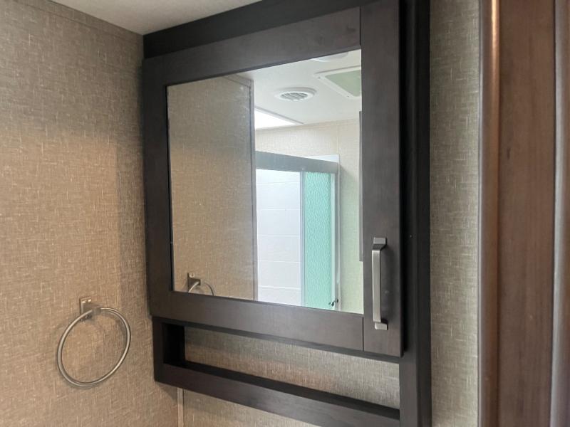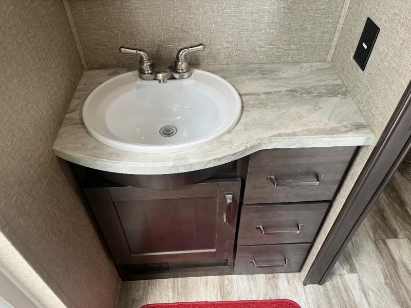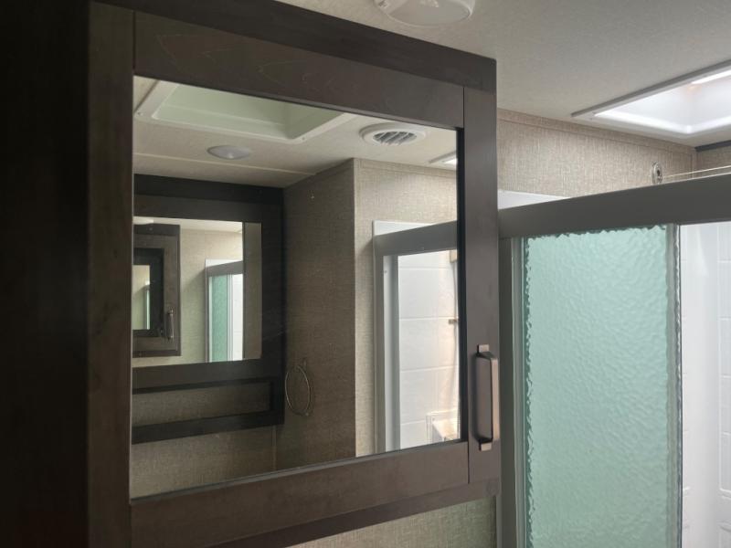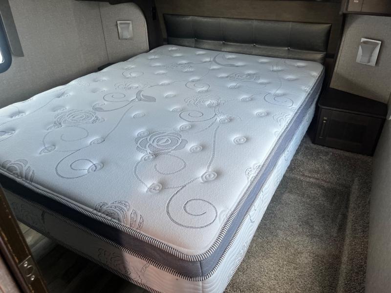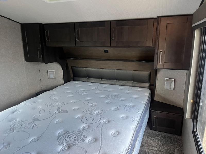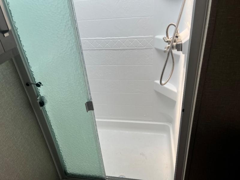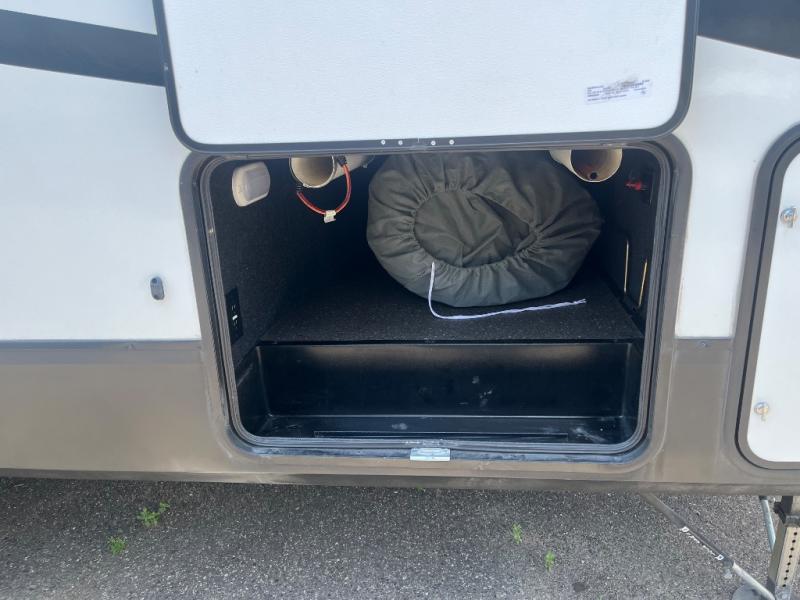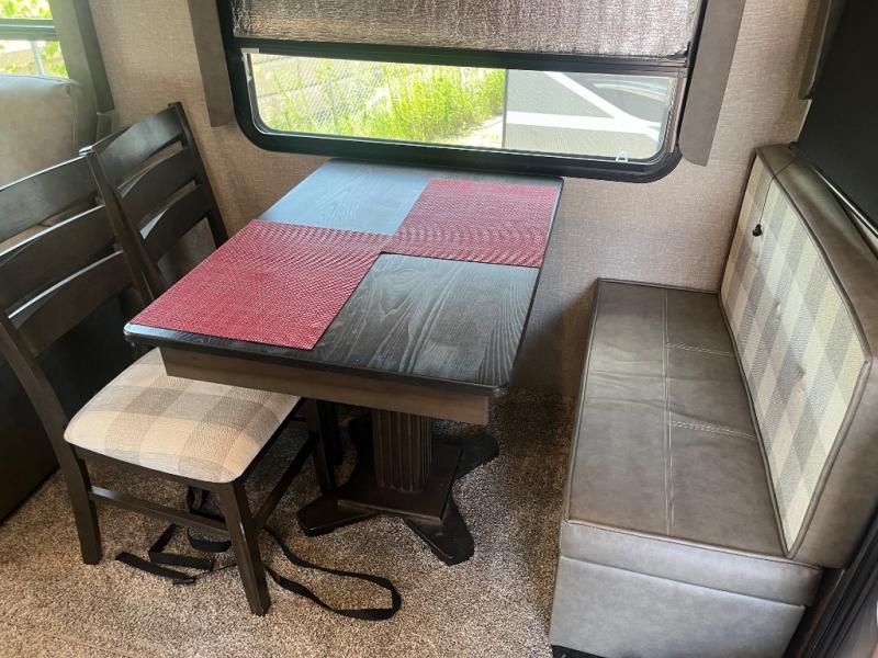 Get ready to enjoy the inside just as much as the outdoors when you have this fifth wheel at the campgrounds. The interior offers a spacious main living and kitchen area thanks to the opposing slides which make walking around the kitchen island easy. The hutch offers more counter and storage space to prepare and serve meals, plus bring extra dishes and such, and the 10 cu. ft. refrigerator will hold your leftovers plus some. Relax on the tri-fold sofa that offers extra sleeping space for guests, and you will love the theatre seats while watching the 40" LED HDTV with fireplace below. There is a full bathroom with a walk-in shower, and the front bedroom allows you to sleep like a queen!