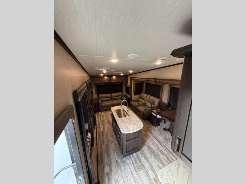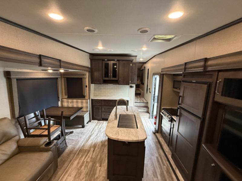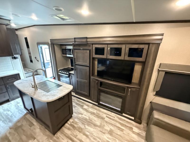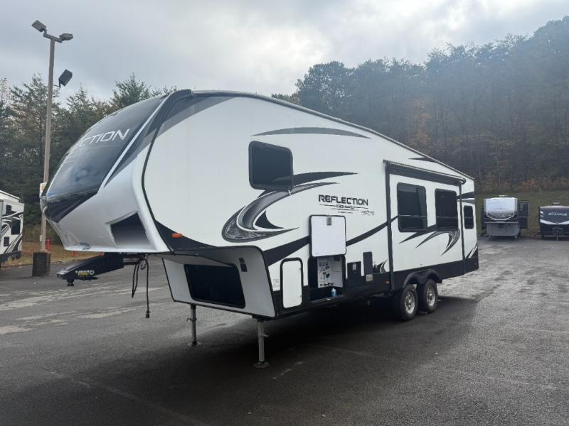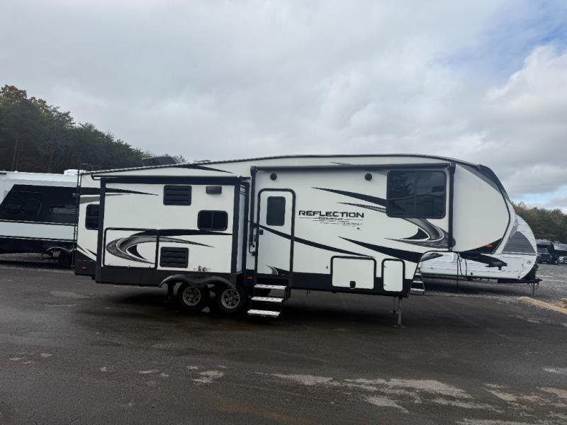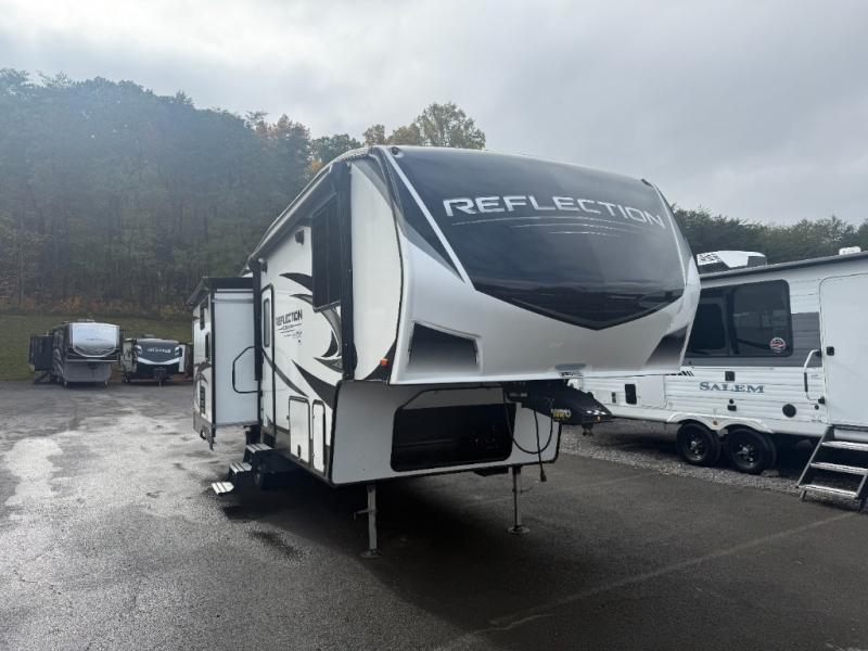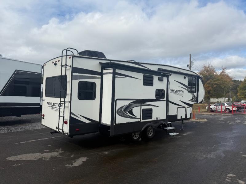 This Reflection 150 Series fifth wheel is perfect for anyone who wants quality and long-term value! The interior has everything you could possibly need. There is a private bedroom with a queen-size bed; a comfortable living area with a tri-fold sofa, theater seating, and an entertainment center; a fully equipped kitchen with an island, a hutch, and an 8-cubic foot refrigerator; and a full bathroom with a 30" x 36" shower with skylight. If that isn't enough, you will also find an exterior 28" TV, an exterior 1.6-cubic foot refrigerator, a 13' electric awning, and an unobstructed pass-through storage compartment.