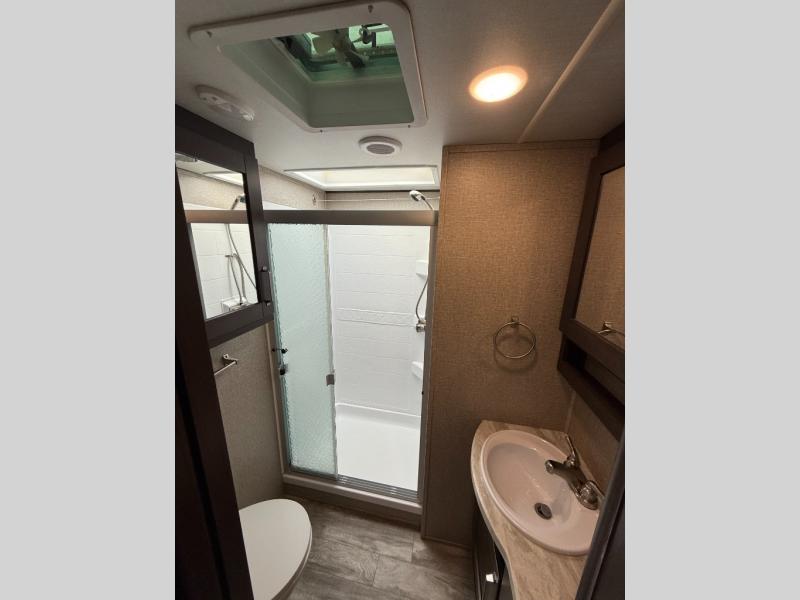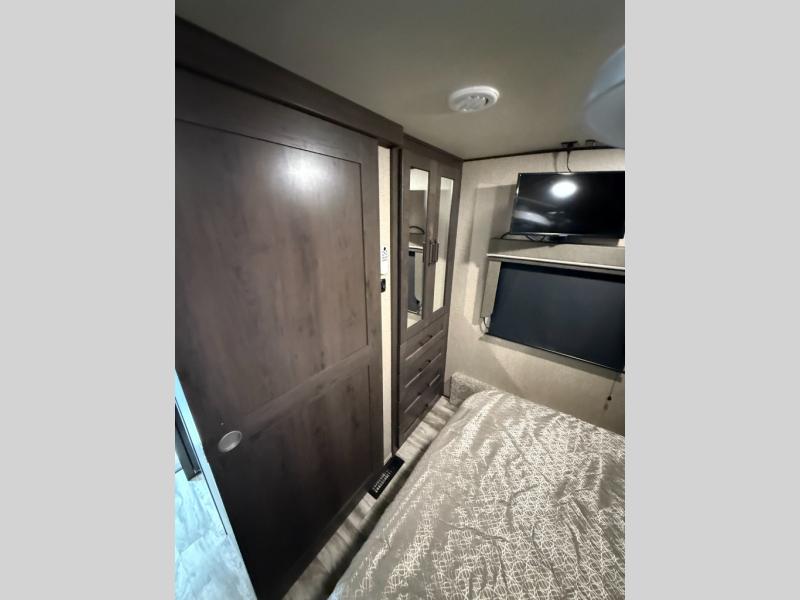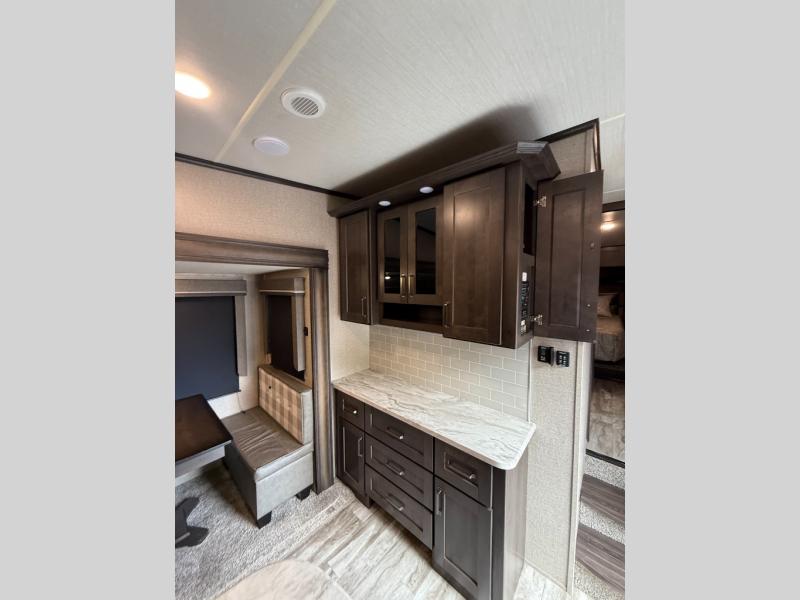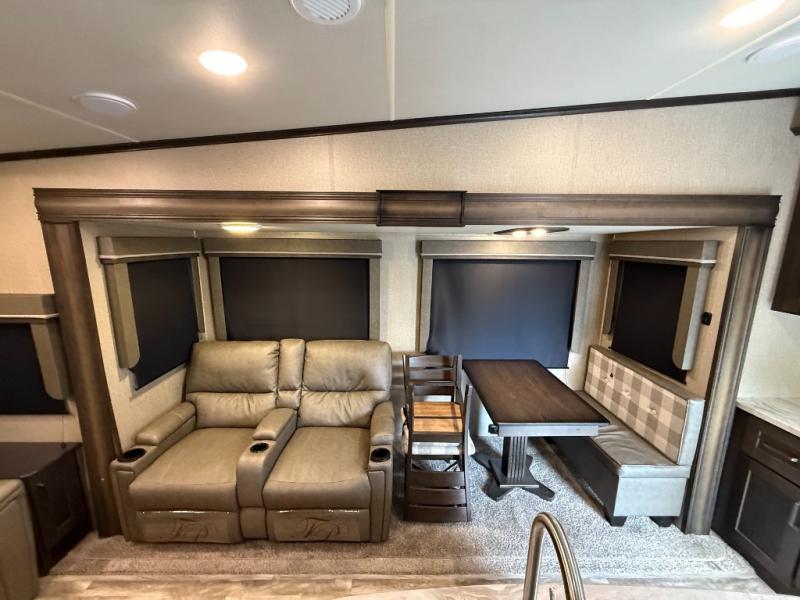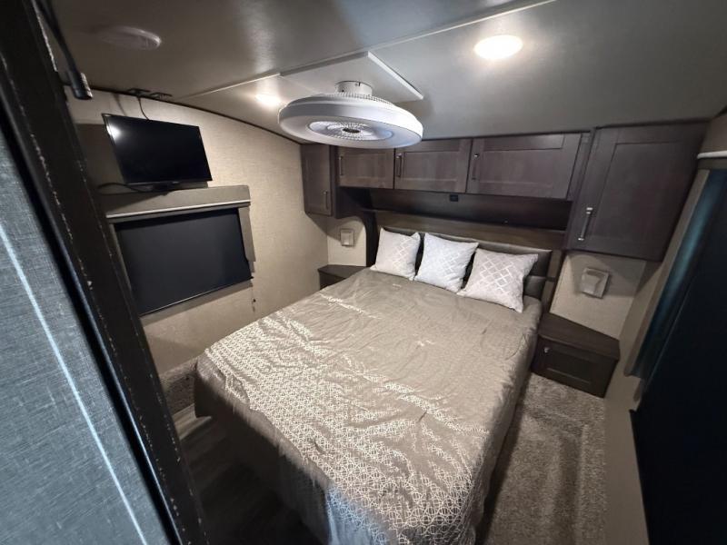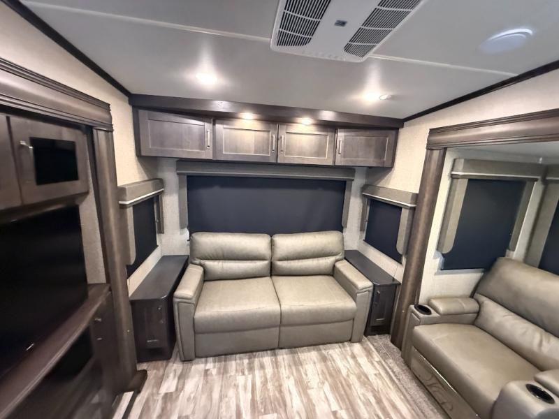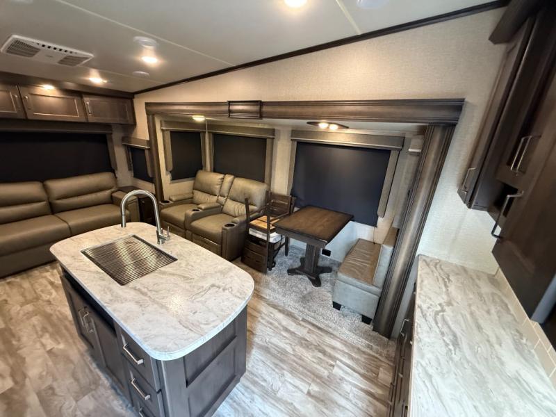 This Reflection 150 Series fifth wheel is perfect for anyone who wants quality and long-term value! The interior has everything you could possibly need. There is a private bedroom with a queen-size bed; a comfortable living area with a tri-fold sofa, theater seating, and an entertainment center; a fully equipped kitchen with an island, a hutch, and an 8-cubic foot refrigerator; and a full bathroom with a 30" x 36" shower with skylight. If that isn't enough, you will also find an exterior 28" TV, an exterior 1.6-cubic foot refrigerator, a 13' electric awning, and an unobstructed pass-through storage compartment.