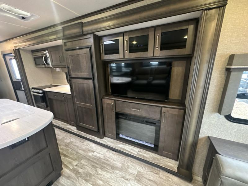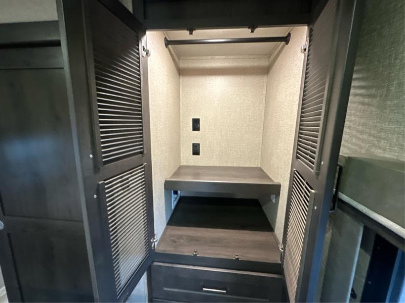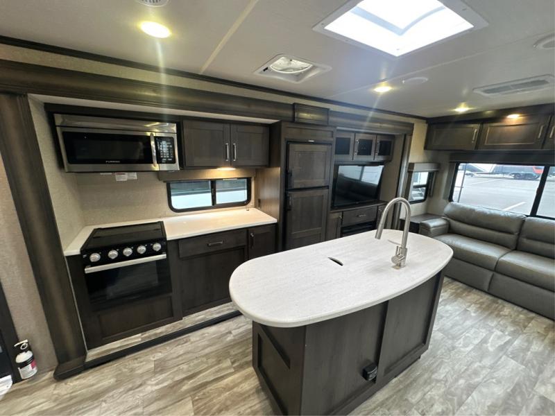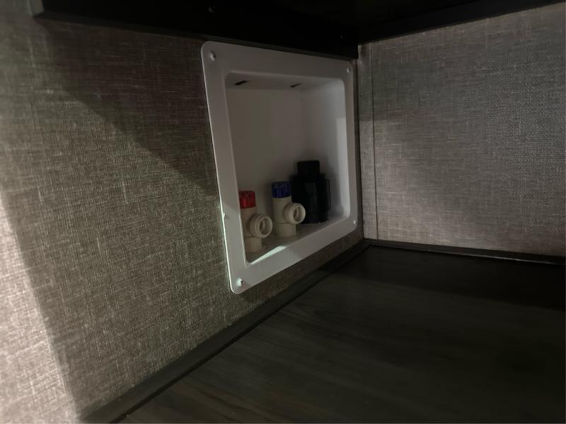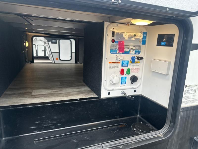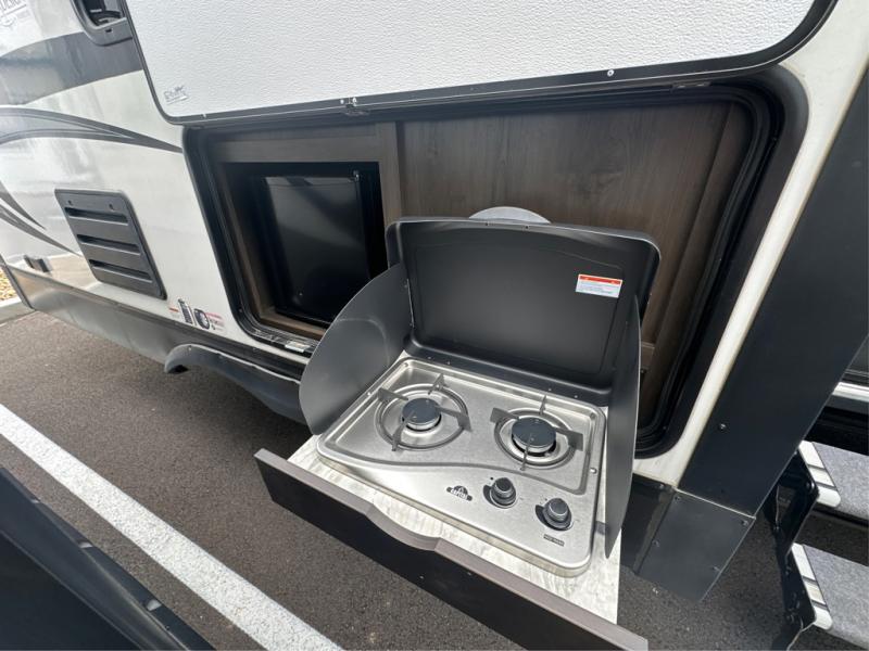 You and your spouse will love camping in this travel trailer! You can even bring along an extra guest or two to sleep on the rear tri-fold sofa. The theater seating is directly across from the entertainment center with a 40" HDTV and a fireplace below for a relaxing evening indoors. The kitchen has everything you will need to whip up a delicious meal including an island with a deep, undermount sink and a hutch to store your nice dishes. You can even breathe in some fresh air while you cook with the two burner cooktop at the outside kitchen. The full bathroom has a 30" x 36" shower with a skylight above for added natural lighting as you get ready and a linen closet to store your towels. The front private bedroom not only has wardrobes on either side of the queen bed, but also a wardrobe that is prepped to add the optional washer and dryer!