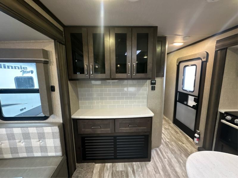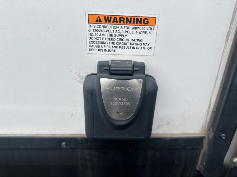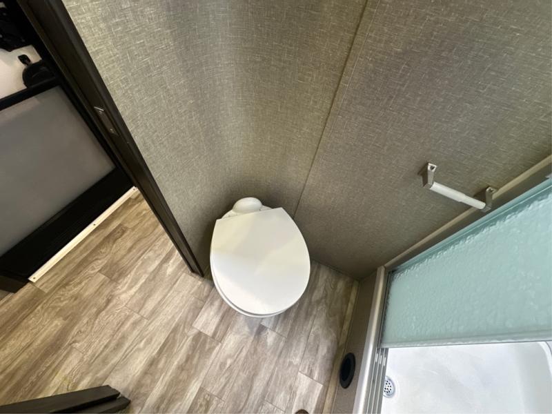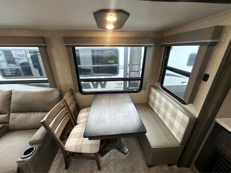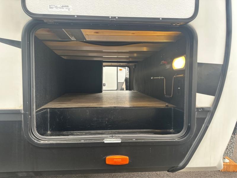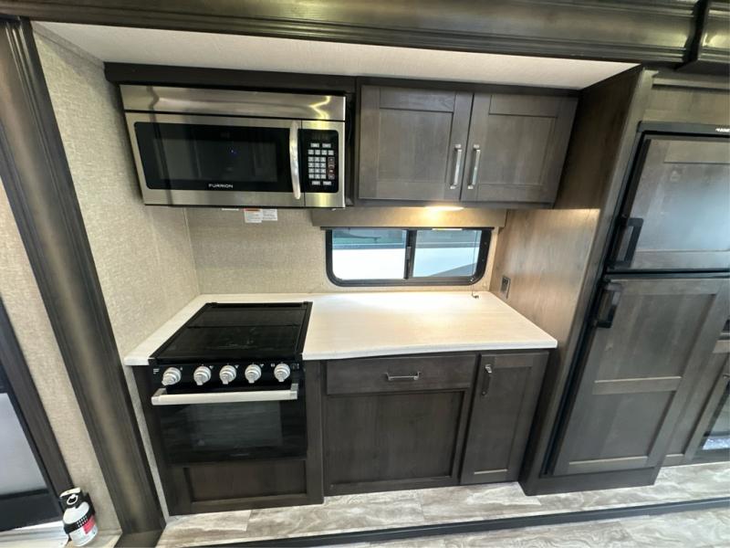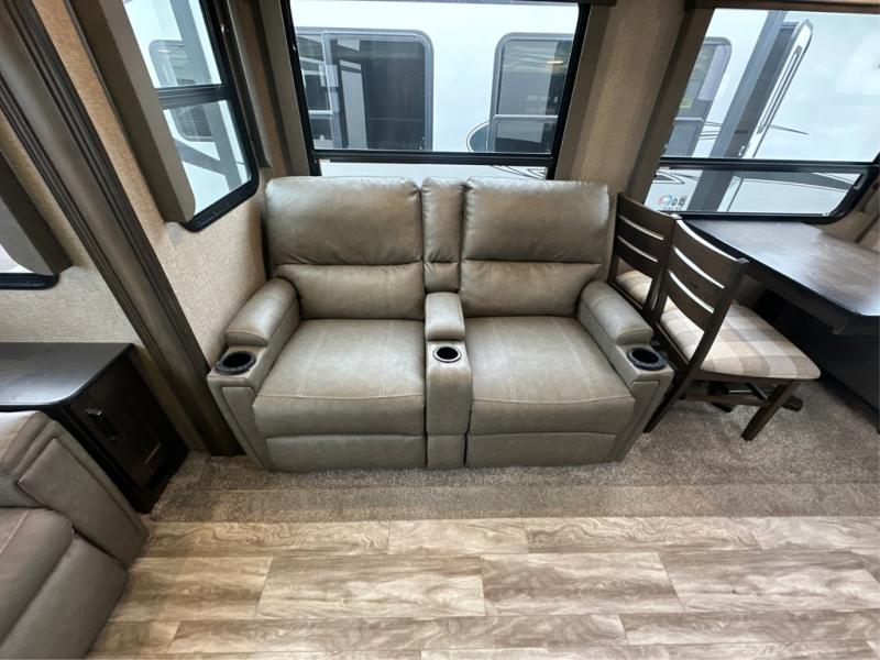 You and your spouse will love camping in this travel trailer! You can even bring along an extra guest or two to sleep on the rear tri-fold sofa. The theater seating is directly across from the entertainment center with a 40" HDTV and a fireplace below for a relaxing evening indoors. The kitchen has everything you will need to whip up a delicious meal including an island with a deep, undermount sink and a hutch to store your nice dishes. You can even breathe in some fresh air while you cook with the two burner cooktop at the outside kitchen. The full bathroom has a 30" x 36" shower with a skylight above for added natural lighting as you get ready and a linen closet to store your towels. The front private bedroom not only has wardrobes on either side of the queen bed, but also a wardrobe that is prepped to add the optional washer and dryer!