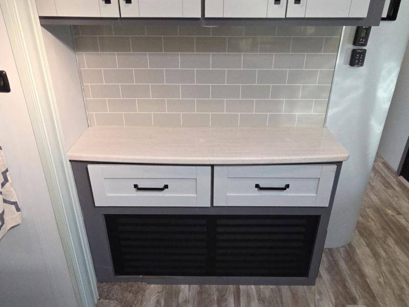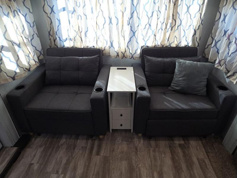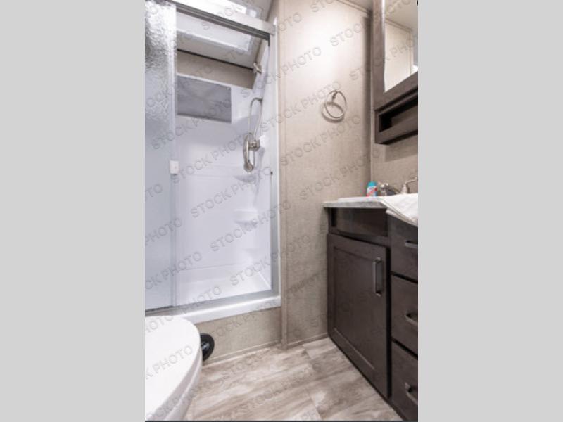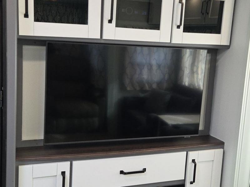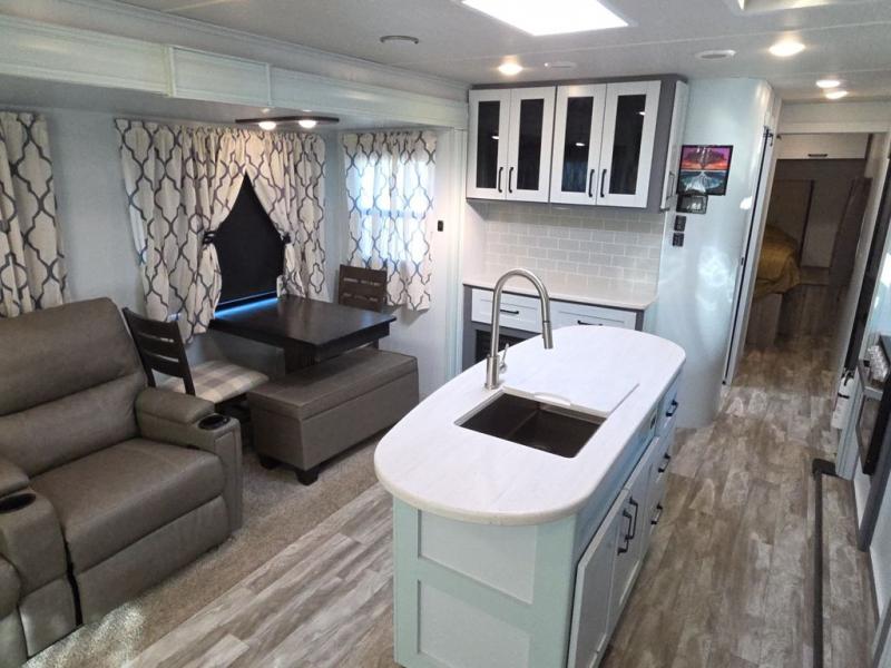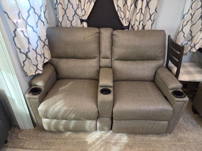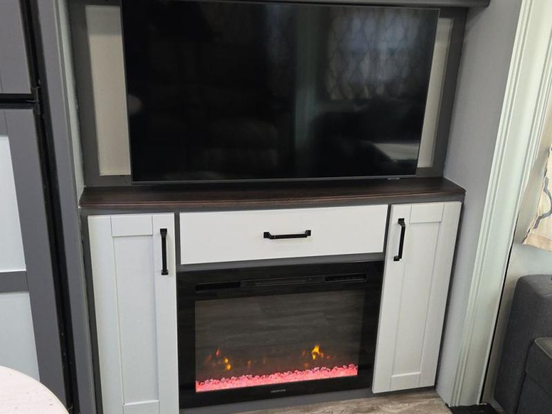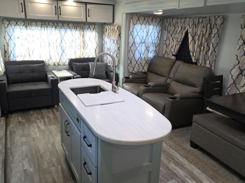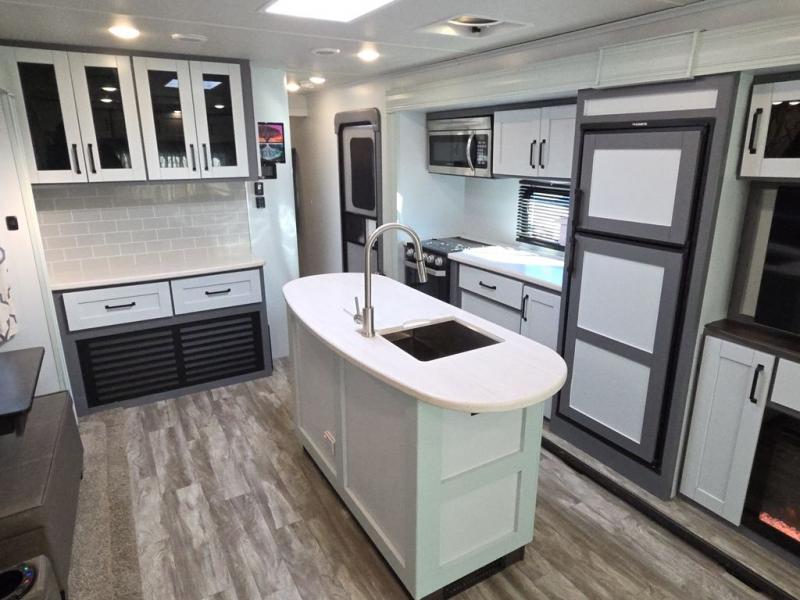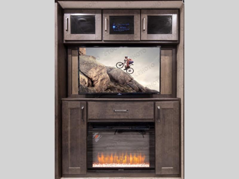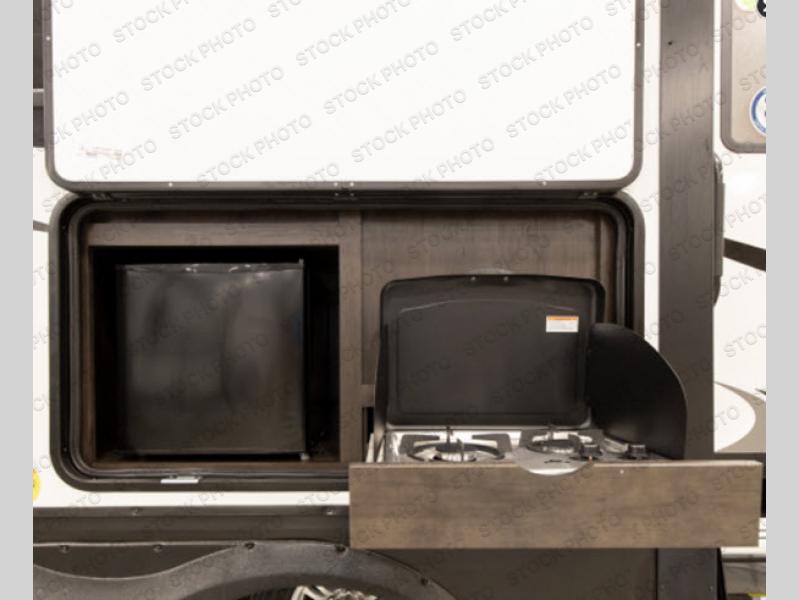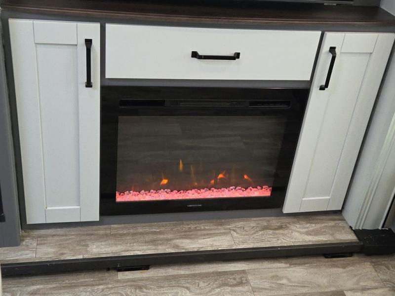 You and your spouse will love camping in this travel trailer! You can even bring along an extra guest or two to sleep on the rear tri-fold sofa. The theater seating is directly across from the entertainment center with a 40" HDTV and a fireplace below for a relaxing evening indoors. The kitchen has everything you will need to whip up a delicious meal including an island with a deep, undermount sink and a hutch to store your nice dishes. You can even breathe in some fresh air while you cook with the two burner cooktop at the outside kitchen. The full bathroom has a 30" x 36" shower with a skylight above for added natural lighting as you get ready and a linen closet to store your towels. The front private bedroom not only has wardrobes on either side of the queen bed, but also a wardrobe that is prepped to add the optional washer and dryer!
