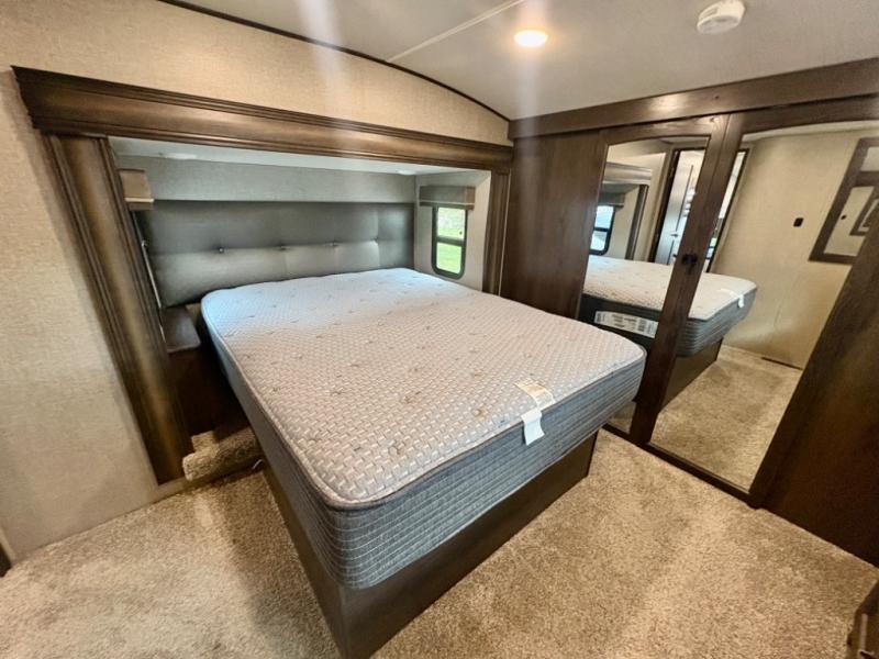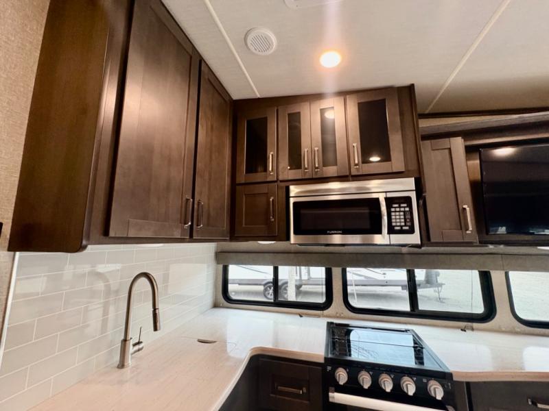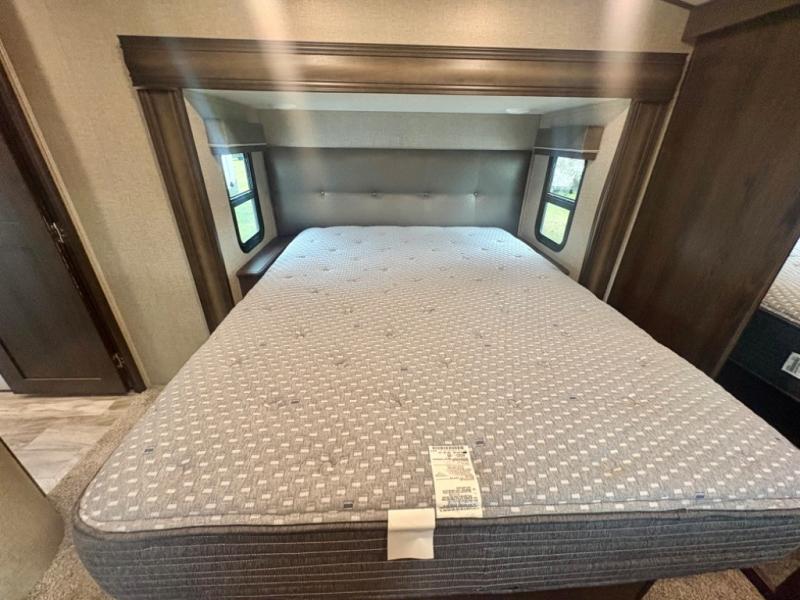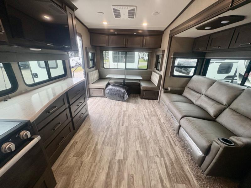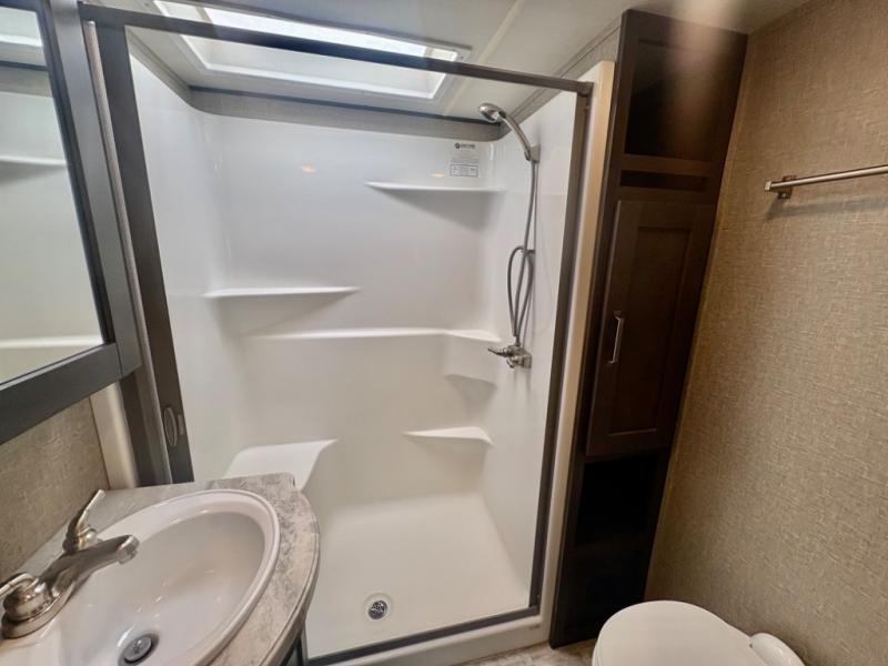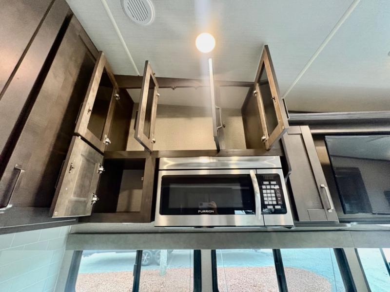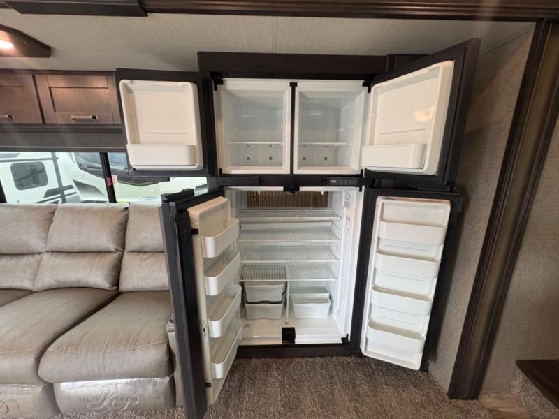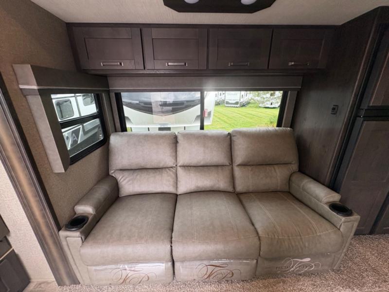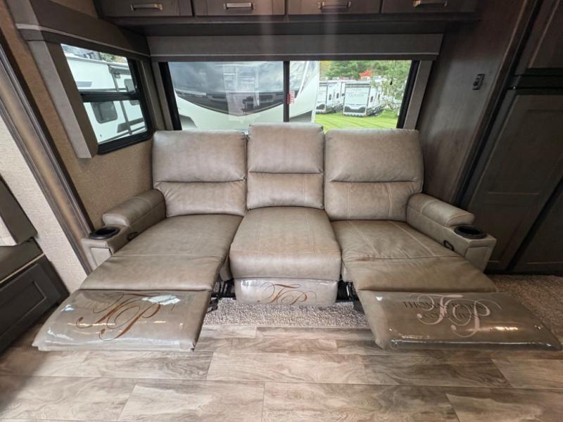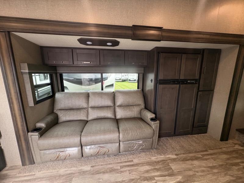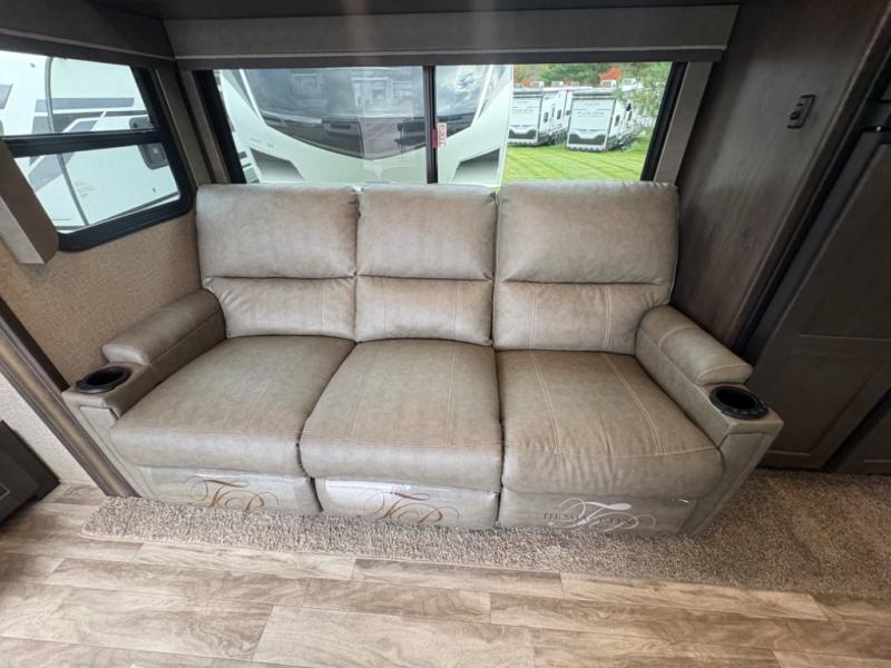 Don't pass up your chance to camp in real luxury with this fifth wheel! You will find a U-shaped lounge to your left as you enter the unit and 78" theater seating across from the entertainment center for your convenience. The gourmet kitchen has a 12 cu. ft. refrigerator to keep your beverages cold, a three burner cooktop to fry up some eggs, and a flip-up countertop extension to make meal prepping easier. Just up the stairs is the full bathroom with a 30" x 48" fiberglass shower with a skylight above for natural lighting as you get ready each morning. The front private bedroom has a full wall wardrobe that is prepped to add the optional washer and dryer, a queen bed that can be switched out for the optional king bed, and a dresser with an area prepped for a TV to be added!
