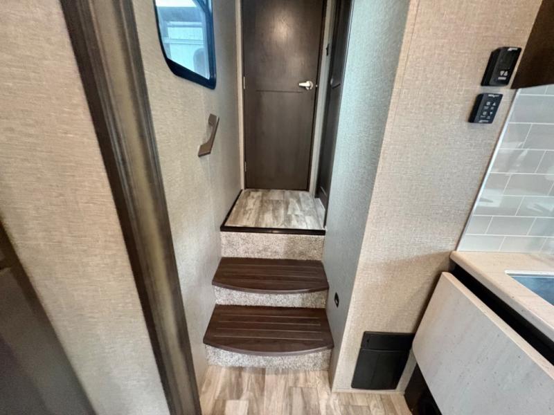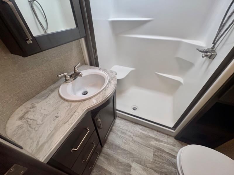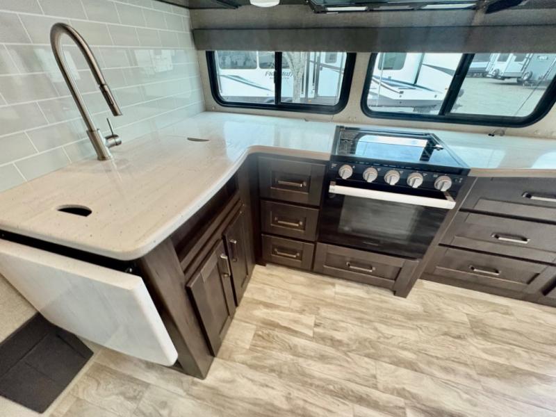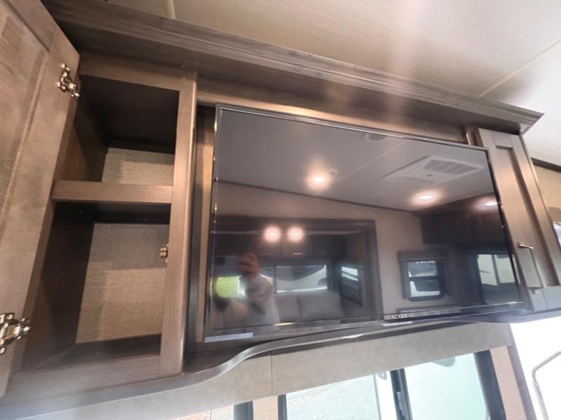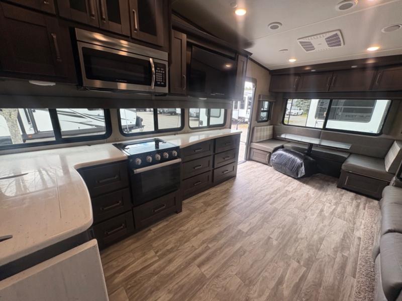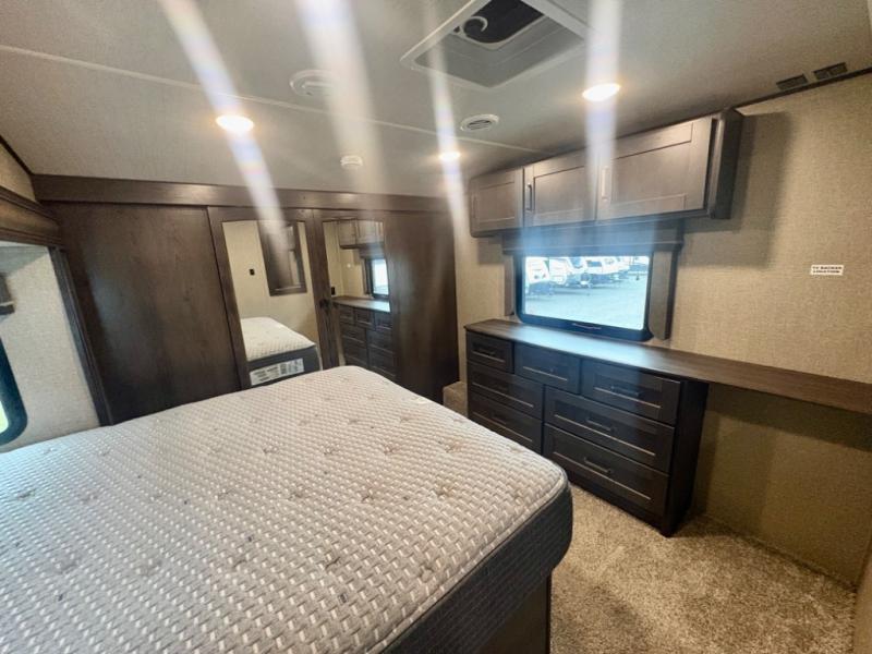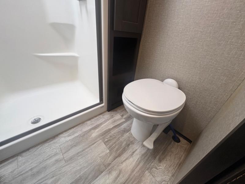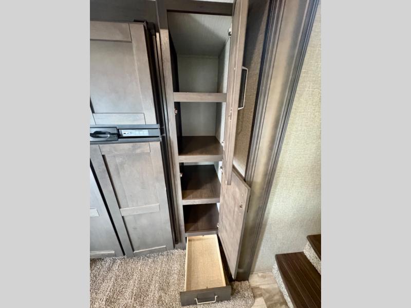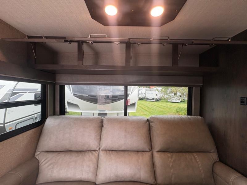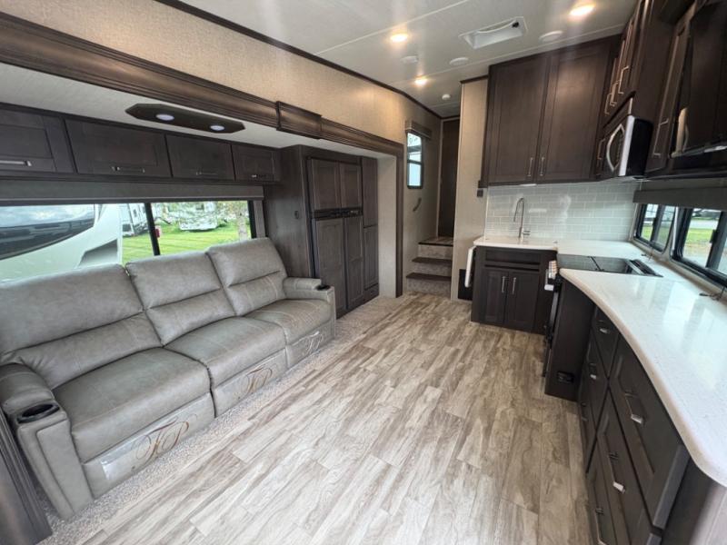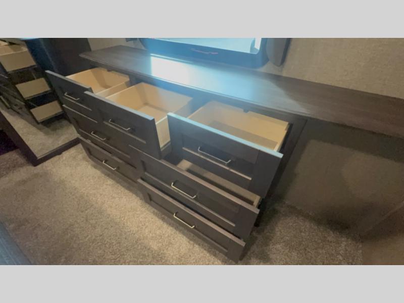 Don't pass up your chance to camp in real luxury with this fifth wheel! You will find a U-shaped lounge to your left as you enter the unit and 78" theater seating across from the entertainment center for your convenience. The gourmet kitchen has a 12 cu. ft. refrigerator to keep your beverages cold, a three burner cooktop to fry up some eggs, and a flip-up countertop extension to make meal prepping easier. Just up the stairs is the full bathroom with a 30" x 48" fiberglass shower with a skylight above for natural lighting as you get ready each morning. The front private bedroom has a full wall wardrobe that is prepped to add the optional washer and dryer, a queen bed that can be switched out for the optional king bed, and a dresser with an area prepped for a TV to be added!