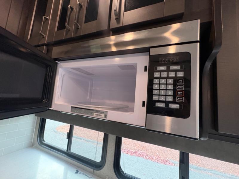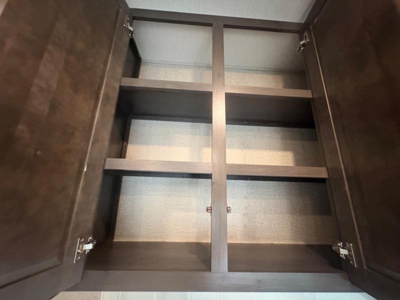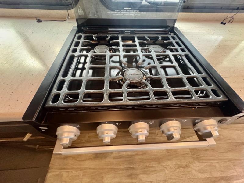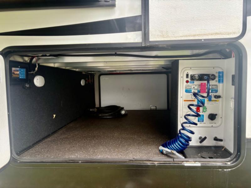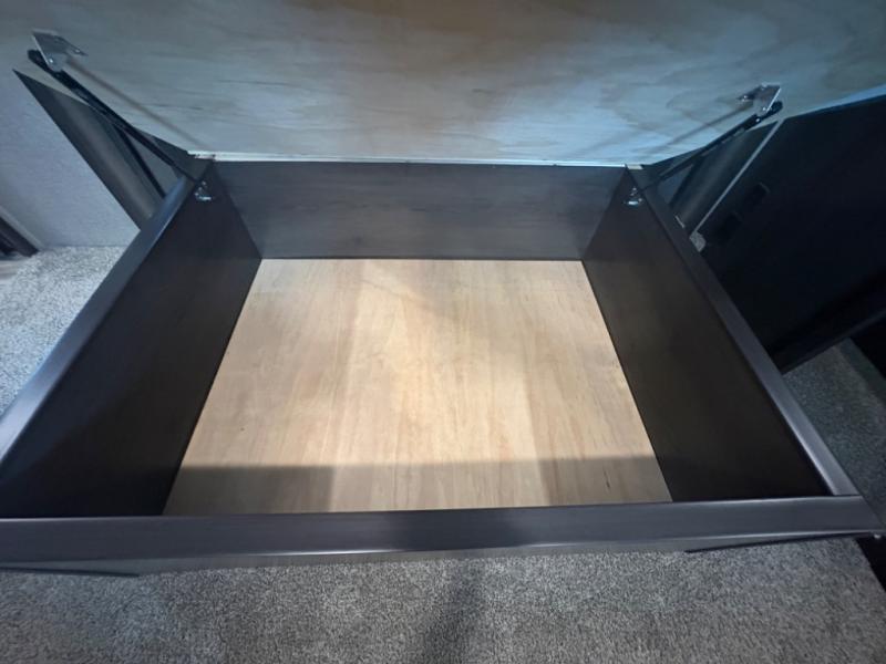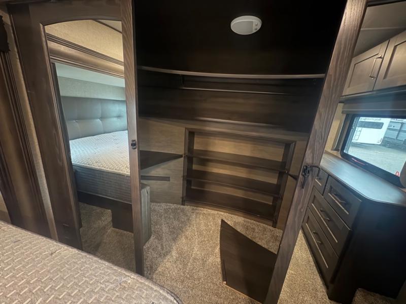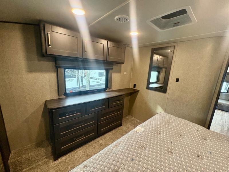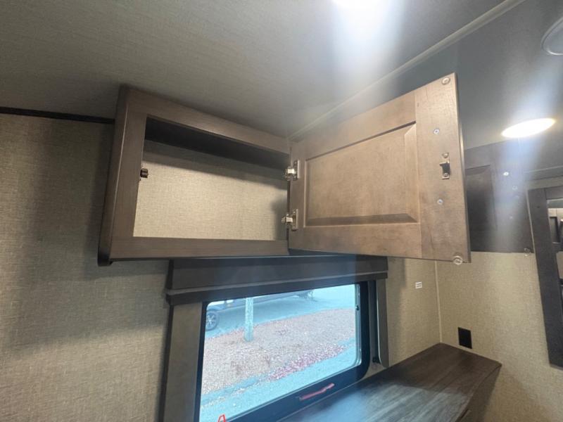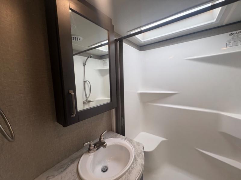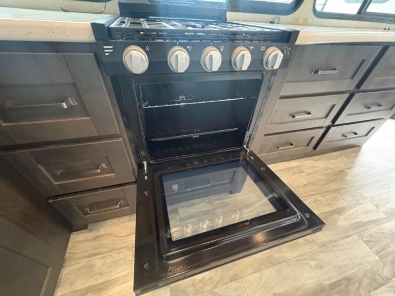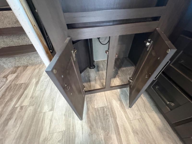 Don't pass up your chance to camp in real luxury with this fifth wheel! You will find a U-shaped lounge to your left as you enter the unit and 78" theater seating across from the entertainment center for your convenience. The gourmet kitchen has a 12 cu. ft. refrigerator to keep your beverages cold, a three burner cooktop to fry up some eggs, and a flip-up countertop extension to make meal prepping easier. Just up the stairs is the full bathroom with a 30" x 48" fiberglass shower with a skylight above for natural lighting as you get ready each morning. The front private bedroom has a full wall wardrobe that is prepped to add the optional washer and dryer, a queen bed that can be switched out for the optional king bed, and a dresser with an area prepped for a TV to be added!