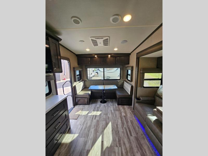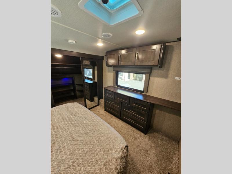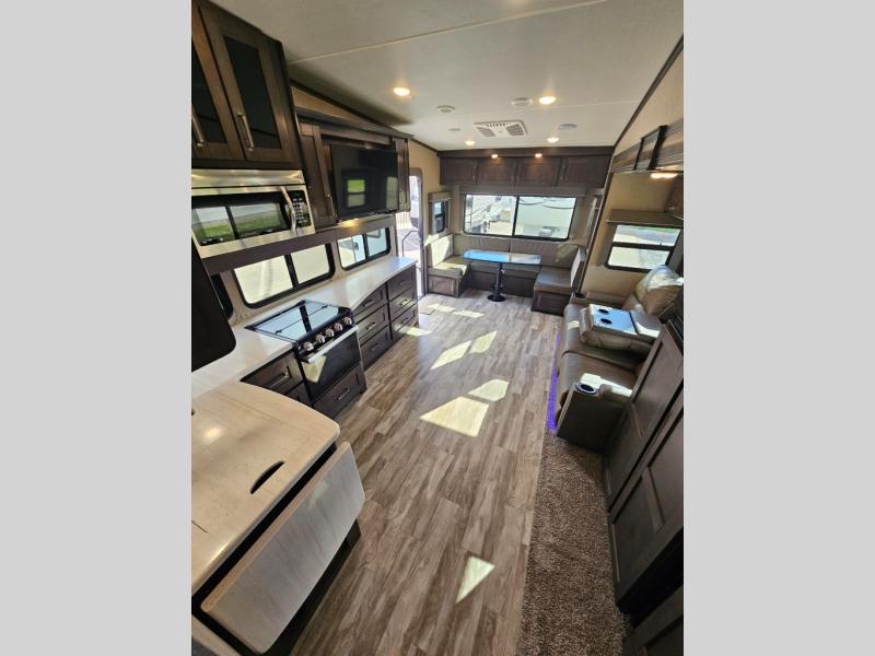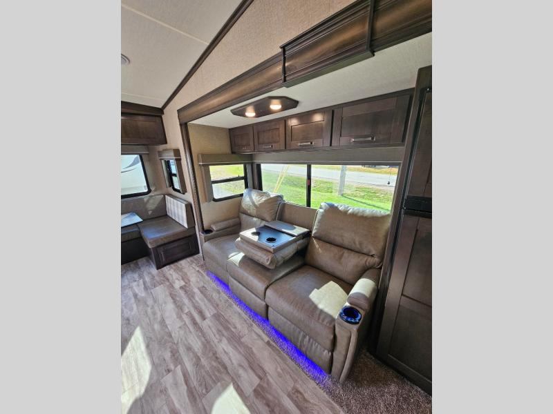 Don't pass up your chance to camp in real luxury with this fifth wheel! You will find a U-shaped lounge to your left as you enter the unit and 78" theater seating across from the entertainment center for your convenience. The gourmet kitchen has a 12 cu. ft. refrigerator to keep your beverages cold, a three burner cooktop to fry up some eggs, and a flip-up countertop extension to make meal prepping easier. Just up the stairs is the full bathroom with a 30" x 48" fiberglass shower with a skylight above for natural lighting as you get ready each morning. The front private bedroom has a full wall wardrobe that is prepped to add the optional washer and dryer, a queen bed that can be switched out for the optional king bed, and a dresser with an area prepped for a TV to be added!