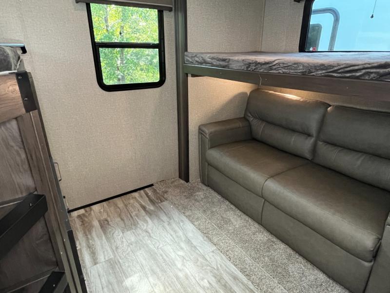 The kids will love camping in this fifth wheel! They can invite a friend or two to tag along thanks to the rear private bunkhouse having a bunk bed with a window and wardrobe below it, a flip bunk above a tri-fold sofa, and its very own private half bathroom, plus the booth dinette can transform into an extra sleeping space too. The theater seating is a great place to unwind at night in front of the entertainment center with a 40" HDTV and fireplace below it. Grab some eggs from the 12 cu. ft. refrigerator and fry them up on the three burner cooktop each morning. The kitchen island has a deep, seated stainless steel sink with a high rise faucet with a pull down sprayer to make clean up a breeze too. The dual entry bathroom has a radius shower with a skylight above for natural lighting as you get ready each morning, and enters right into the front private bedroom!