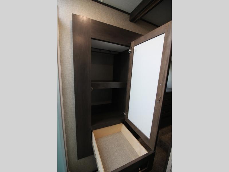 The kids will love camping in this fifth wheel! They can invite a friend or two to tag along thanks to the rear private bunkhouse having a bunk bed with a window and wardrobe below it, a flip bunk above a tri-fold sofa, and its very own private half bathroom, plus the booth dinette can transform into an extra sleeping space too. The theater seating is a great place to unwind at night in front of the entertainment center with a 40" HDTV and fireplace below it. Grab some eggs from the 12 cu. ft. refrigerator and fry them up on the three burner cooktop each morning. The kitchen island has a deep, seated stainless steel sink with a high rise faucet with a pull down sprayer to make clean up a breeze too. The dual entry bathroom has a radius shower with a skylight above for natural lighting as you get ready each morning, and enters right into the front private bedroom!