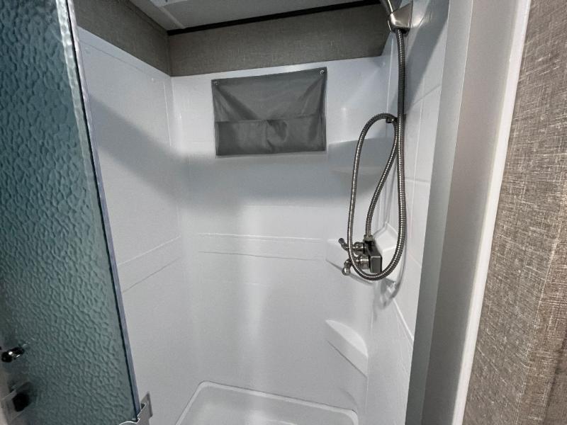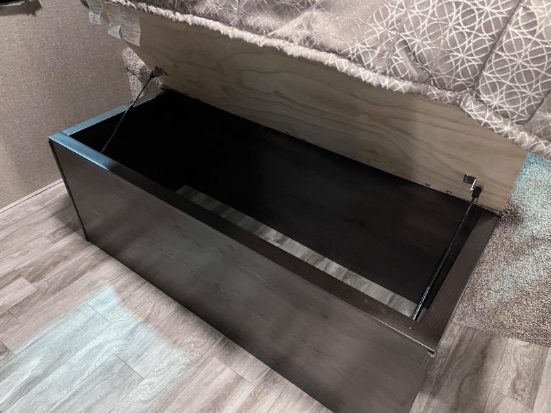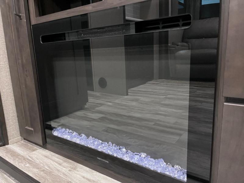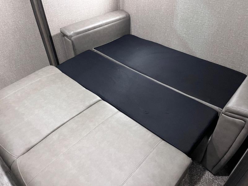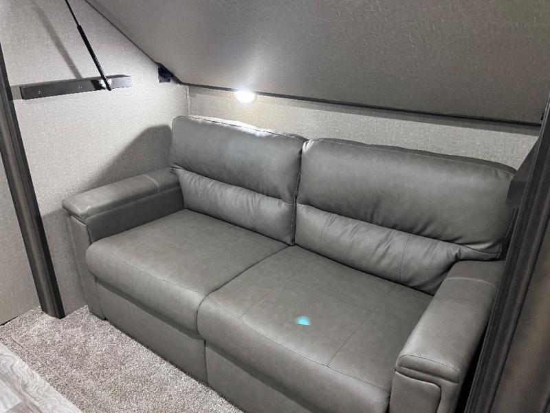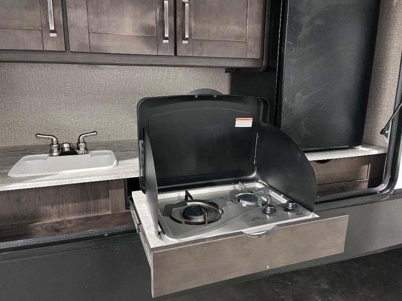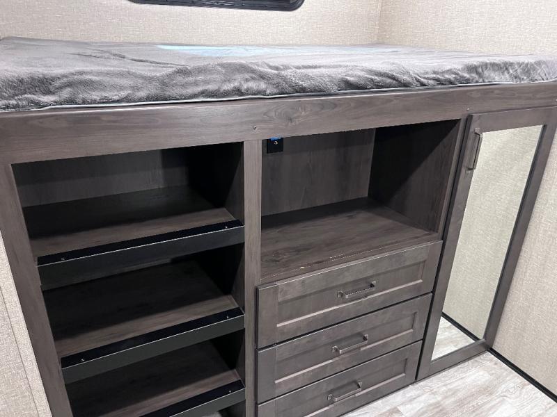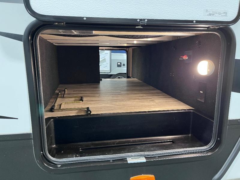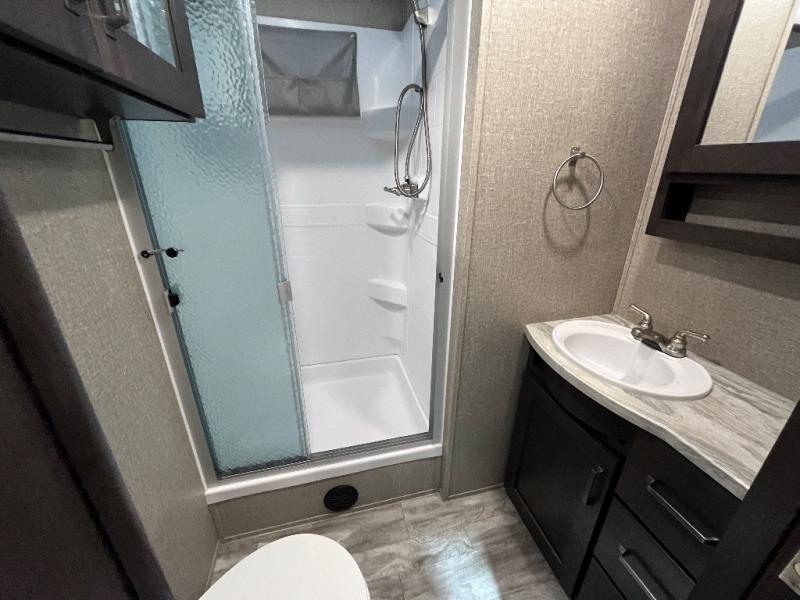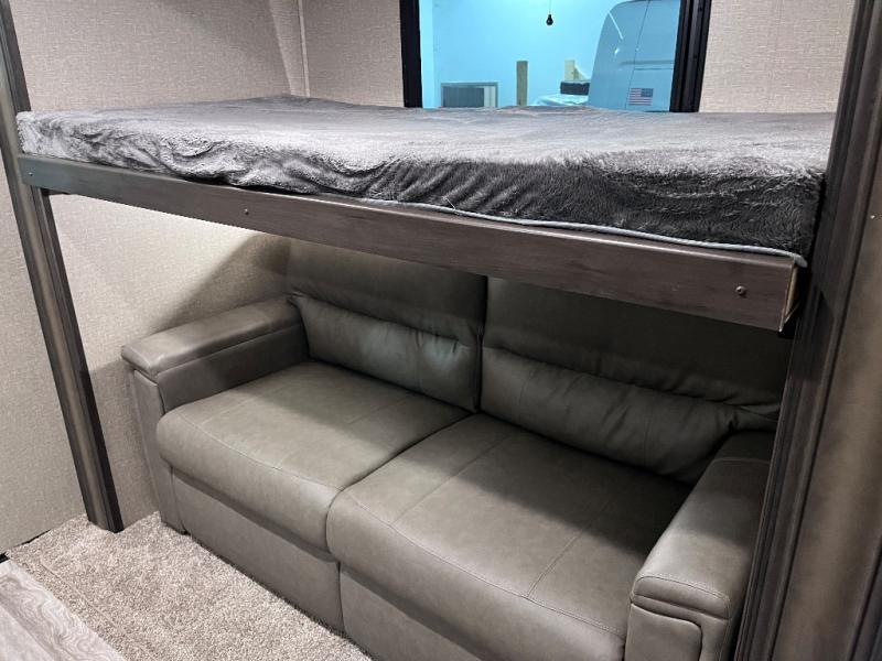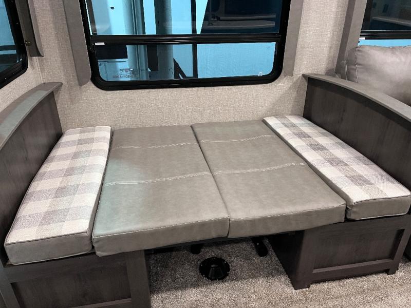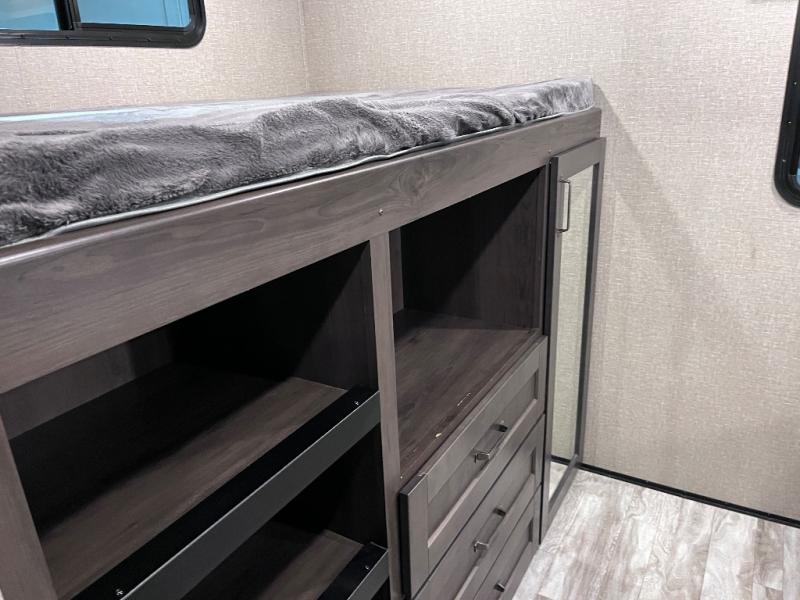 The kids will love camping in this travel trailer with the rear private bunkhouse! It features a flip bunk above a tri-fold sofa and a bunk bed with a window and a wardrobe below it. There is not only one hutch to store your nice dishes, but also a second hutch, and a kitchen island to make your meal prepping easier. The theater seating is directly across from the entertainment center with a 40" HDTV and fireplace below it, and the booth dinette is right next to it ready for you to enjoy your meals, play card games, and transform into an extra sleeping space. You can rinse off your feet at the outside shower then head indoors to take a hot shower in the 30" x 36" shower with a skylight above for added natural lighting!