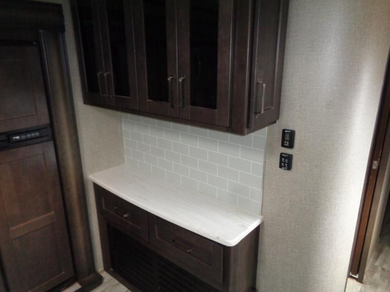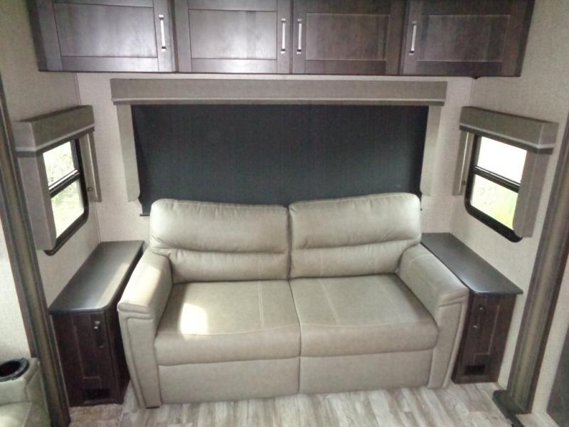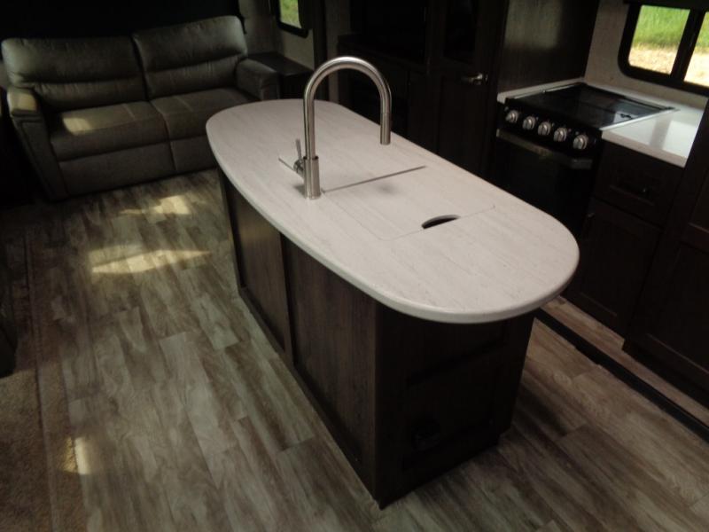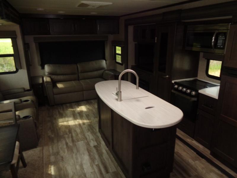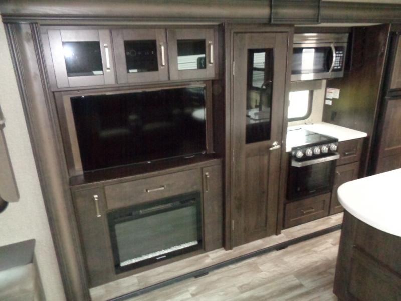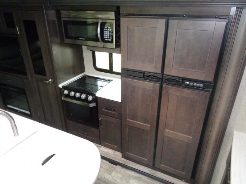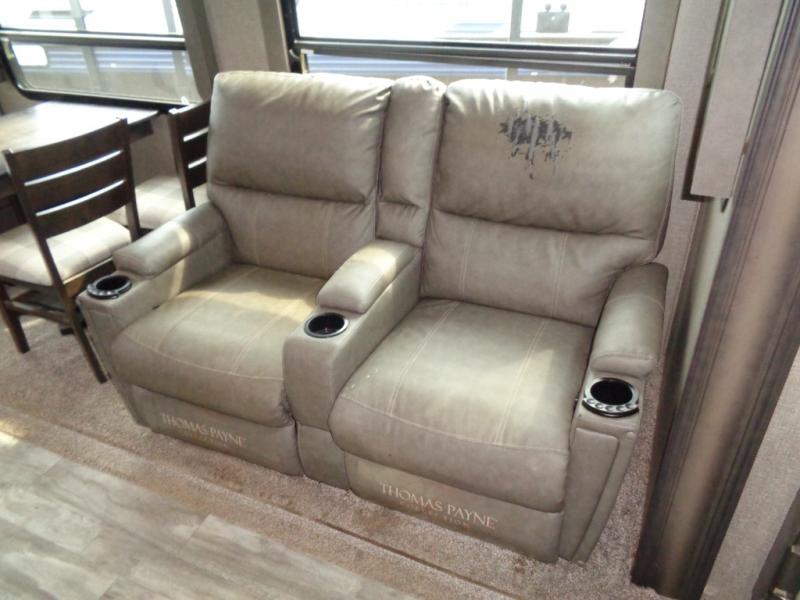You won't want to camp any other way once you step inside this travel trailer! You can relax in true comfort each night on either the rear tri-fold sofa or the theater seating which is directly across from the entertainment center with a 40" HDTV and fireplace. You can prepare delicious home cooked meals in the gourmet kitchen with the three burner cooktop and the kitchen island, plus there is a 12 cu. ft. refrigerator to store any leftovers and a hutch to store your nice dishes. You can even choose to add the optional free standing dinette with ottoman storage to enjoy your meals at. Start each morning feeling squeaky clean after showering in the 30" x 36" shower with a skylight above for added natural lighting!