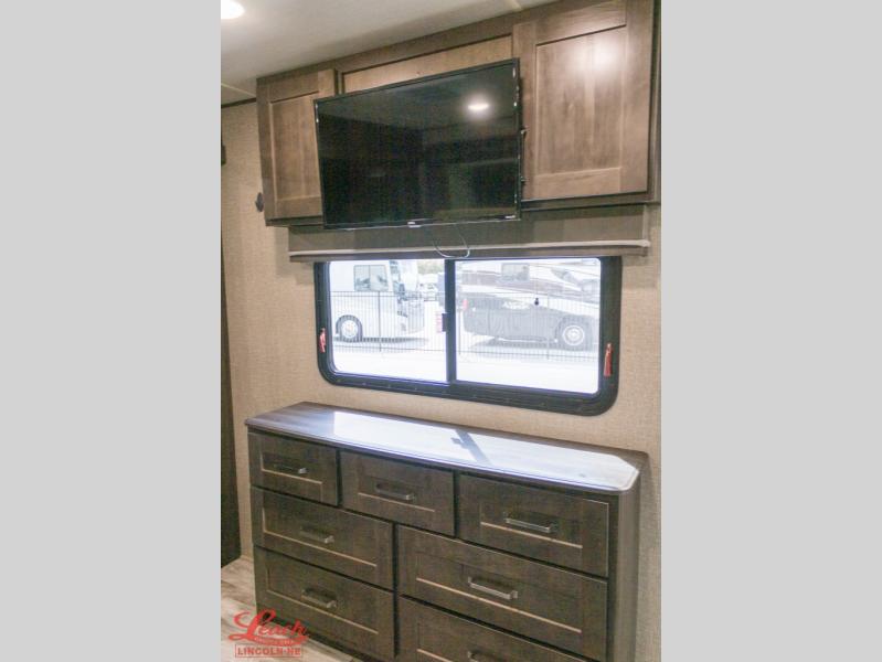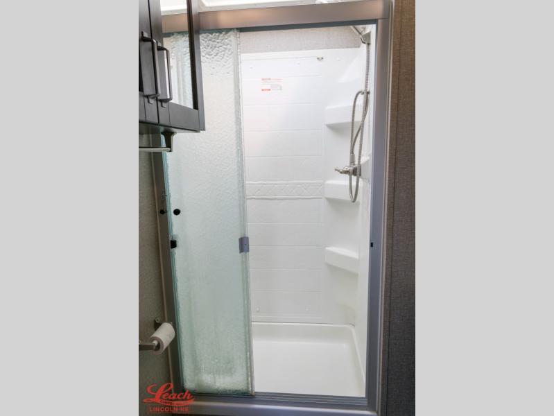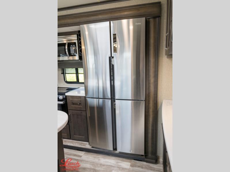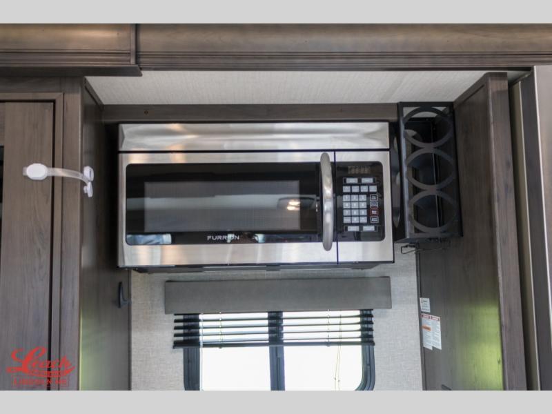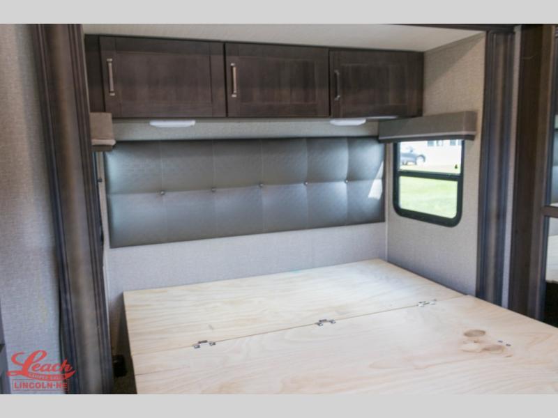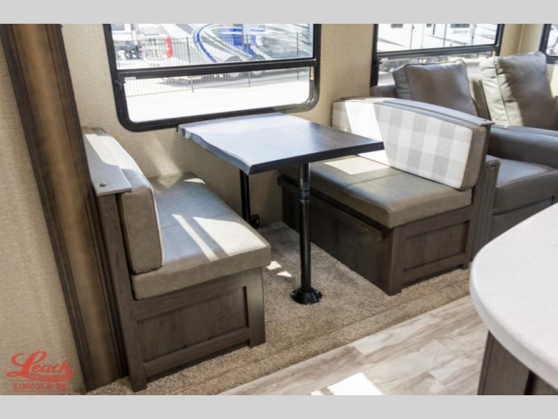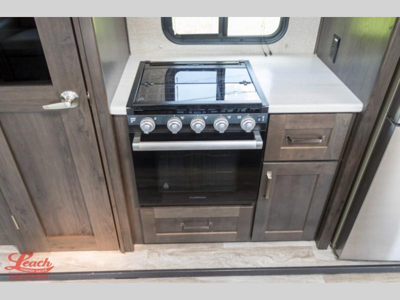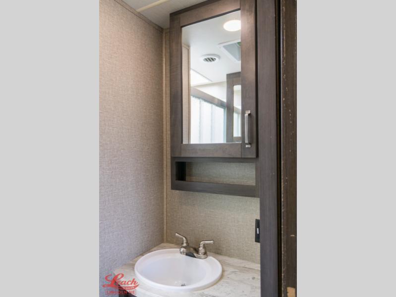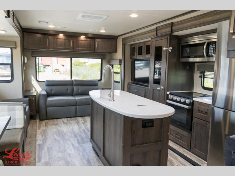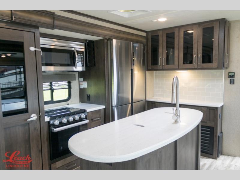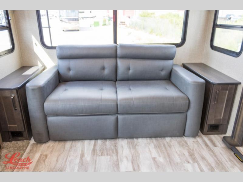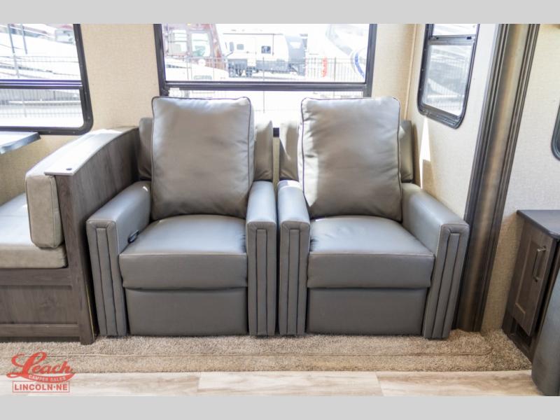 You won't want to camp any other way once you step inside this travel trailer! You can relax in true comfort each night on either the rear tri-fold sofa or the theater seating which is directly across from the entertainment center with a 40" HDTV and fireplace. You can prepare delicious home cooked meals in the gourmet kitchen with the three burner cooktop and the kitchen island, plus there is a 12 cu. ft. refrigerator to store any leftovers and a hutch to store your nice dishes. You can even choose to add the optional free standing dinette with ottoman storage to enjoy your meals at. Start each morning feeling squeaky clean after showering in the 30" x 36" shower with a skylight above for added natural lighting!