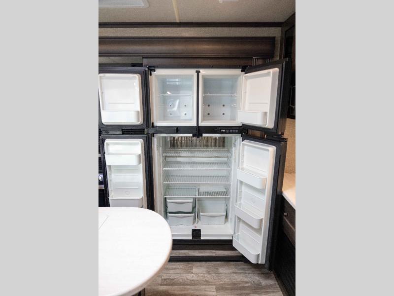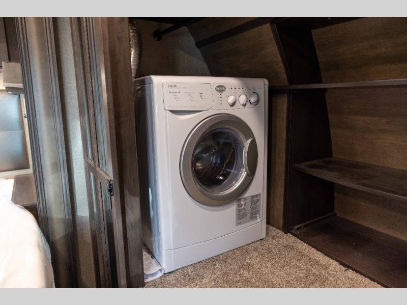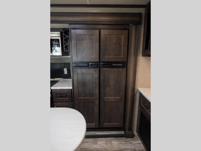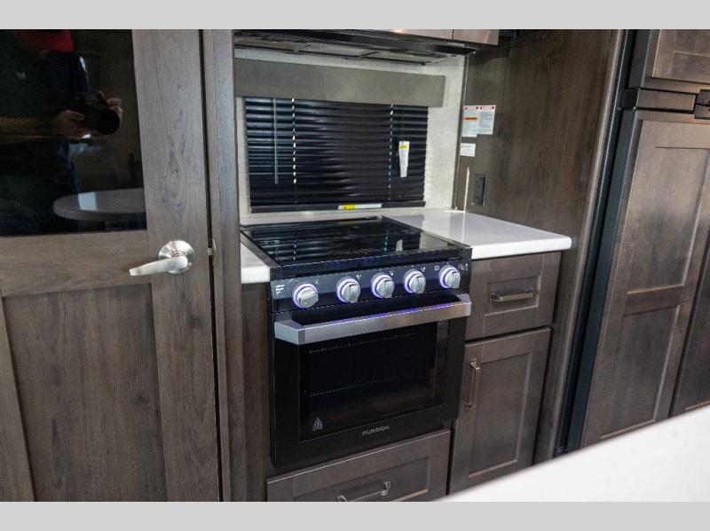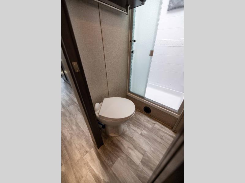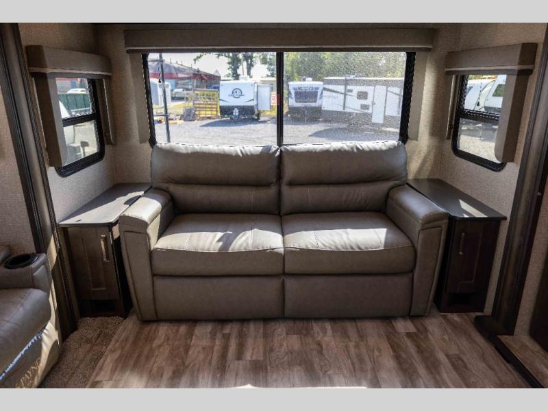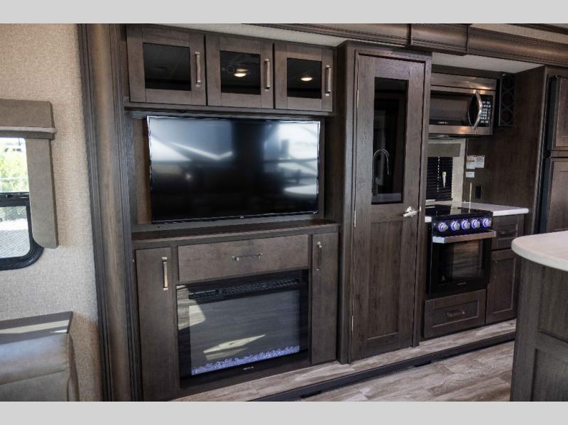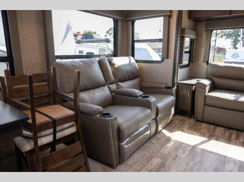 You won't want to camp any other way once you step inside this travel trailer! You can relax in true comfort each night on either the rear tri-fold sofa or the theater seating which is directly across from the entertainment center with a 40" HDTV and fireplace. You can prepare delicious home cooked meals in the gourmet kitchen with the three burner cooktop and the kitchen island, plus there is a 12 cu. ft. refrigerator to store any leftovers and a hutch to store your nice dishes. You can even choose to add the optional free standing dinette with ottoman storage to enjoy your meals at. Start each morning feeling squeaky clean after showering in the 30" x 36" shower with a skylight above for added natural lighting!