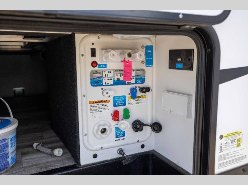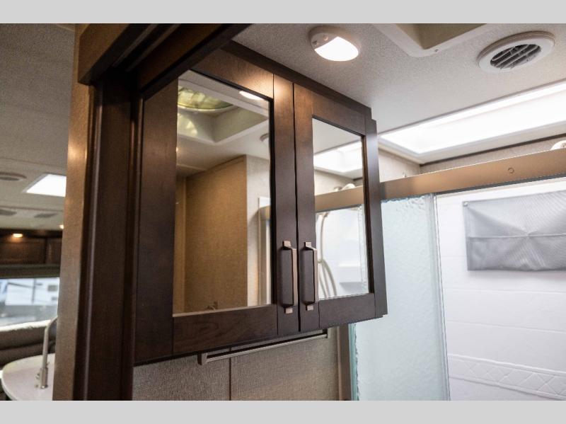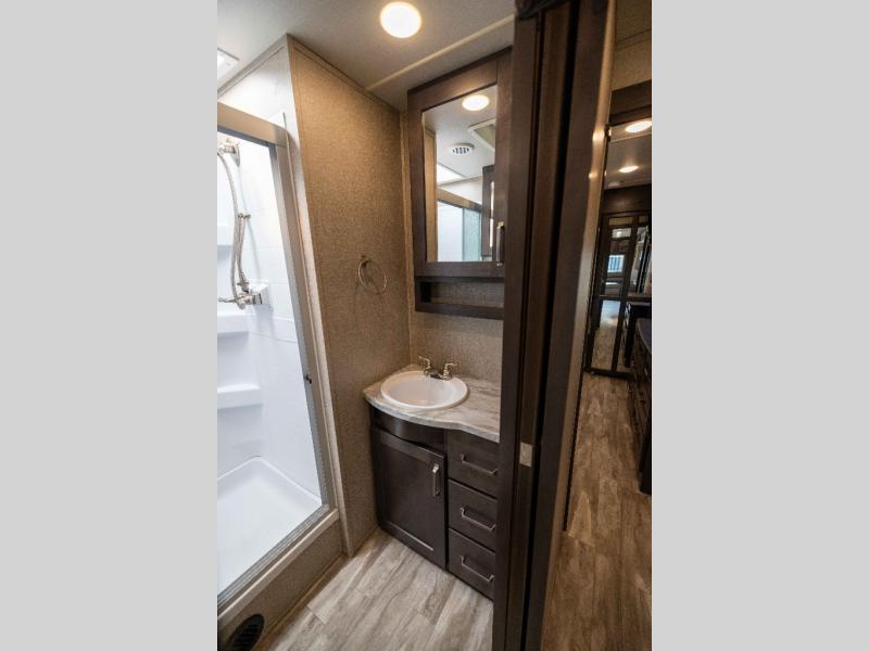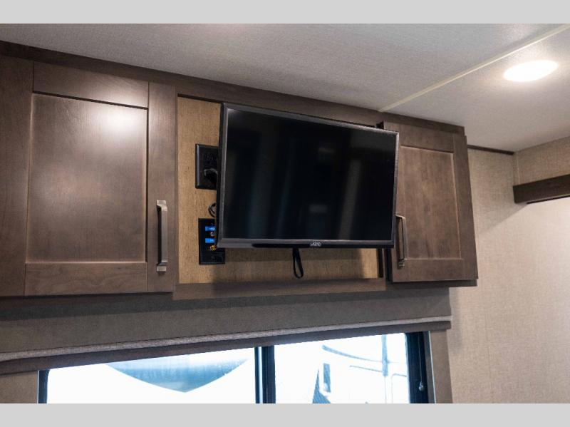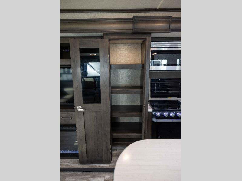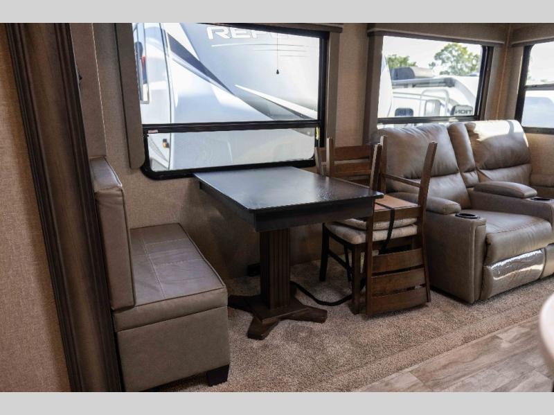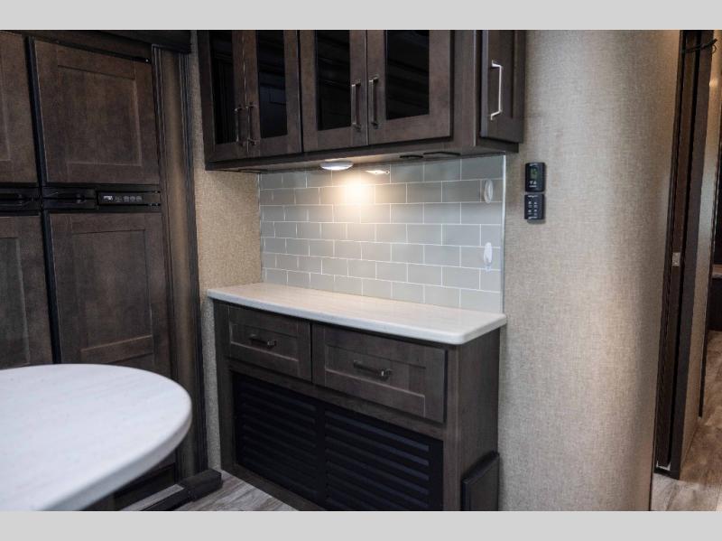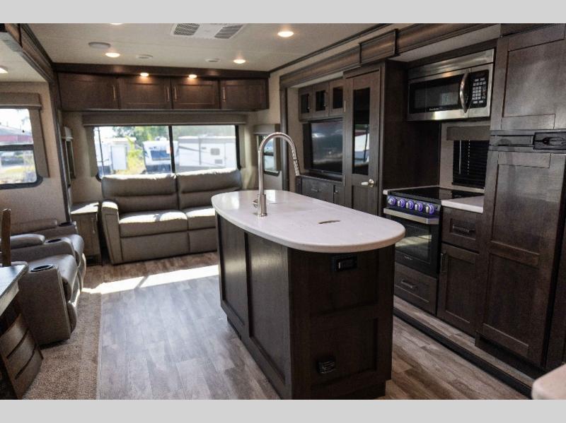 You won't want to camp any other way once you step inside this travel trailer! You can relax in true comfort each night on either the rear tri-fold sofa or the theater seating which is directly across from the entertainment center with a 40" HDTV and fireplace. You can prepare delicious home cooked meals in the gourmet kitchen with the three burner cooktop and the kitchen island, plus there is a 12 cu. ft. refrigerator to store any leftovers and a hutch to store your nice dishes. You can even choose to add the optional free standing dinette with ottoman storage to enjoy your meals at. Start each morning feeling squeaky clean after showering in the 30" x 36" shower with a skylight above for added natural lighting!