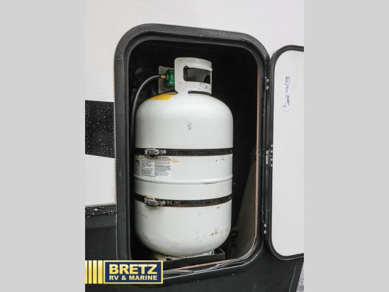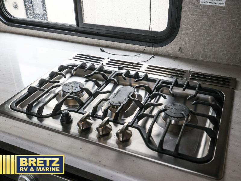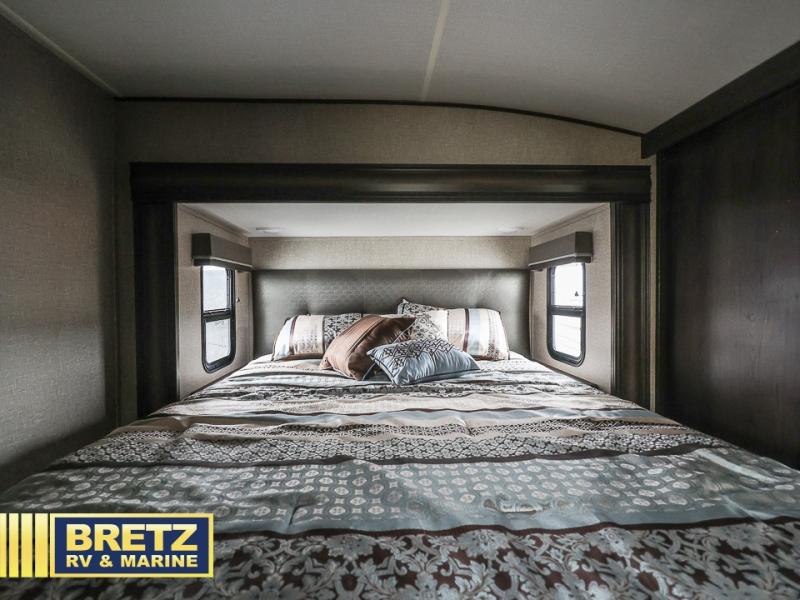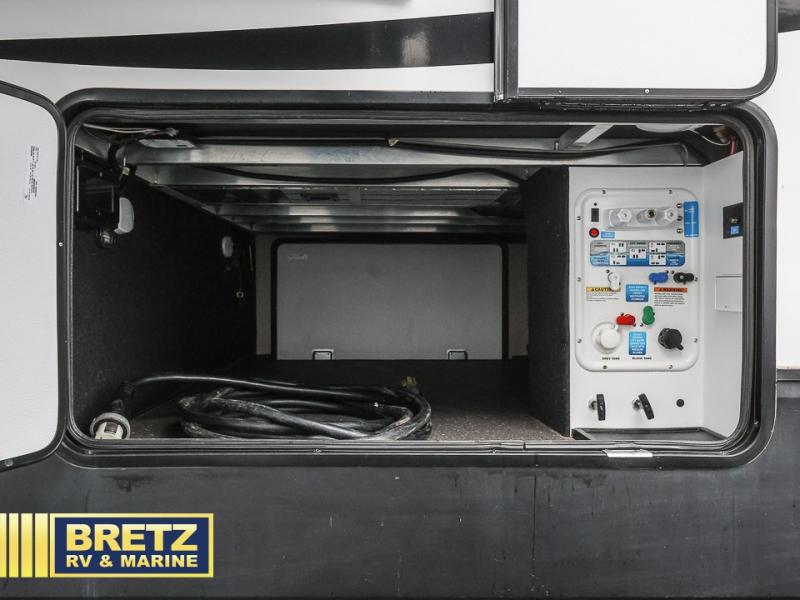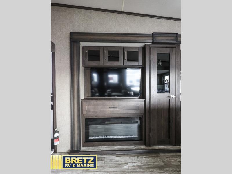 You won't believe all that this fifth wheel has to offer! From the rear desk with overhead cabinets for you to get some work done while you're away to the front private bedroom with a queen bed, which can be switched for the optional king bed, and a full wall wardrobe that is prepped to add the optional washer and dryer. The kitchen island will make your meal prepping easier and if you choose to add the optional free standing dinette then it will come with ottoman storage to keep your games. The living area is a comfortable place to wind down your nights with the tri-fold sofa that has a hutch behind it and the theater seating directly across from the entertainment center with the 40" HDTV and fireplace below. The exterior is decked out in features you will love like the outside kitchen with a two burner cooktop, two power awnings, an outside entertainment center with a LED TV, a spray port, an all-in-one docking station, and an unobstructed pass-through storage area!