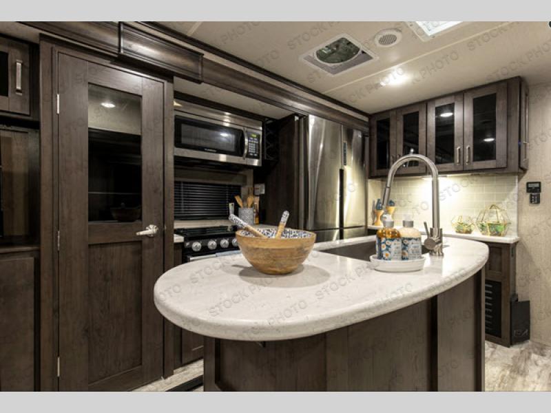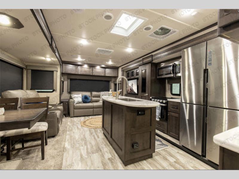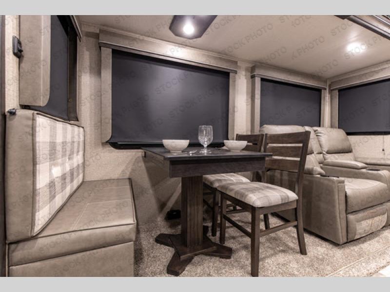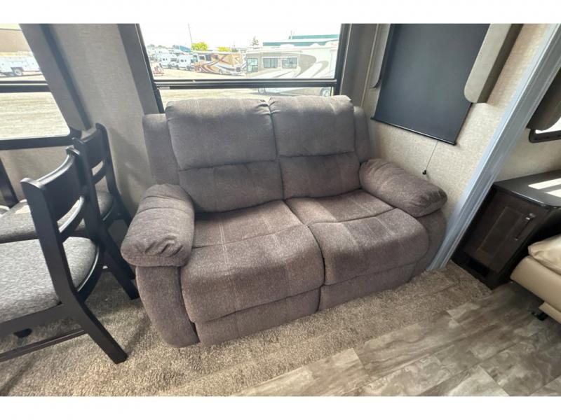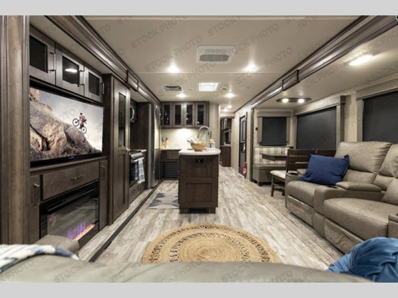 You won't want to camp any other way once you step inside this travel trailer! You can relax in true comfort each night on either the rear tri-fold sofa or the theater seating which is directly across from the entertainment center with a 40" HDTV and fireplace. You can prepare delicious home cooked meals in the gourmet kitchen with the three burner cooktop and the kitchen island, plus there is a 12 cu. ft. refrigerator to store any leftovers and a hutch to store your nice dishes. You can even choose to add the optional free standing dinette with ottoman storage to enjoy your meals at. Start each morning feeling squeaky clean after showering in the 30" x 36" shower with a skylight above for added natural lighting!