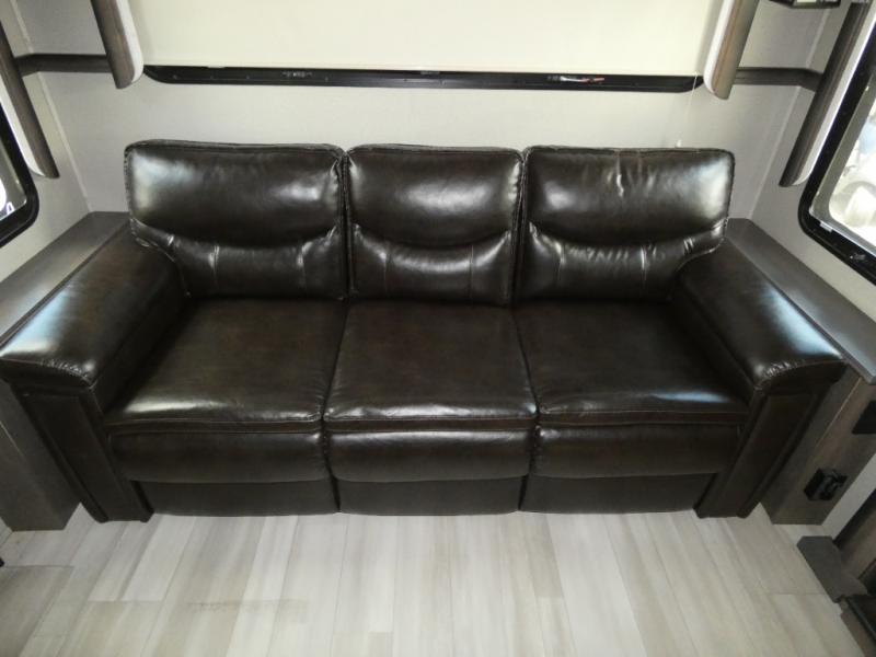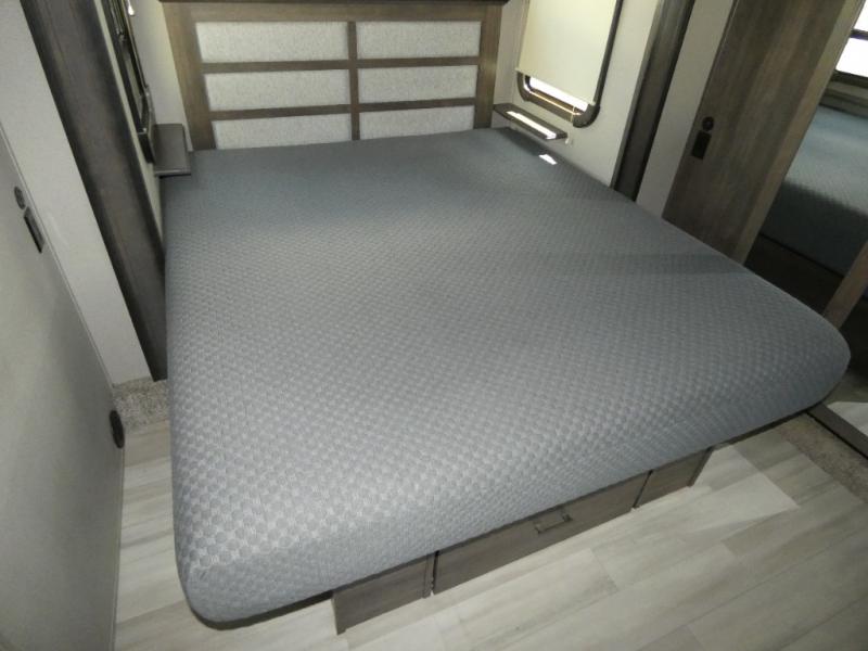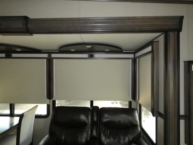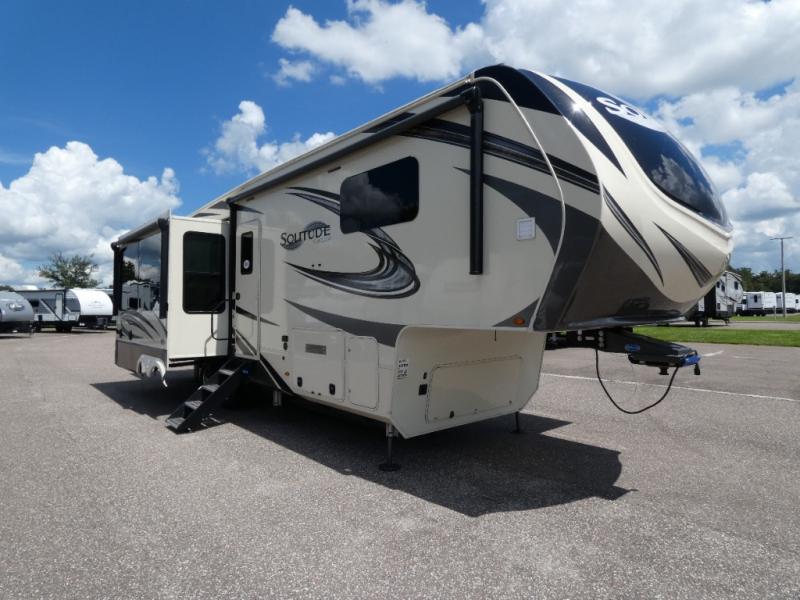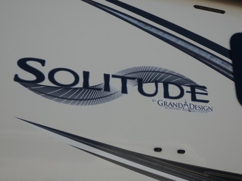 With each Solitude fifth wheel by Grand Design, you will have an exclusive superchassis, a wide rail design on heavy duty l-beam main rails providing a more stable jack stance, and maximum insulation from the thermal roof design and the exclusive full laminated walls to the insulated gooseneck and baggage doors. More features offered to help with traveling include the MORryde rubber pin box, the Tire Linc TPMS system, and the 6-point hydraulic system. And the 40,000 BTU of heating power, the heated underbelly and heated storage bay, the Evenflow heating system, and the Stealth A/C system with racetrack ducting, allow you to camp all year long! You will also find maximum storage solutions, residential features and so much more!