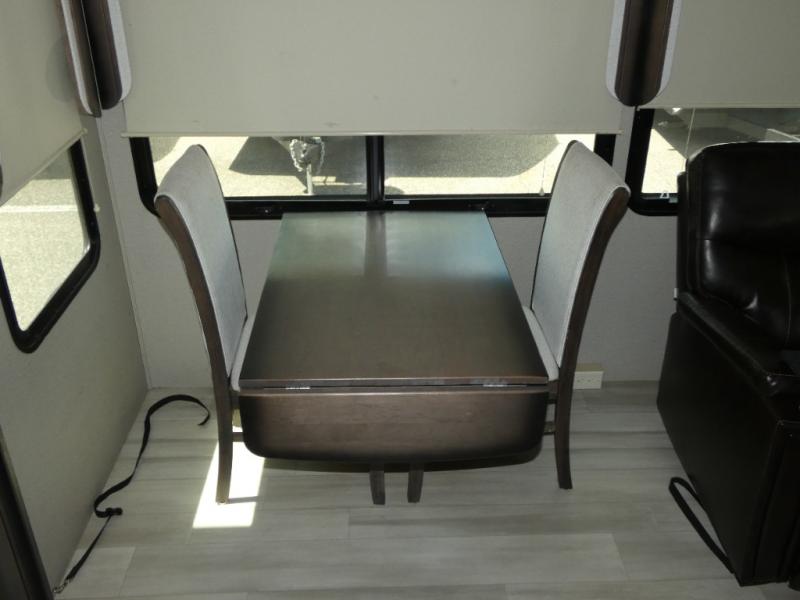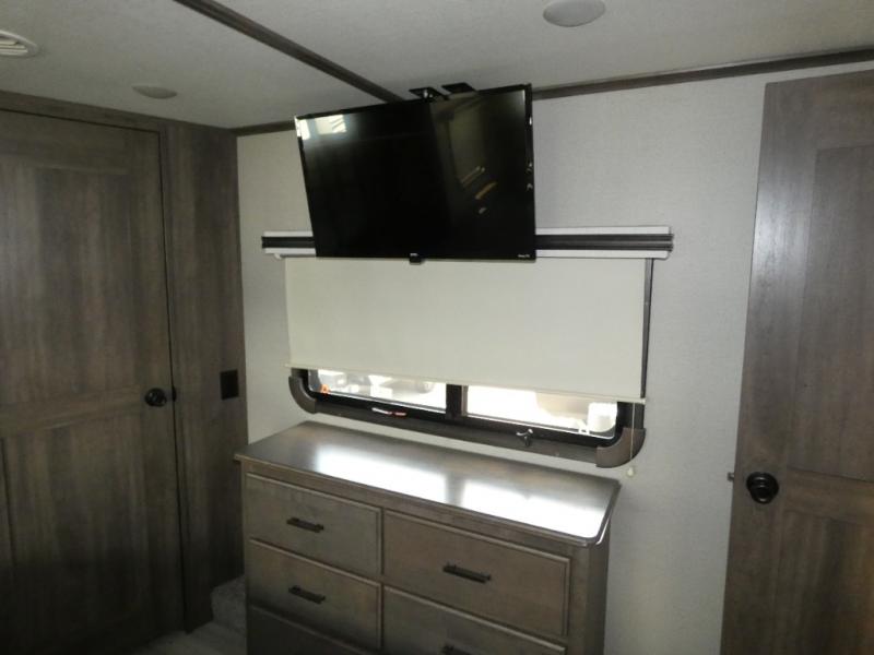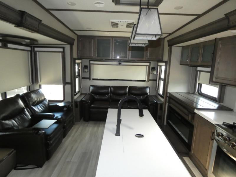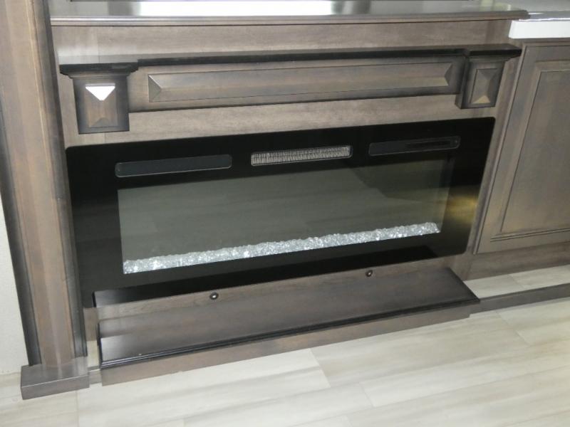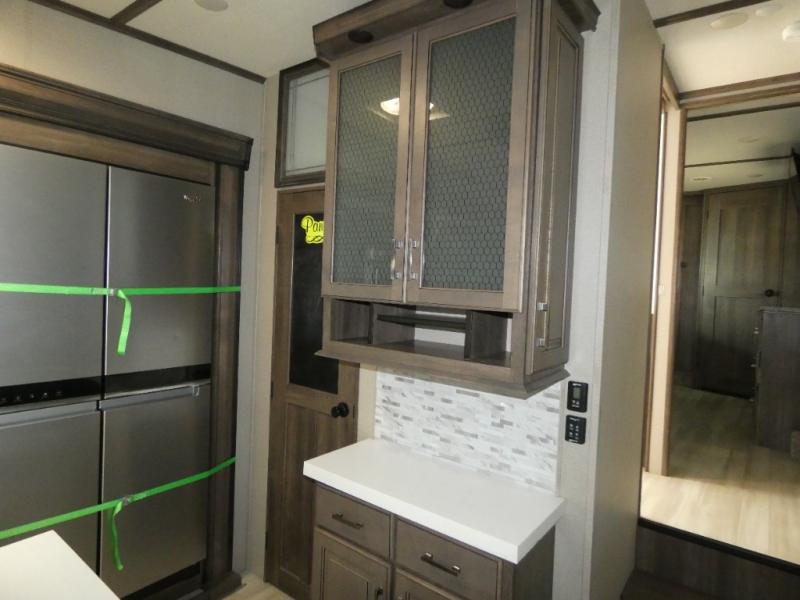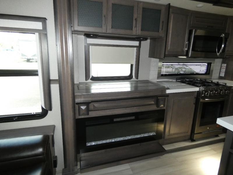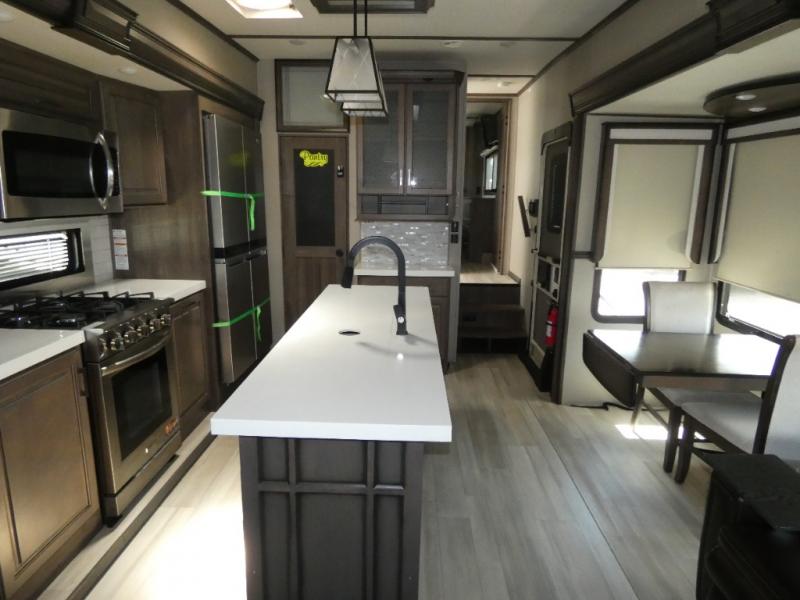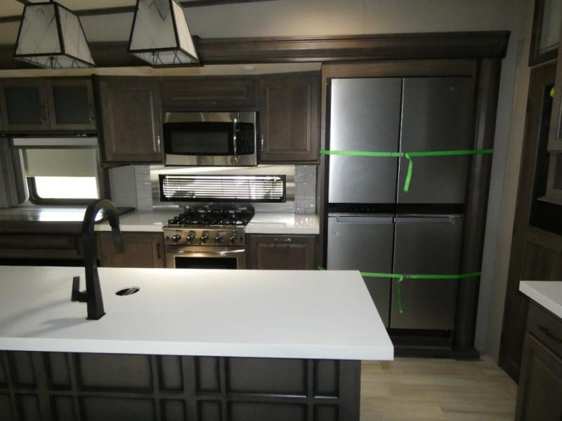 If you are on the search for a livable fifth wheel for those month-long trips, this Solitude might be the one! Just imagine cooking on a professional-grade stainless steel cooktop and inside a built-in oven or microwave. The cook can prepare the meals on the kitchen island and store leftovers in the stainless steel 18 cu. ft. four-door refrigerator. When you and your spouse aren't outside, the LED Smart TV in the living area can keep you entertained while staying warm by the fireplace. There is plenty of storage throughout for your shoes under the steps, dry goods in the large pantry with shelves, linens, and your wardrobe in the front bedroom with a rod and shelving. You might even like to choose a few options such as adding a stackable washer and dryer, a dishwasher, a king-size bed, or even a pull-out kitchen outside.