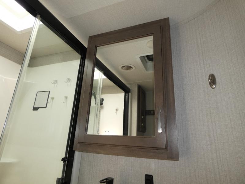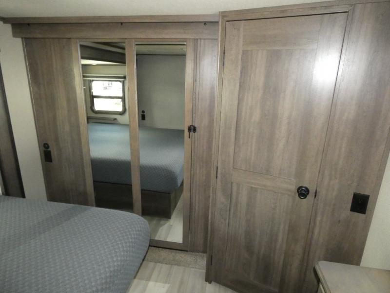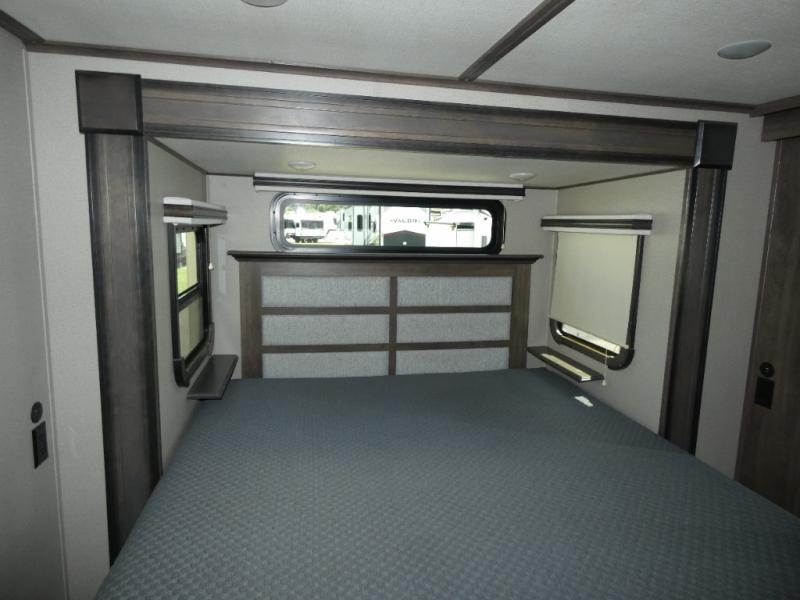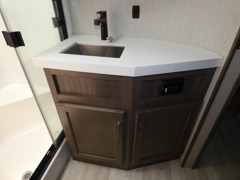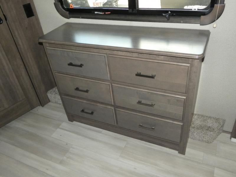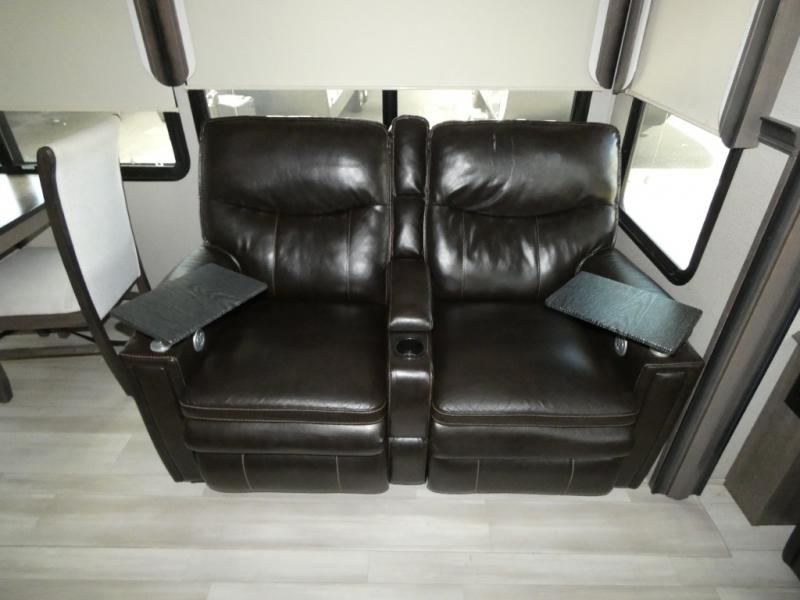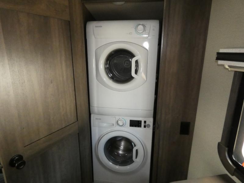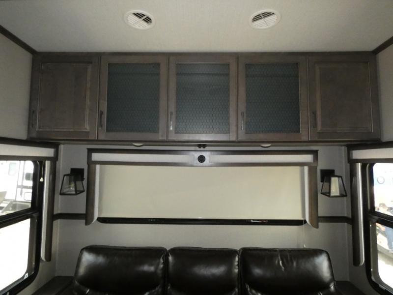 If you are on the search for a livable fifth wheel for those month-long trips, this Solitude might be the one! Just imagine cooking on a professional-grade stainless steel cooktop and inside a built-in oven or microwave. The cook can prepare the meals on the kitchen island and store leftovers in the stainless steel 18 cu. ft. four-door refrigerator. When you and your spouse aren't outside, the LED Smart TV in the living area can keep you entertained while staying warm by the fireplace. There is plenty of storage throughout for your shoes under the steps, dry goods in the large pantry with shelves, linens, and your wardrobe in the front bedroom with a rod and shelving. You might even like to choose a few options such as adding a stackable washer and dryer, a dishwasher, a king-size bed, or even a pull-out kitchen outside.